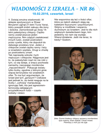 WIADOMOŚCI Z IZRAELA - NR 86 18.02.2016, czwartek, Izrael 1. Dzisiaj smutna wiadomość. W sklepie spożywczym w Shaar Binyamin zginął 21-letni Tuvia Yanai, który poszedł zrobić zakupy dla żony i dziecka. Zamordowali go dwaj 14letni palestyńscy chłopcy. Ciężko ranny został jeszcze jeden mężczyzna. Nim zdążyli zaatakować innych ludzi, zostali postrzeleni przez cywila, który nie dopuścił do dalszego przelewu krwi. Jeden z chłopców został ciężko ranny i leży w izraelskim szpitalu. Drugi w chwilę po postrzeleniu zmarł. Tak naprawdę szkoda i tych mężczyzn i chłopców. Najgorsze jest to, że palestyński rząd nic nie robi z tym, co się dzieje, a wręcz pochwala zamachy, nazywając morderców „męczennikami”. Pokazuje światu tylko liczby, zgodnie z którymi ginie więcej terrorystów niż izraelskich ofiar. To ma być argumentem, że Izrael jest tym „gorszym”! Ciekawe jest jednak to, że świat reaguje na te liczby i „cyfrową” manipulację, ignorując fakt, kto jest agresoremterrorystą zabijającym przypadkowych ludzi – często kobiety i dzieci. Nie wspomina się też o ilości ofiar, które po takich atakach stają się kalekami fizycznymi i psychicznymi. Stójmy w modlitwie i wsparciu duchowym za Izraelem. Jest to dla nich większym świadectwem tego, kim jesteśmy niż nam się wydaje. Wiara=działanie. Jeśli nie teraz, to kiedy? Szalom. (foto: Dumni Arabscy chłopcy sprawcy morderstwa ojca rodziny, Iham Sabah i Omar Imawi. Pierwszy z nich już nie żyje 3. Danny Danon, izraelski ambasador w ONZ, zwrócił się do Ban Ki Moona z żądaniem potępienia słów Hasana Nasrallaha (szefa Hezbollahu), który grozi Haifie „bombą atomową”. *Izrael wreszcie zmienił taktykę z (Foto: człowiek, który dzięki temu że miał przy sobie broń, zapobiegł następnym ofiarom) 2. Rodziny ofiar terroru ostatnich miesięcy i przedstawiciele organizacji „Jedna rodzina” spotkali się z premierem Netanjahu i zażądali od niego podjęcia kroków przeciwko rodzinom terrorystów. Taama Jakobson, siostra Eitama Henkina (rodzina Henkin to pierwsze ofiary trwającego od kilku miesięcy terroru), powiedziała: „Przyszliśmy dzisiaj, bo nie można siedzieć i czekać na następny mord. Trzeba i można położyć temu kres. Terroryści działają przy poparciu swoich rodzin ispołeczności – chłopiec bierze nóż z kuchni swojej matki i idzie na pobliską ulicę zaatakować dziecko z powodu poczucia misji i zachęty społecznej. Naszą prośbą do ciebie jest przywrócenie nam podstawowego bezpieczeństwa”. bardzo delikatnej, bo wcześniej żądał potępienia tylko za jakieś wielkie przestępstwa. Teraz, podobnie jak Arabowie, zaczyna żądać potępienia i zajęcia stanowiska nawet przy groźbach. Niech w końcu ONZ się obudzi i przestanie we wszystkim widzieć tylko winę Izraela. 4. Dzisiaj w nocy na terenach Judei i Samarii siły bezpieczeństwa aresztowały ośmiu poszukiwanych Arabów. *Często nie wiemy nawet, ile udaremnień ataków powodują takie zatrzymania. Dzięki Bogu! GAZA 5. W wyniku zatrzymania i kontroli statku na wodach Morza Czerwonego koło Ejlatu, izraelscy komandosi z Szajelet 13 przejęli irański transport rakiet przeznaczonych do przerzutu do Strefy Gazy! *Dzięki Bogu, mieszkańcy przy granicy z Gazą mogą być spokojniejsi. *Jak widać, Iran nie zaprzestał sponsorowania terroryzmu na świecie. (Foto: Przejęty statek) „I wszystko, o cokolwiek byście prosili w modlitwie z wiarą, otrzymacie”. Mat. 21,22 Wiadomości oraz zdjęcia zebrał Jarosław Papiór Korekta oraz opracowanie graficzne Stowarzyszenie Służba Szalom w Oświęcimiu