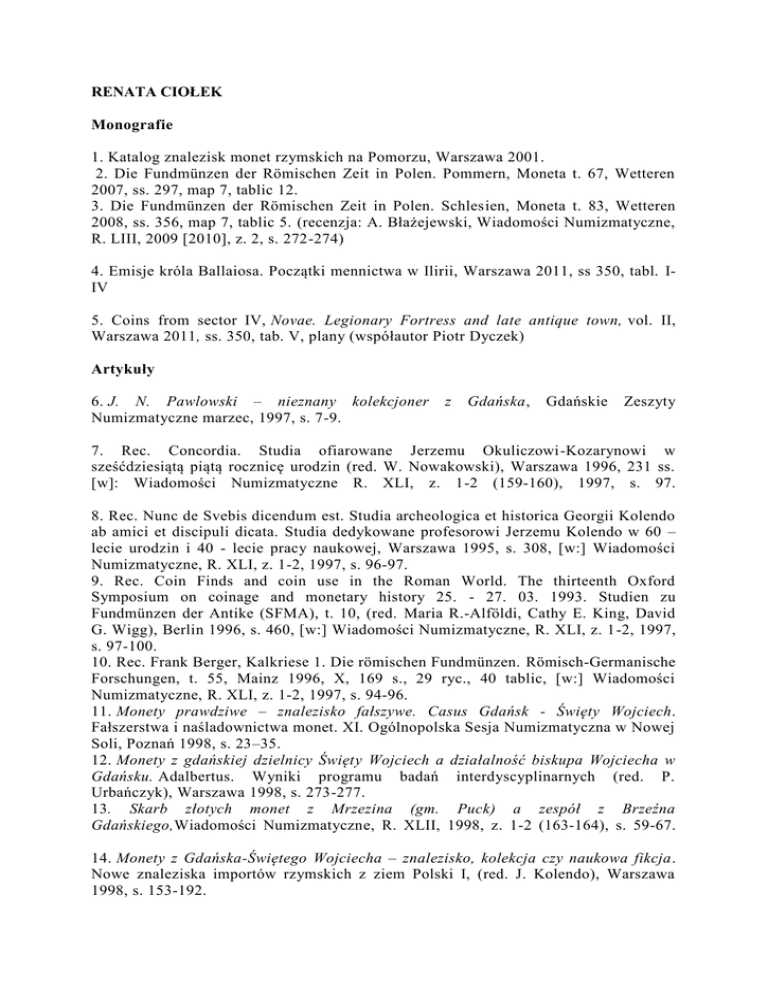 RENATA CIOŁEK Monografie 1. Katalog znalezisk monet rzymskich na Pomorzu, Warszawa 2001. 2. Die Fundmünzen der Römischen Zeit in Polen. Pommern, Moneta t. 67, Wetteren 2007, ss. 297, map 7, tablic 12. 3. Die Fundmünzen der Römischen Zeit in Polen. Schlesien, Moneta t. 83, Wetteren 2008, ss. 356, map 7, tablic 5. (recenzja: A. Błażejewski, Wiadomości Numizmatyczne, R. LIII, 2009 [2010], z. 2, s. 272-274) 4. Emisje króla Ballaiosa. Początki mennictwa w Ilirii, Warszawa 2011, ss 350, tabl. IIV 5. Coins from sector IV, Novae. Legionary Fortress and late antique town, vol. II, Warszawa 2011, ss. 350, tab. V, plany (współautor Piotr Dyczek) Artykuły 6. J. N. Pawlowski – nieznany kolekcjoner Numizmatyczne marzec, 1997, s. 7-9. z Gdańska, Gdańskie Zeszyty 7. Rec. Concordia. Studia ofiarowane Jerzemu Okuliczowi-Kozarynowi w sześćdziesiątą piątą rocznicę urodzin (red. W. Nowakowski), Warszawa 1996, 231 ss. [w]: Wiadomości Numizmatyczne R. XLI, z. 1-2 (159-160), 1997, s. 97. 8. Rec. Nunc de Svebis dicendum est. Studia archeologica et historica Georgii Kolendo ab amici et discipuli dicata. Studia dedykowane profesorowi Jerzemu Kolendo w 60 – lecie urodzin i 40 - lecie pracy naukowej, Warszawa 1995, s. 308, [w:] Wiadomości Numizmatyczne, R. XLI, z. 1-2, 1997, s. 96-97. 9. Rec. Coin Finds and coin use in the Roman World. The thirteenth Oxford Symposium on coinage and monetary history 25. - 27. 03. 1993. Studien zu Fundmünzen der Antike (SFMA), t. 10, (red. Maria R.-Alföldi, Cathy E. King, David G. Wigg), Berlin 1996, s. 460, [w:] Wiadomości Numizmatyczne, R. XLI, z. 1-2, 1997, s. 97-100. 10. Rec. Frank Berger, Kalkriese 1. Die römischen Fundmünzen. Römisch-Germanische Forschungen, t. 55, Mainz 1996, X, 169 s., 29 ryc., 40 tablic, [w:] Wiadomości Numizmatyczne, R. XLI, z. 1-2, 1997, s. 94-96. 11. Monety prawdziwe – znalezisko fałszywe. Casus Gdańsk - Święty Wojciech. Fałszerstwa i naśladownictwa monet. XI. Ogólnopolska Sesja Numizmatyczna w Nowej Soli, Poznań 1998, s. 23–35. 12. Monety z gdańskiej dzielnicy Święty Wojciech a działalność biskupa Wojciecha w Gdańsku. Adalbertus. Wyniki programu badań interdyscyplinarnych (red. P. Urbańczyk), Warszawa 1998, s. 273-277. 13. Skarb złotych monet z Mrzezina (gm. Puck) a zespół z Brzeźna Gdańskiego,Wiadomości Numizmatyczne, R. XLII, 1998, z. 1-2 (163-164), s. 59-67. 14. Monety z Gdańska-Świętego Wojciecha – znalezisko, kolekcja czy naukowa fikcja. Nowe znaleziska importów rzymskich z ziem Polski I, (red. J. Kolendo), Warszawa 1998, s. 153-192. 15. Die Münzen von Danzig-St. Albrecht – Einzelfunde, Sammlung oder wissenschaftliche Fiktion. Proceedings of the XIIth International Numismatic Congress 1997, Berlin 1999, red. B. Kluge, B. Weisser, s. 8-14. 16. Znaleziska monet rzymskich z terenów Pomorza przechowywane w zbiorach Muzeum Kulturalno-Historycznego w Stralsundzie, Wiadomości Numizmatyczne, R. XLIII, z. 1-2 (167-168), 1999, s. 169-186. 17. Złote skarby w basenie Morza Bałtyckiego w okresie późnego antyku , Z Otchłani Wieków, z. 3, 1999, s. 37-40. 18. Rec. Jerzy Kolendo, Świat antyczny i Barbarzyńcy. Teksty, zabytki, refleksja nad przeszłością, (Instytut Archeologii Uniwersytetu Warszawskiego, Seria podręczników) t. 2, Warszawa 1998, 187 ss. [w:] Wiadomości Numizmatyczne, R. XLIV, z. 1 -2, 2000, s. 94-96. 19. Bibliografia do artykułu A. Kunisza „Numizmatyka Cesarstwa Rzymskiego”, [w:] E. Wipszycka [red.], Vademecum Historyka Starożytnej Grecji i Rzymu, Warszawa 2001, s. 356-363. 20. Znaleziska monet rzymskich ze zbiorów Muzeum Okręgowego im. L. Wyczółkowskiego w Bydgoszczy, [w:] A. Bursche, J. Kolendo [red.], Nowe znaleziska importów rzymskich z ziem Polski II, Warszawa 2001, s. 125-135. 21. Chronologie des Zuflusses von römischen Münzen zur südlichen Ostseeküsten , Proceedings of the International Numismatic Congress in Croatia, red. J. Dobrinić, Pula, 2001, s. 45. 22. Rec. R. Wolters, Numi Signati. Untersuchungen zur römischen Münzprägung und Geldwirtschaft, München 1999, 475 ss., 159 il., 13 tabl. (Vestiga, t. 49), WN XLX/, 2, (170), 2001, (wyd. 2002), s. 215-217. 23. Rec. Rzym antyczny. Polityka i pieniądz II (red. A. Kunisz), Prace Naukowe Uniwersytetu Śląskiego nr 1614, Katowice 1997, 170 ss., WN XLX/2 (170), 2001, (wyd. 2002), s. 217-218. 24. Rec. J. Wiercińska, Coins the Roman Republic of National Museum in Warsaw, WN XLX, z. 2 (172), 2001, (wyd. 2002), s. 218-219. 25. Znaleziska monet rzymskich na tle osadnictwa Pomorza w okresie wpływów rzymskich i Wędrówek Ludów, Światowit, 2001, XLIV (III), fasc. B, s. 11-15. 26. Die römischen Münzfunde aus Nordpolen in Berliner Archivalien, [w:] W. Nowakowski, M. Lemke (red.), Auf der Suche nach der verlorenen Archäologie, Warszawa 2003, s. 37-42. 27. Znaleziska solidów na Pomorzu, Wiadomości Numizmatyczne t. XLVII, 2003, s. 163-180. 28. Die römischen Münzfunde in Pommern, Polish (Wiadomości Numizmatyczne t. XLVII), 2003, s. 25-39 Numismatic News, VII, 29. Wstęp, [w:] A. Bursche, R. Ciołek (red.), Antyk i barbarzyńcy. Księga dedykowana Profesorowi Jerzemu Kolendo, Warszawa 2003, s. 5-10 (z A. Bursche). 30. Rec. Piotr Kaczanowski, Urszula Margos, Tabula Imperii Romani M 34 – Kraków, Kraków 2002, tom I katalog, tom II mapy, 596 ss., 11 map, Wiadomości Numizmatyczne t. XLVII, 2003, s. 221-222. 31. Jubileusz Profesora Jerzego Kolendo, Wiadomości Numizmatyczne t. XLVIII, 2004, s. 121-123. 32. Występowanie monet rzymskich na terenach zajmowanych przez ludność grupy dębczyńskiej, [w:] G. Horoszko (red.), Najnowsze badania nad numizmatyką i sfragistyką Pomorza Zachodniego. Materiały z konferencji naukowej 50 lat Działu Numizmatycznego Muzeum Narodowego w Szczecinie 19-20 września 2002 r., Szczecin 2004, s. 37-52. 33. Rec. Rudolf Laser, Karlhorst Stribrny, Die Fundmünzen der Römischen Zeit in Deutschland, Abteilung X Sachsen Anhalt, Abteilung XIII Thüringen, Mainz am Rhein 20
