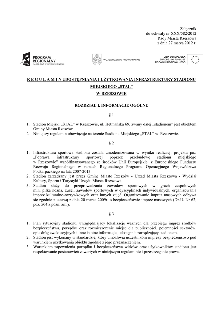 Załącznik do uchwały nr XXX/582/2012 Rady Miasta Rzeszowa z dnia 27 marca 2012 r. WOJEWÓDZTWO PODKARPACKIE UNIA EUROPEJSKA EUROPEJSKI FUNDUSZ ROZWOJU REGIONALNEGO R E G U L A M I N UDOSTĘPNIANIA I UŻYTKOWANIA INFRASTRUKTURY STADIONU MIEJSKIEGO „STAL” W RZESZOWIE ROZDZIAŁ I. INFORMACJE OGÓLNE §1 1. Stadion Miejski „STAL” w Rzeszowie, ul. Hetmańska 69, zwany dalej „stadionem” jest obiektem Gminy Miasta Rzeszów. 2. Niniejszy regulamin obowiązuje na terenie Stadionu Miejskiego „STAL” w Rzeszowie. §2 1. Infrastruktura sportowa stadionu została zmodernizowana w wyniku realizacji projektu pn.: „Poprawa infrastruktury sportowej poprzez przebudowę stadionu miejskiego w Rzeszowie” współfinansowanego ze środków Unii Europejskiej z Europejskiego Funduszu Rozwoju Regionalnego w ramach Regionalnego Programu Operacyjnego Województwa Podkarpackiego na lata 2007-2013. 2. Stadion zarządzany jest przez Gminę Miasto Rzeszów - Urząd Miasta Rzeszowa - Wydział Kultury, Sportu i Turystyki Urzędu Miasta Rzeszowa. 3. Stadion służy do przeprowadzania zawodów sportowych w grach zespołowych min. piłka nożna, żużel, zawodów sportowych w dyscyplinach indywidualnych, organizowania imprez kulturalno-rozrywkowych oraz innych zajęć. Organizowanie imprez masowych odbywa się zgodnie z ustawą z dnia 20 marca 2009r. o bezpieczeństwie imprez masowych (Dz.U. Nr 62, poz. 504 z późn. zm.). §3 1. Plan sytuacyjny stadionu, uwzględniający lokalizację ważnych dla przebiegu imprez środków bezpieczeństwa, porządku oraz rozmieszczenie miejsc dla publiczności, pojemności sektorów, opis dróg ewakuacyjnych i inne istotne informacje, udostępnia zarządzający stadionem. 2. Stadion jest wykonany w standardzie, który umożliwia uczestnikom imprezy bezpieczeństwo pod warunkiem użytkowania obiektu zgodnie z jego przeznaczeniem. 3. Warunkiem zapewnienia porządku i bezpieczeństwa widzów oraz użytkowników stadionu jest respektowanie postanowień zawartych w niniejszym regulaminie i przestrzeganie prawa. ROZDZIAŁ II. ZASADY UDOSTĘPNIANIA INFRASTRUKTURY STADIONU MIEJSKIEGO „STAL” W RZESZOWIE ZAINTERESOWANYM PODMIOTOM §4 1. Stadion jest udostępniany na podstawie umowy najmu, w drodze przetargu nieograniczonego, zgodnie z obowiązującymi zasadami określonymi niniejszym regulaminem. 2. Zawarcie umowy na udostępnienie stadionu na organizację imprezy następuje po zaakceptowania regulaminu. 3. Podlegające wynajęciu składniki infrastruktury stadionowej wskazane zostaną każdorazowo w ogłoszeniu o przetargu na wynajęcie stadionu. 4. Pierwszeństwo w korzystaniu z obiektu przysługuje organizatorom imprez sportowych, w następnej kolejności organizatorom pozostałych imprez. 5. Poszczególne terminy najmu obiektu przypadać mogą nie później niż w terminie 12 miesięcy od ogłoszenia przetargu na wynajem. 6. Okres korzystania ze stadionu nie może być jednorazowo krótszy niż 1 dzień kalendarzowy i dłuższy niż 5 dni kalendarzowych. 7. Organizatorzy imprez ubiegać się mogą o najem stadionu w poszczególnych terminach (datach) przypadających w danym miesiącu, kwartale bądź roku. 8. Wydział Kultury, Sportu i Turystyki Urzędu Miasta Rzeszowa opracowuje i udostępnia grafik korzystania ze stadionu. 9. Do dnia 31 grudnia każdego roku ogłoszona zostanie minimalna stawka obowiązująca za najem stadionu w roku następnym. 10. Minimalna stawka obowiązująca za najem stadionu ustalona zostanie przez Prezydenta Miasta Rzeszowa. 11. W przypadku zbiegu równorzędnych wniosków przynajmniej dwóch podmiotów ubiegających się o najem stadionu w tym samym terminie zorganizowana zostanie licytacja w celu wyłonienia najemcy. Stawką wyjściową w przypadku konieczności przeprowadzenia licytacji będzie minimalna stawka obowiązująca za najem stadionu. O terminie licytacji ubiegający się o najem stadionu uprzedzeni zostaną za pośrednictwem faksu bądź poczty elektronicznej nie później niż na 3 dni przed jej przeprowadzeniem. 12. Przez równorzędne wnioski rozumie się wnioski podmiotów chcących zorganizować imprezę o podobnym profilu oraz z tą samą stawką czynszu najmu. 13. Gmina Miasto Rzeszów zastrzega sobie prawo do rezerwacji stadionu na potrzeby realizacji zadań własnych oraz zadań jednostek i instytucji podległych z pominięciem procedury przetargowej. §5 1. Przetarg nieograniczony na najem stadionu ogłaszany jest przez Prezydenta Miasta Rzeszowa. 2. Ogłoszenie o naborze wniosków na najem obiektu zamieszczane jest każdorazowo w prasie krajowej, lokalnej, na stronie internetowej Urzędu Miasta Rzeszowa (Biuletyn Informacji Publicznej), na stronie internetowej Stadionu Miejskiego „STAL” w Rzeszowie oraz w siedzibie Urzędu Miasta Rzeszowa. 3. Wyboru ofert dokonuje Komisja powołana przez Prezydenta Miasta Rzeszowa. 4. Protokół wyboru ofert przez Komisję jest podstawą zawarcia umowy najmu stadionu. 5. Wynajęcie stadionu następuje na podstawie umowy zawieranej pomiędzy organizatorem imprezy a Gminą Miastem Rzeszów. 6. Najemca nie ma prawa podnajmowania stadionu innym podmiotom bez zgody Gminy Miasta Rzeszów. 7. Zawarcie umowy najmu stadionu zostaje niezwłocznie odnotowane w grafiku korzystania ze stadionu. 8. Wydział Kultury, Sportu i Turystyki Urzędu Miasta Rzeszowa prowadzi rejestr imprez organizowanych na terenie stadionu. 9. Dopuszcza się możliwość przeprowadzenia więcej niż jednego przetargu na wynajem stadionu w ciągu roku w przypadku wpłynięcia wniosku o wynajęcie stadionu w terminie nieujętym w grafiku korzystania ze stadionu. 10. Wniosek o wynajęcie stadionu złożony musi zostać co najmniej na 21 dni przed planowanym terminem jego wynajęcia z zastrzeżeniem § 4 ust. 11 niniejszego regulaminu. ROZDZIAŁ III. ZASADY ORGANIZACYJNE I PORZĄDKOWE OBOWIĄZYJĄCE NA STADIONIE MIEJSKIM „STAL” W RESZOWIE §6 1. Podstawą wstępu i pobytu uczestników zajęć lub imprez na stadionie je