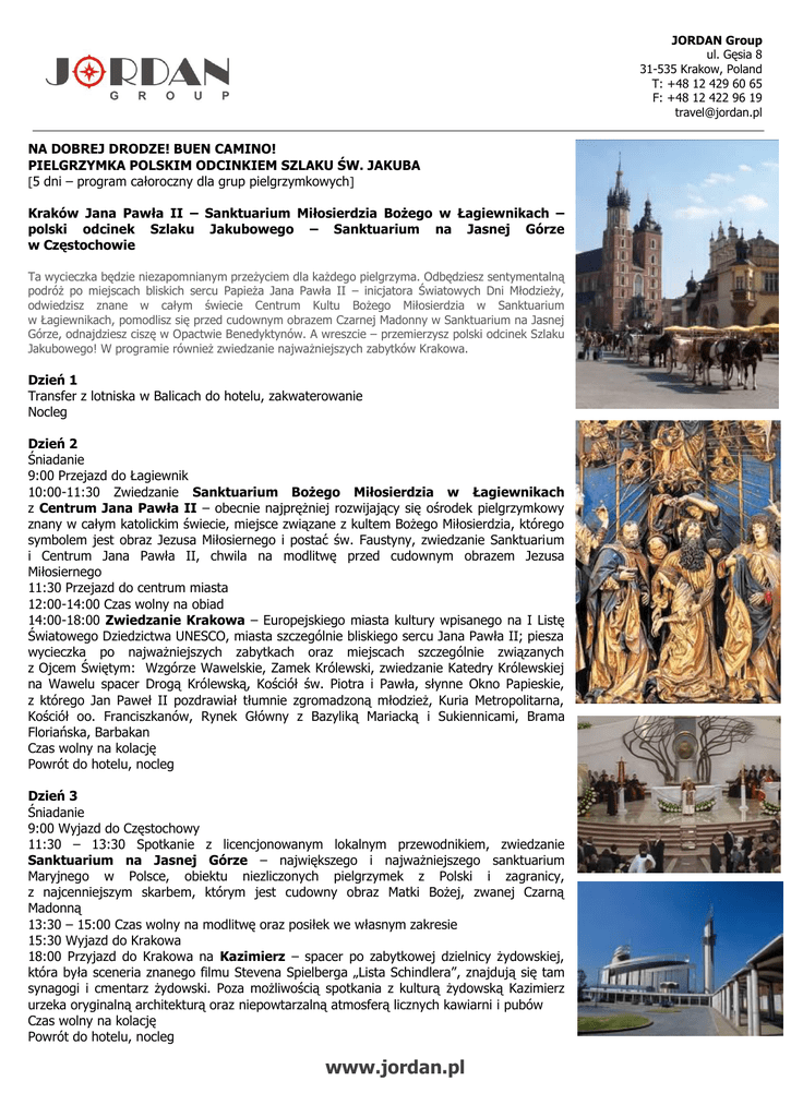 JORDAN Group ul. Gęsia 8 31-535 Krakow, Poland T: +48 12 429 60 65 F: +48 12 422 96 19 [email protected] NA DOBREJ DRODZE! BUEN CAMINO! PIELGRZYMKA POLSKIM ODCINKIEM SZLAKU ŚW. JAKUBA [5 dni – program całoroczny dla grup pielgrzymkowych] Kraków Jana Pawła II – Sanktuarium Miłosierdzia Bożego w Łagiewnikach – polski odcinek Szlaku Jakubowego – Sanktuarium na Jasnej Górze w Częstochowie Ta wycieczka będzie niezapomnianym przeżyciem dla każdego pielgrzyma. Odbędziesz sentymentalną podróż po miejscach bliskich sercu Papieża Jana Pawła II – inicjatora Światowych Dni Młodzieży, odwiedzisz znane w całym świecie Centrum Kultu Bożego Miłosierdzia w Sanktuarium w Łagiewnikach, pomodlisz się przed cudownym obrazem Czarnej Madonny w Sanktuarium na Jasnej Górze, odnajdziesz ciszę w Opactwie Benedyktynów. A wreszcie – przemierzysz polski odcinek Szlaku Jakubowego! W programie również zwiedzanie najważniejszych zabytków Krakowa. Dzień 1 Transfer z lotniska w Balicach do hotelu, zakwaterowanie Nocleg Dzień 2 Śniadanie 9:00 Przejazd do Łagiewnik 10:00-11:30 Zwiedzanie Sanktuarium Bożego Miłosierdzia w Łagiewnikach z Centrum Jana Pawła II – obecnie najprężniej rozwijający się ośrodek pielgrzymkowy znany w całym katolickim świecie, miejsce związane z kultem Bożego Miłosierdzia, którego symbolem jest obraz Jezusa Miłosiernego i postać św. Faustyny, zwiedzanie Sanktuarium i Centrum Jana Pawła II, chwila na modlitwę przed cudownym obrazem Jezusa Miłosiernego 11:30 Przejazd do centrum miasta 12:00-14:00 Czas wolny na obiad 14:00-18:00 Zwiedzanie Krakowa – Europejskiego miasta kultury wpisanego na I Listę Światowego Dziedzictwa UNESCO, miasta szczególnie bliskiego sercu Jana Pawła II; piesza wycieczka po najważniejszych zabytkach oraz miejscach szczególnie związanych z Ojcem Świętym: Wzgórze Wawelskie, Zamek Królewski, zwiedzanie Katedry Królewskiej na Wawelu spacer Drogą Królewską, Kościół św. Piotra i Pawła, słynne Okno Papieskie, z którego Jan Paweł II pozdrawiał tłumnie zgromadzoną młodzież, Kuria Metropolitarna, Kościół oo. Franciszkanów, Rynek Główny z Bazyliką Mariacką i Sukiennicami, Brama Floriańska, Barbakan Czas wolny na kolację Powrót do hotelu, nocleg Dzień 3 Śniadanie 9:00 Wyjazd do Częstochowy 11:30 – 13:30 Spotkanie z licencjonowanym lokalnym przewodnikiem, zwiedzanie Sanktuarium na Jasnej Górze – największego i najważniejszego sanktuarium Maryjnego w Polsce, obiektu niezliczonych pielgrzymek z Polski i zagranicy, z najcenniejszym skarbem, którym jest cudowny obraz Matki Bożej, zwanej Czarną Madonną 13:30 – 15:00 Czas wolny na modlitwę oraz posiłek we własnym zakresie 15:30 Wyjazd do Krakowa 18:00 Przyjazd do Krakowa na Kazimierz – spacer po zabytkowej dzielnicy żydowskiej, która była sceneria znanego filmu Stevena Spielberga „Lista Schindlera”, znajdują się tam synagogi i cmentarz żydowski. Poza możliwością spotkania z kulturą żydowską Kazimierz urzeka oryginalną architekturą oraz niepowtarzalną atmosferą licznych kawiarni i pubów Czas wolny na kolację Powrót do hotelu, nocleg www.jordan.pl JORDAN Group ul. Gęsia 8 31-535 Krakow, Poland T: +48 12 429 60 65 F: +48 12 422 96 19 [email protected] Dzień 4 Śniadanie 9:00 Wyjazd autokarem na Szlak Jakubowy Trasa wiedzie z Krakowa do Sandomierza wzdłuż Małopolskiego Szlaku św. Jakuba będącego częścią Europejskiego Szlaku Kulturowego (na liście UNESCO od 1993), wiodącego do grobu św. Jakuba Apostoła w Santiago de Compostela! Pielgrzymki z Polski trwały przez całe średniowiecze, do końca XVII wieku, szlak pątniczy został odtworzony i oficjalnie otwarty na nowo w 2009 roku. Zwiedzanie pięknych kościołów p.w. św. Jakuba Starszego znajdujących się w miejscowościach: Więcławice Stare (z XVIII-wiecznym kościołem - ciekawym przykład architektury drewnianej - Kotuszów (z barokową świątynią) – Szczaworyż (późnorenesansowy kościół z cudownym obrazem Matki Bożej z Dzieciątkiem) – Pałecznica oraz Sandomierz – ulubione miasto królów i książąt polskich, położone malowniczo na siedmiu nadwiślańskich wzgórzach, wyróżniające się niezwykłym historycznym klimatem; podziwianie witraży w kościele św. Jakuba 20:45 Powrót do Krakowa Nocleg Dzień 5 Transfer na lotnisko w Balicach - w drodze na lotnisko możliwość zatrzymania się w Opactwie Benedyktynów w Tyńcu – krótkie zwiedzanie najstarszego opactwa w Polsce, które, położone na stromym, wapiennym brzegu Wisły, zachowało tajemniczą atmosferę średniowiecznego klasztoru. Miejsce medytacji z niemal tysiącletnią tradycją, które oferuje wyciszenie dla duszy oraz naturalne wyroby - dla ciała Przyjazd na lotnisko Wylot z Polski Świadczenia: 4 x nocleg BB w DBL (Pokoje Gościnne Jordan/Antica lub Hotel Galaxy****) lunch box podczas pielgrzymki szlakiem Jakubowym czwartego dnia opieka pilota podczas całej wycieczki usługa przewodnika lokalnego w Krakowie i Częstochowie bilety wstępu do zwiedzanych obiektów (Bazylika Mariacka, Katedra na Wawelu, kościoły na Szlaku Jakubowym w Więcławicach Starych, Kotuszowie. Szczaworyżu, Pałecznicy i Sandomierzu) transfery komfortowym autokarem klasy LUX (AC, WC, TV-DVD, mini-bar) CENA: Zakwaterowanie w Pokojach Gościnnych Jordan/Antica 230 euro/osoba w DBL (grupa minimum 30 osób) Dopłata do SGL: 60 euro/4 noclegi Dopłata do HB: 15 euro/1 obiadokolacja Zakwaterowanie w Hotelu Galaxy**** 275 euro/osoba w DBL (grupa minimum 40 osób) 295 euro/osoba w DBL (grupa minimum 30 osób) Dopłata do SGL: 124 euro/4 noclegi Dopłata do HB: 15 euro/1 obiadokolacja www.jordan.pl