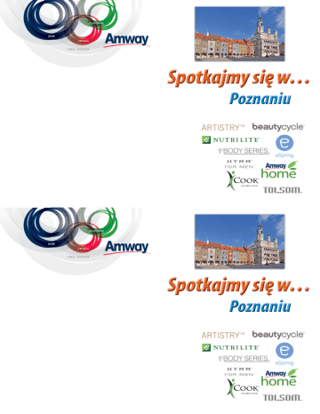 Z D R OW OW I E DOM OM URODA TWÓJ BIZNES Z D R OW OW I E DOM OM URODA TWÓJ BIZNES Stoiska Serdecznie zapraszam Zadbany Pan, czyli kosmetyki i suplementy dla mężczyzn …………………………………………………………. Piękna Pani, czyli kosmetyki i suplementy dla kobiet na EXPO produktowe organizowane przez Zabawa kolorami , czyli możliwość dobrania dla siebie kosmetyków kolorowych Make up, czyli możliwość skorzystania z porad wizażysty Czysty Dom i Auto, czyli prezentacje środków czyszczących i piorących Biznes, czyli pracownicy Działu Obsługi Klienta do Państwa dyspozycji 27 października 2013 (niedziela) w godz. 12.00 – 17.00 Międzynarodowe Targi Poznańskie, Pawilon 15 wejście od ul. Śniadeckich Osoba zapraszająca Sesja prezentacji Zapraszamy także na prezentacje naszych głównych marek: NUTRILITE™, Amway HOME™, eSpring™, iCook™. …………………………………………………………. Sesje rozpoczynają się o godzinach: 12.30, 14.00, 15.45 Stoiska Serdecznie zapraszam Zadbany Pan, czyli kosmetyki i suplementy dla mężczyzn …………………………………………………………. Piękna Pani, czyli kosmetyki i suplementy dla kobiet na EXPO produktowe organizowane przez Zabawa kolorami , czyli możliwość dobrania dla siebie kosmetyków kolorowych Make up, czyli możliwość skorzystania z porad wizażysty Czysty Dom i Auto, czyli prezentacje środków czyszczących i piorących Biznes, czyli pracownicy Działu Obsługi Klienta do Państwa dyspozycji 27 października 2013 (niedziela) w godz. 12.00 – 17.00 Międzynarodowe Targi Poznańskie, Pawilon 15 wejście od ul. Śniadeckich Osoba zapraszająca Sesja prezentacji Zapraszamy także na prezentacje naszych głównych marek: NUTRILITE™, Amway HOME™, eSpring™, iCook™. Sesje rozpoczynają się o godzinach: 12.30, 14.00, 15.45 ………………………………………………………….
