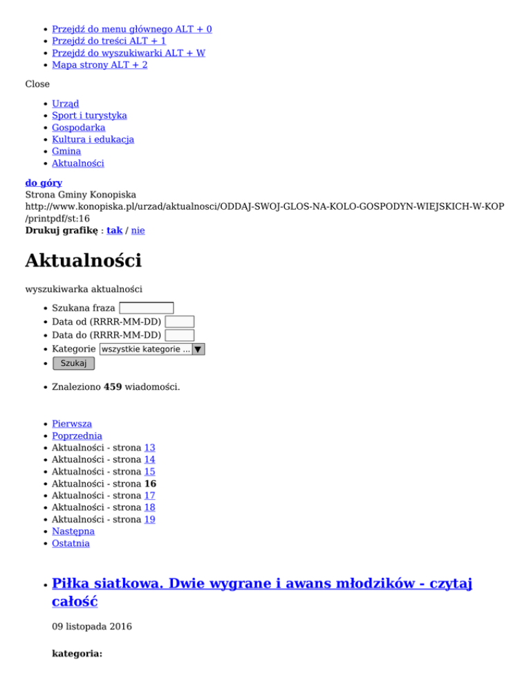 Przejdź do menu głównego ALT + 0 Przejdź do treści ALT + 1 Przejdź do wyszukiwarki ALT + W Mapa strony ALT + 2 Close Urząd Sport i turystyka Gospodarka Kultura i edukacja Gmina Aktualności do góry Strona Gminy Konopiska http://www.konopiska.pl/urzad/aktualnosci/ODDAJ-SWOJ-GLOS-NA-KOLO-GOSPODYN-WIEJSKICH-W-KOP /printpdf/st:16 Drukuj grafikę : tak / nie Aktualności wyszukiwarka aktualności Szukana fraza Data od (RRRR-MM-DD) Data do (RRRR-MM-DD) Kategorie wszystkie kategorie ... ▼ Szukaj Znaleziono 459 wiadomości. Pierwsza Poprzednia Aktualności - strona 13 Aktualności - strona 14 Aktualności - strona 15 Aktualności - strona 16 Aktualności - strona 17 Aktualności - strona 18 Aktualności - strona 19 Następna Ostatnia Piłka siatkowa. Dwie wygrane i awans młodzików - czytaj całość 09 listopada 2016 kategoria: Sport i Turystyka W ósmej kolejce spotkań AZS 2020 Konopiska podejmował w we własnej hali rywali z Katowic i Rybnika. Stawką obu meczy było utrzymanie przez nasz zespól trzeciego miejsca w grupie i awans do kolejnego etapu rozgrywek. W walce z rywalami naszą drużynę dzielnie wspierali licznie zgromadzeni kibice , którzy głośnym dopingiem pomagali chłopakom szczególnie w ciężkich chwilach na boisku. Piłka siatkowa. Dwie wygrane i awans młodzików Piłka siatkowa. Dwie wygrane i awans młodzików - czytaj całość Szkolenie podstawowe w zakresie stosowania środków ochrony roślin - czytaj całość 08 listopada 2016 kategoria: Dla przedsiębiorców Śląski Ośrodek Doradztwa Rolniczego w Częstochowie zaprasza na szkolenie podstawowe w zakresie stosowania środków ochrony roślin sprzętem naziemnym, z wyłączeniem sprzętu montowanego na pojazdach szynowych oraz innego sprzętu montowanego w kolejnictwie. Szkolenie podstawowe w zakresie stosowania środk Szkolenie podstawowe w zakresie stosowania środków ochrony roślin - czytaj całość Szkolenie podstawowe w zakresie doradztwa dotyczącego środków ochrony roślin - czytaj całość 08 listopada 2016 kategoria: Urząd Śląski Ośrodek Doradztwa Rolniczego w Częstochowie zaprasza na szkolenie podstawowe w zakresie doradztwa dotyczącego środków ochrony roślin. Szkolenie kończy się egzaminem testowym i wydaniem zaświadczenia. Zaświadczenie o ukończeniu szkolenia zachowuje ważność przez okres 5 lat od dnia ukończenia szkolenia i uprawnia do obrotu środkami ochrony roślin. Szkolenie podstawowe w zakresie doradztwa dotyczą Szkolenie podstawowe w zakresie doradztwa dotyczącego środków ochrony roślin - czytaj całość Pomagamy, bo chcemy… - czytaj całość 08 listopada 2016 kategoria: Kultura i Edukacja Dzieci z Zespołu Szkolno-Przedszkolnego w Rększowicach biorą udział w ogólnopolskiej akcji ,,Wszystkie Kolory Świata” organizowanej przez UNICEF. Uczniowie przygotowują specjalne, charytatywne laleczki będące symbolem pomocy, jakiej chcą udzielić swoim rówieśnikom z Angoli, którzy umierają z powodu chorób, jakim my potrafimy zapobiegać. Pomagamy, bo chcemy… Pomagamy, bo chcemy… - czytaj całość SZACHIŚCI NA MEDAL ! - czytaj całość 07 listopada 2016 kategoria: Kultura i Edukacja Ogromne emocje towarzyszyły rozgrywanym 4-go listopada w Zespole Szkół MechanicznoElektrycznych w Częstochowie zawodom szachowym w ramach Igrzysk Młodzieży Szkolnej. Do tej fazy rozgrywek /półfinał wojewódzki/ zakwalifikowały się dwie szkoły z naszej gminy – Aleksandria i Kopalnia. Byliśmy jedyną gminą wiejską, która na ten szczebel rozgrywek wprowadziła dwa zespoły. SZACHIŚCI NA MEDAL ! SZACHIŚCI NA MEDAL ! - czytaj całość Czwarta edycja Częstochowskiego Dnia Sportu - czytaj całość 06 listopada 2016 kategoria: Sport i Turystyka W sobotę, 29 października w hali sportowej przy ul. Żużlowej odbyła się czwarta edycja Częstochowskiego Dnia Sportu. Gościem specjalnym był Tomasz Majewski, złoty medalista w pchnięciu kulą na igrzyskach w Pekinie oraz Londynie. W programie imprezy zaplanowano m.in. turniej piłkarski dla chłopców w dwóch kategoriach wiekowych - rocznika 2006 i 2008. Czwarta edycja Częstochowskiego Dnia Sportu Czwarta edycja Częstochowskiego Dnia Sportu - czytaj całość Lot Konopiska. Kolejne zwycięstwo odnieśli Juniorzy Starsi czytaj całość 05 listopada 2016 kategoria: Sport i Turystyka Kolejne zwycięstwo odnieśli Juniorzy Starsi. Tym razem po raz kolejny pokonali wyżej notowanego rywala – Błękitni Herby. Mecz mocnym uderzeniem zaczęli gospodarze. Dosłownie mówiąc w 6 minucie potężny strzał z rzutu wolnego oddał Kamil Polaczkiewicz. Bramkarz nie zdołał złapać piłki i ku uciesze zawodników i kibiców wpadła do bramki. Kilka minut później, dokładnie w 9 minucie zdobywamy kolejną bramkę. Lot Konopiska. Kolejne zwycięstwo odnieśli Junio Lot Konopiska. Kolejne zwycięstwo odnieśli Juniorzy Starsi - czytaj całość Roma Szwyngel – autorką niezwykłej powieści - czytaj całość 05 listopada 2016 kategoria: Kultura i Edukacja Z wielką przyjemnością informujemy, że nasza mieszkanka Romualda Szwyngel z Hutek, do niedawna nauczyciel historii w Gimnazjum w Konopiskach jest autorką doskonałej powieści pt. „Powiedz Ameryce”. Roma Szwyngel – autorką niezwykłej powieści Roma Szwyngel – autorką niezwykłej powieści - czytaj całość Obwieszczenie - czytaj całość 04 listopada 2016 kategoria: Urząd Obwieszczenie Wójta Gminy Konopiska Obwieszczenie Obwieszczenie - czytaj całość PROMYK się rozświetla! - czytaj całość 04 listopada 2016 kategoria: Pomoc społeczna W Placówce Wsparcia Dziennego Promyk nieustannie coś się dzieje! Aktualnie jesteśmy na etapie artystycznego malowania ścian naszych sal. Delikatne pociągnięcia pędzlem, istotne detale za sprawą plastyczki - Małgorzaty Jakubowskiej - przeobrażą się w barwne postacie. Jednokolorowe ściany zastąpi malownicza, sportowa sceneria. PROMYK się rozświetla! PROMYK się rozświetla! - cz