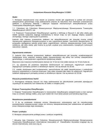 Instytutowa Klauzula Klasyfikacyjna 1/1/2001 Statki 1. Niniejsze ubezpieczenie oraz stawki za przewóz morski jak uzgodnione w polisie lub umowie ubezpieczenia generalnego mają zastosowanie jedynie do ładunków i/lub interesów przewożonych statkami o konstrukcji stalowej i własnym napędzie mechanicznym sklasyfikowanymi przez Towarzystwo Klasyfikacyjne, będące: 1.1. Członkiem lub Członkiem Stowarzyszonym Międzynarodowego Stowarzyszenia Towarzystw Klasyfikacyjnych (IACS*), lub 1.2. Krajowym Towarzystwem Klasyfikacyjnym zgodnie z definicją w Klauzuli 4, ale tylko wtedy gdy statek uprawia wyłącznie żeglugę kabotażową w danym kraju (w tym żeglugę między wyspami archipelagu, którego częścią jest to państwo). Ładunki i/lub interesy przewożone statkami nie sklasyfikowanymi jak powyżej muszą zostać niezwłocznie zgłoszone Ubezpieczycielowi w celu uzgodnienia stawek i warunków ubezpieczenia. W przypadku wystąpienia szkody przed takim uzgodnieniem, ochrona ubezpieczeniowa może zostać udzielona, ale tylko wtedy, gdy można by ją było uzyskać przy zastosowaniu rozsądnych rynkowych warunków i stawek. Ograniczenia wiekowe 2. Ładunki i/lub interesy przewożone statkami sklasyfikowanymi jak powyżej, przekraczającymi następujące limity wiekowe zostaną objęte ubezpieczeniem wg polisy lub umowy ubezpieczenia generalnego, z zastrzeżeniem uzgodnienia dodatkowej składki. Masowce oraz masowce kombinowane starsze niż 10 lat lub inne statki starsze niż 15 lat chyba że, 2.1. są używane do przewozu ładunków drobnicowych na ustalonych, regularnych szlakach żeglugowych pomiędzy portami w określonym rejonie i nie są starsze niż 25 lat, 2.2. zostały zbudowane jako kontenerowce, samochodowe lub statki bezpokrywowe o podwójnym poszyciu wyposażone w suwnice bramowe i były stale używane jako takie na ustalonych, regularnych szlakach żeglugowych pomiędzy portami w określonym rejonie i nie są starsze niż 30 lat, Klauzula przeładunkowa /barki/ 3. Wymagania niniejszej klauzuli nie mają zastosowania do jakichkolwiek jednostek pływających używanych do załadunku lub rozładunku ze statku w obrębie portu. Krajowe Towarzystwo Klasyfikacyjne 4. Krajowe Towarzystwo Klasyfikacyjne to towarzystwo klasyfikacyjne zarejestrowane w tym samym kraju co armator danego statku, przy czym statek ten musi także pływać pod banderą tego kraju. Niezwłoczne powiadomienie 5. O ile na podstawie niniejszej umowy Ubezpieczony zobowiązany jest do niezwłocznego powiadomienia ubezpieczyciela, prawo do ochrony ubezpieczeniowej jest uzależnione od spełnienia przez Ubezpieczonego tego obowiązku. Prawo i praktyka 6. Niniejsze ubezpieczenie podlega prawu i praktyce angielskiej. * Aktualna lista Członków oraz Członków Stowarzyszonych Międzynarodowego Stowarzyszenia Towarzystw Klasyfikacyjnych (International Association of Classification Societies) znajduje się na stronie internetowej: www.iacs.org.uk