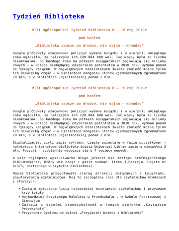 Tydzień Biblioteka VIII Ogólnopolski Tydzień Biblioteka 8 – 15 Maj 2011r pod hasłem „Biblioteka zawsze po drodze, nie mijam – wchodzę” Google próbowały szacunkowo policzyć wydane książki i w sierpniu ubiegłego roku ogłosiło, że naliczyło ich 129 864 880 wol. Już wtedy była to liczba nieaktualna, bo każdego roku na półkach księgarskich pojawiają się miliony nowych – w Polsce niebędącej edytorskim potentatem w 2010 roku wydano ponad 31 tysięcy książek. W największych bibliotekach świata znaleźć można tylko ich niewielką część – w Bibliotece Kongresu Stanów Zjednoczonych zgromadzono 20 mln, a w Bibliotece Jagiellońskiej ponad 2 mln. VIII Ogólnopolski Tydzień Biblioteka 8 – 15 Maj 2011r pod hasłem „Biblioteka zawsze po drodze, nie mijam – wchodzę” Google próbowały szacunkowo policzyć wydane książki i w sierpniu ubiegłego roku ogłosiło, że naliczyło ich 129 864 880 wol. Już wtedy była to liczba nieaktualna, bo każdego roku na półkach księgarskich pojawiają się miliony nowych – w Polsce niebędącej edytorskim potentatem w 2010 roku wydano ponad 31 tysięcy książek. W największych bibliotekach świata znaleźć można tylko ich niewielką część – w Bibliotece Kongresu Stanów Zjednoczonych zgromadzono 20 mln, a w Bibliotece Jagiellońskiej ponad 2 mln. Digitalizacja, czyli zapis cyfrowy, ciągle pozostaje w fazie początkowej – największa internetowa biblioteka świata Uniwersal Libray zawiera niespełna 2 mln. Pozycji – codziennie wzbogaca się o 7 tysięcy nowych. A więc najlepsza wyszukiwarka długo jeszcze nie zastąpi profesjonalnego bibliotekarza, który wie czego i gdzie szukać. (teks J.Raszeja, Cogito nr 9/375, dostępnego w czytelni biblioteki). Nasza biblioteka przygotowała szereg atrakcji związanych z książkami, popularyzacją czytelnictwa. Maj to szczególny czas dla czytelników młodszych i starszych. Zostaje zgłoszona lista najbardziej oczytanych czytelników i przyznane trzy tytuły Najbardziej Oczytanego Małolata w Przedszkolu , w Szkole Podstawowej i Gimnazjum Zajęcia z dziećmi przedszkolnymi w ramach projektu „Czytające Przedszkole” Przyznanie Dyplomu od dzieci „Przyjaciel Dzieci i Biblioteki” Wystawy okolicznościowe „Rok Milosza 2011″ Ogłoszenie konkursu plastyczno – technicznego Z okazji 130 rocznicy urodzin bohatera książki Carla Collodiego „Pinokio” z tej okazji odbędą się specjalne zajęcia tj. „głośne czytanie” fragm. książki zgaduj zgadula literacka Kontynuacja akcji „Uwalniamy książki”, która będzie przez cały maj prowadzona do chwili obecnej tj. Od Święta Książki z Różą uwolnionych zostało ponad 500 książek z okazji Święta Bibliotekarza odbędzie się spotkanie bibliotekarzy z powiatu lubańskiego w „TRECIE” herbaciarni Słów modlitewnych kilka do św. Wawrzyńca, opiekuna bibliotekarzy Niech święte bramy bibliotek pozostaną święte w każdym mieście wsi i przysiółku niech żywioły a przede wszystkim nierozumny człowiek nie czynią szkody niech twoje święte bramy pozostaną ciągle otwarte dając schronienie rozumnym przed żarem słonecznym i śniegiem przed na wietrze falującym nieporozumieniem i niech ścieżki prowadzące do bram są wciąż na nowo deptane a bibliotekarzom wybacz smutek stojących na straży czasu a szaty ich niech pozostaną szare a ich puste pełne ręce niech będą jak od deski do deski nieprzebyte przestrzenie gdzie gwiazdy na zawsze pozostaną białe a trawa zielona PINOKIO 130 rocznica urodzin – bohatera książki Carla Collodiego „PINOKIO” z tej okazji Miejska Biblioteka Publiczna ogłasza konkurs plastyczno – techniczny pod hasłem Pinokio ma urodziny” „ prace można składać do 17 czerwca 2011r w MBP PINOKIO 130 rocznica urodzin – bohatera książki Carla Collodiego „PINOKIO” z tej okazji Miejska Biblioteka Publiczna ogłasza konkurs plastyczno – techniczny pod hasłem Pinokio ma urodziny” „ prace można składać do 17 czerwca 2011r w MBP Tydzien bibliotek Książka i róża Książka i róża „po mazowiecku” Niedawno obchodziliśmy święto „Święto książki z różą” w naszej Bibliotece. Tymczasem w wojewódzctwie Mazowieckim władze zorganizowali bardzo ciekawą akcje, mającej na celu zachęcić do czytania i kupowania książek. W całej akcji weźmie udział 61 księgarnii w całym województwie. W najblizszy czwartek i piątek (28-29.04.2011) będzie można kupić ulubione tytuły w rabatowych cenach od 10% do 20%. Więcej szegółów tutaj. My oczywiście popieramy takie działania i czekamy, aż bliżej naszej miejscowości zorganizowane zostaną podobne akcje :) życzenia wielkanocne Najserdeczniejsze życzenia zdrowych, radosnych i spokojnych Świąt Wielkiej Nocy, smacznego jajka, mokrego dyngusa, a także odpoczynku w rodzinnym gronie życzą Pracownicy Miejskiej Biblioteki Publicznej. Protokół z konkursu „Mój pomysł na Palmę Wielkanocną” Protokół z konkursu „Mój pomysł na Palmę Wielkanocną” Wszystkie prace można podziwiać tutaj Komisja w dniu 14 kwietnia 2011r oceniła prace i przyznała nagrody w kategoriach: Protokół z konkursu „Mój pomysł na Palmę Wielkanocną” Wszystkie prace można podziwiać tutaj Komisja w dniu 14 kwietnia 2011r oceniła prace i przyznała nagrody w kategoriach: prace zbiorowe I miejsce grupa STOKROTKI II miejsce grupa MUCHOMORKI prace indywidualne I miejsce Marta Puzio, Nela Nikadon, Magda Tchórz SP nr 1 w Lubaniu II miejsce Dominik Adam II miejsce Wojciech Dąbrowicki SP nr 1 w Lubaniu III miejsce Natalia Grońska III miejsce Kasia Jankowiecka III miejsce Natalia Rewers III miejsce Daniel Kiwiński praca ekologiczna I miejsce Jakub Olszewski Nagrody specjalne od Radnych Komisji Oświaty i Promocji dla Julii Wasilewskiej, Marcela Szczekulskiego, Mateusza Podkomorzego od pracowników Miejskiej Biblioteki Publicznej dla Weroniki Niewiadomskiej od kierownik