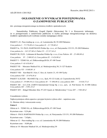 Rzeszów, dnia 09.02.2015 r AD.ZP.3810-1/2015/KZ OGŁOSZENIE O WYNIKACH POSTĘPOWANIA O ZAMÓWIENIE PUBLICZNE dot.: przetargu nieograniczonego na dostawę środków opatrunkowych. Samodzielny Publiczny Zespół Opieki Zdrowotnej Nr 1 w Rzeszowie informuje, że w postępowaniu o zamówienie publiczne w trybie przetargu nieograniczonego na dostawy środków opatrunkowych wybrane zostały następujące oferty: PAKIET I, II– Paso-trading sp. z o.o., ul. Lutomierska 48, 95-200 Pabianice Cena pakietu I – 72 576,00 zł, Cena pakiet II – 21 729,60 zł PAKIET Ia , VI- PAUL HARTMANN Polska Sp. z o.o., ul. Partyzancka 133/151, 95-200 Pabianice Cena pakietu Ia – 143 337,60 zł, Pakiet VI – 15 517,44 zł PAKIET III, IV,IX - Lohmann & Rauscher Polska Sp. z o.o.,Cena Pakietu III – 25 488,00 zł, Cena pakietu IV – 2 069,82 zł, Cena pakietu IX – 8 424,00 zł PAKIET V - TZMO SA, ul. Żółkiewskiego20/26, 87-100 Toruń Cena pakietu V- 63 418,68 zł PAKIET VII – Mercator Medical SA, ul. Modrzejewskiej 30, 31-327 Kraków Cena pakietu VII – 8 840,88 zł PAKIET VIII – Kot-Bud II J. Kot, C. Kot, ul. Astrów 21, 43-100 Tychy Cena pakietu VIII – 33 670,38 zł PAKIET X,XI,XIII – SKAMEX Sp. z o.o., Sp.k, 93-121 Łódź, ul. Częstochowska 38/52 Cena pakietu X –19 609,56 zł, Cena pakietu XI – 71 496,00 zł, cena pakietu XIII – 14 616,72 zł PAKIET XII – G.C.Z.M. ZARYS International Group Sp. z o.o., sp.k, ul. Pod borem 18, 41-808 Zabrze Cena pakietu XII – 3 891,24 zł PAKIET XIV – Kikgel Mirosław Kik, 97-225 Ujazd, ul. Skłodowskiej 7 Cena XIV – 1 965,60 zł Uzasadnienie wyboru: Najkorzystniejsza oferta oparciu o przyjęte kryteria wyboru ofert – najniższa cena . 2) Złożone oferty i streszczenie oceny: Pakiet I Oferta nr 4 – TZMO SA, ul. Żółkiewskiego20/26, 87-100 Toruń Kryterium cena – 9,24 pkt. Oferta 6 - PAUL HARTMANN Polska Sp. z o.o., ul. Partyzancka 133/151, 95-200 Pabianice Kryterium cena – 7,63pkt.; Oferta nr 12 – Paso-trading Sp. z o.o. ul. Lutomierska 48, 95-200 Pabianice Kryterium cena – 10,00 pkt. Oferta nr 10 -Mercator Madical SA, ul. Modrzejewskiej 30 Kryterium cena – 9,55 pkt. Oferta nr 9 – MaiMed Polska Sp. z o.o. Kryterium cena – 7,06 pkt. Oferta nr 14 – G.C.Z.M. ZARYS ., ul. Pod borem 18, 41-808 Zabrze Kryterium cena – 9,35 pkt. Oferta nr 13 – POLMIL Sp. z o.o., ul. Ks. Schulza 1 Kryterium cena – 8,35 pkt.. Pakiet Ia Oferta nr 4 – TZMO SA, ul. Żółkiewskiego20/26, 87-100 Toruń Kryterium cena – 7,24 pkt. Oferta 6 - PAUL HARTMANN Polska Sp. z o.o., ul. Partyzancka 133/151, 95-200 Pabianice Kryterium cena – 10,00pkt.; Oferta nr 8 - Lohmann & Rauscher Polska Sp. z o.o. Kryterium cena – 8,87 pkt. Oferta nr 12 – Paso-trading Sp. z o.o. ul. Lutomierska 48, 95-200 Pabianice Kryterium cena – 9,54 pkt. Oferta nr 10 -Mercator Madical SA, ul. Modrzejewskiej 30 Kryterium cena – 7,90 pkt. Oferta nr 9 – MaiMed Polska Sp. z o.o. Kryterium cena – 7,09 pkt. Oferta nr 14 – G.C.Z.M. ZARYS, ul. Pod borem 18, 41-808 Zabrze Kryterium cena – 7,79 pkt. Oferta nr 13 – POLMIL Sp. z o.o., ul. Ks. Schulza 1 Kryterium cena – 7,16 pkt. Pakiet II Oferta nr 4 -TZMO SA, ul. Żółkiewskiego 20/26, 87-100 Toruń Kryterium cena – 8,06 pkt. Oferta 6- PAUL HARTMANN Polska Sp. z o.o., ul. Partyzancka 133/151, 95-200 Pabianice Kryterium cena – 8,54pkt. Oferta nr 8 - Lohmann & Rauscher Polska Sp. z o.o. Kryterium cena – 9,40 pkt. Oferta nr 10 -Mercator Madical SA, ul. Modrzejewskiej 30 Kryterium cena – 7,40 pkt. Oferta nr 12 - Paso-trading Sp. z o.o. ul. Lutomierska 48, 95-200 Pabianice Kryterium cena – 10,00 pkt. Oferta nr 13 – POLMIL Sp. z o.o., ul. Ks. Schulza 1 Kryterium cena – 8,79 pkt. Pakiet III Oferta 2 - SKAMEX Sp. z o.o., Sp.k, 93-121 Łódź, ul. Częstochowska 38/52 Kryterium cena – 9,30 pkt. Oferta nr 4 - TZMO SA, ul. Żółkiewskiego20/26, 87-100 Toruń Kryterium cena – 9,07 pkt. Oferta 6- PAUL HARTMANN Polska Sp. z o.o., ul. Partyzancka 133/151, 95-200 Pabianice Kryterium cena – 8,54 pkt. Oferta nr 8 - Lohmann & Rauscher Polska Sp. z o.o. Kryterium cena – 10,00 pkt. Oferta 11 - Kot-Bud II J. Kot, C. Kot, ul. Astrów 21, 43-100 Tychy Kryterium cena – 8,49 pkt Oferta nr 12 - Paso-trading Sp. z o.o. ul. Lutomierska 48, 95-200 Pabianice Kryterium cena – 9,90 pkt. Pakiet IV Oferta 2 - SKAMEX Sp. z o.o., Sp.k, 93-121 Łódź, ul. Częstochowska 38/52 Kryterium cena – 7,90 pkt. Oferta nr 4 - TZMO SA, ul. Żółkiewskiego20/26, 87-100 Toruń Kryterium cena – 7,29 pkt. Oferta 6- PAUL HARTMANN Polska Sp. z o.o., ul. Partyzancka 133/151, 95-200 Pabianice Kryterium cena – 7,94 pkt. Oferta nr 8 - Lohmann & Rauscher Polska Sp. z o.o. Kryterium cena – 10,00 pkt. Oferta 11 - Kot-Bud II J. Kot, C. Kot, ul. Astrów 21, 43-100 Tychy Kryterium cena – 5,05 pkt Pakiet V Oferta nr 4 - TZMO SA, ul. Żółkiewskiego20/26, 87-100 Toruń Kryterium cena – 10,00 pkt. Oferta nr 6 - PAUL HARTMANN Polska Sp. z o.o., ul. Partyzancka 133/151, 95-200 Pabianice Kryterium cena – 8,21 pkt. Pakiet VI Oferta nr 4 - TZMO SA, ul. Żółkiewskiego20/26, 87-100 Toruń Kryterium cena – 7,67 pkt. Oferta 6 - PAUL HARTMANN Polska Sp. z o.o., ul. Partyzancka 133/151, 95-200 Pabianice Kryterium cena – 10,00 pkt. Oferta nr 14 – G.C.Z.M. ZARYS ., ul. Pod borem 18, 41-808 Zabrze Kryterium cena – 9,02 pkt. Pakiet VII Oferta 2 - SKAMEX Sp. z o.o., Sp.k, 93-121 Łódź, ul. Częstochowska 38/52 Kryterium cena – 8,60 pkt. Oferta nr 4 - TZMO SA, ul. Żółkiewskiego20/26, 87-100 Toruń Kryterium cena – 7,46 pkt. Oferta nr 10 -Mercator Madical SA, ul. Modrzejewskiej 30 Kryterium cena – 10,00 pkt. Oferta 11 - Kot-Bud II J. Kot, C. Kot, ul. Astrów 21, 43-100 Tychy Kryterium cena – 7,71 pkt Oferta 14 - G.C.Z.M. ZARYS Sp. z o.o., ul. Pod borem 18, 41-808 Zabrze Kryterium cena – 8,84 pkt. Pakiet VIII Oferta nr 5 – 3 M Poland Sp. z o.o. , Al. Katowicka 117, Kajetany, 05-830 Nadarzyn Kryterium cena – 5,44 pkt. Oferta 11 - 