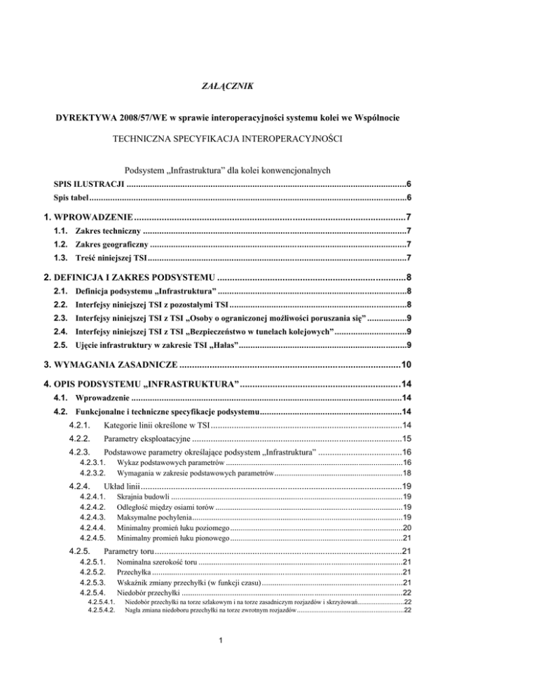 ZAŁĄCZNIK DYREKTYWA 2008/57/WE w sprawie interoperacyjności systemu kolei we Wspólnocie TECHNICZNA SPECYFIKACJA INTEROPERACYJNOŚCI Podsystem „Infrastruktura” dla kolei konwencjonalnych SPIS ILUSTRACJI ........................................................................................................................6 Spis tabel........................................................................................................................................6 1. WPROWADZENIE............................................................................................................7 1.1. Zakres techniczny .................................................................................................................7 1.2. Zakres geograficzny ..............................................................................................................7 1.3. Treść niniejszej TSI...............................................................................................................7 2. DEFINICJA I ZAKRES PODSYSTEMU ...........................................................................8 2.1. Definicja podsystemu „Infrastruktura” .................................................................................8 2.2. Interfejsy niniejszej TSI z pozostałymi TSI ............................................................................8 2.3. Interfejsy niniejszej TSI z TSI „Osoby o ograniczonej możliwości poruszania się” .................9 2.4. Interfejsy niniejszej TSI z TSI „Bezpieczeństwo w tunelach kolejowych”...............................9 2.5. Ujęcie infrastruktury w zakresie TSI „Hałas”........................................................................9 3. WYMAGANIA ZASADNICZE ........................................................................................10 4. OPIS PODSYSTEMU „INFRASTRUKTURA”................................................................14 4.1. Wprowadzenie ....................................................................................................................14 4.2. Funkcjonalne i techniczne specyfikacje podsystemu.............................................................14 4.2.1. Kategorie linii określone w TSI..................................................................................14 4.2.2. Parametry eksploatacyjne ..........................................................................................15 4.2.3. Podstawowe parametry określające podsystem „Infrastruktura” ....................................16 4.2.3.1. 4.2.3.2. 4.2.4. Układ linii................................................................................................................19 4.2.4.1. 4.2.4.2. 4.2.4.3. 4.2.4.4. 4.2.4.5. 4.2.5. Wykaz podstawowych parametrów ....................................................................................16 Wymagania w zakresie podstawowych parametrów.............................................................18 Skrajnia budowli ..............................................................................................................19 Odległość między osiami torów .........................................................................................19 Maksymalne pochylenia....................................................................................................19 Minimalny promień łuku poziomego..................................................................................20 Minimalny promień łuku pionowego..................................................................................21 Parametry toru..........................................................................................................21 4.2.5.1. 4.2.5.2. 4.2.5.3. 4.2.5.4. 4.2.5.4.1. 4.2.5.4.2. Nominalna szerokość toru .................................................................................................21 Przechyłka .......................................................................................................................21 Wskaźnik zmiany przechyłki (w funkcji czasu) ...................................................................21 Niedobór przechyłki .........................................................................................................22 Niedobór przechyłki na torze szlakowym i na torze zasadniczym rozjazdów i skrzyżowań..........................22 Nagła zmiana niedoboru przechyłki na torze zwrotnym rozjazdów............................................................22 1 4.2.5.5. 4.2.5.5.1. 4.2.5.5.2. 4.2.5.6. 4.2.5.7. 4.2.5.7.1. 4.2.5.7.2. 4.2.5.8. 4.2.6. 4.2.8.1.1. 4.2.8.1.2. 4.2.8.1.3. 4.2.8.1.4. 4.2.8.1.5. 4.2.8.2. 4.2.8.3. 4.2.8.4. Wytrzymałość toru na obciążenia pionowe .........................................................................27 Wzdłużna wytrzymałość toru.............................................................................................27 Poprzeczna wytrzymałość toru...........................................................................................28 Wytrzymałość nowych mostów na obciążenie ruchem .........................................................28 Obciążenia pionowe ..............................................................................................................................29 Siły odśrodkowe ...................................................................................................................................29 Siły od wężykowania.............................................................................................................................29 Oddziaływanie na skutek przyspieszania i hamowania (obciążenia wzdłużne)............................................29 Projektowa wichrowatość toru spowodowana oddziaływaniem ruchu kolejowego......................................30 Ekwiwalentne obciążenia pionowe w przypadku nowych budowli ziemnych oraz skutków par