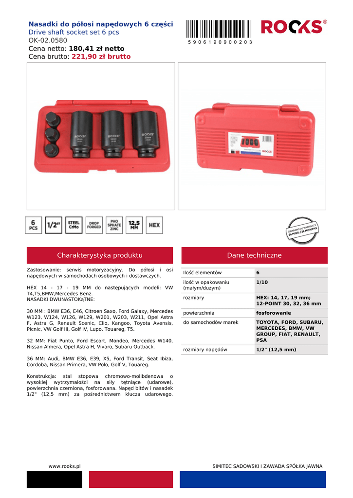 Nasadki do półosi napędowych 6 części Drive shaft socket set 6 pcs OK-02.0580 Cena netto: 180,41 zł netto Cena brutto: 221,90 zł brutto 5 9 0 6 1 9 0 9 0 0 2 0 3 Charakterystyka produktu Zastosowanie: serwis motoryzacyjny. Do półosi i napędowych w samochodach osobowych i dostawczych. Dane techniczne osi HEX 14 - 17 - 19 MM do następujących modeli: VW T4,T5,BMW,Mercedes Benz. NASADKI DWUNASTOKąTNE: 30 MM : BMW E36, E46, Citroen Saxo, Ford Galaxy, Mercedes W123, W124, W126, W129, W201, W203, W211, Opel Astra F, Astra G, Renault Scenic, Clio, Kangoo, Toyota Avensis, Picnic, VW Golf III, Golf IV, Lupo, Touareg, T5. 32 MM: Fiat Punto, Ford Escort, Mondeo, Mercedes W140, Nissan Almera, Opel Astra H, Vivaro, Subaru Outback. Ilość elementów 6 ilość w opakowaniu (małym/dużym) 1/10 rozmiary HEX: 14, 17, 19 mm; 12-POINT 30, 32, 36 mm powierzchnia fosforowanie do samochodów marek TOYOTA, FORD, SUBARU, MERCEDES, BMW, VW GROUP, FIAT, RENAULT, PSA rozmiary napędów 1/2" (12,5 mm) 36 MM: Audi, BMW E36, E39, X5, Ford Transit, Seat Ibiza, Cordoba, Nissan Primera, VW Polo, Golf V, Touareg. Konstrukcja: stal stopowa chromowo-molibdenowa o wysokiej wytrzymalości na siły tętniące (udarowe), powierzchnia czerniona, fosforowana. Napęd bitów i nasadek 1/2" (12,5 mm) za pośrednictwem klucza udarowego. www.rooks.pl SIMITEC SADOWSKI I ZAWADA SPÓŁKA JAWNA