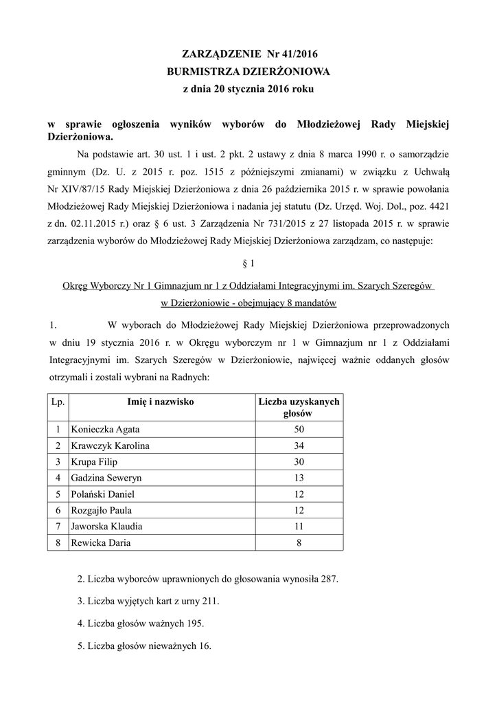 ZARZĄDZENIE Nr 41/2016 BURMISTRZA DZIERŻONIOWA z dnia 20 stycznia 2016 roku w sprawie ogłoszenia wyników wyborów do Młodzieżowej Rady Miejskiej Dzierżoniowa. Na podstawie art. 30 ust. 1 i ust. 2 pkt. 2 ustawy z dnia 8 marca 1990 r. o samorządzie gminnym (Dz. U. z 2015 r. poz. 1515 z późniejszymi zmianami) w związku z Uchwałą Nr XIV/87/15 Rady Miejskiej Dzierżoniowa z dnia 26 października 2015 r. w sprawie powołania Młodzieżowej Rady Miejskiej Dzierżoniowa i nadania jej statutu (Dz. Urzęd. Woj. Dol., poz. 4421 z dn. 02.11.2015 r.) oraz § 6 ust. 3 Zarządzenia Nr 731/2015 z 27 listopada 2015 r. w sprawie zarządzenia wyborów do Młodzieżowej Rady Miejskiej Dzierżoniowa zarządzam, co następuje: §1 Okręg Wyborczy Nr 1 Gimnazjum nr 1 z Oddziałami Integracyjnymi im. Szarych Szeregów w Dzierżoniowie - obejmujący 8 mandatów 1. W wyborach do Młodzieżowej Rady Miejskiej Dzierżoniowa przeprowadzonych w dniu 19 stycznia 2016 r. w Okręgu wyborczym nr 1 w Gimnazjum nr 1 z Oddziałami Integracyjnymi im. Szarych Szeregów w Dzierżoniowie, najwięcej ważnie oddanych głosów otrzymali i zostali wybrani na Radnych: Lp. Imię i nazwisko Liczba uzyskanych głosów 1 Konieczka Agata 50 2 Krawczyk Karolina 34 3 Krupa Filip 30 4 Gadzina Seweryn 13 5 Polański Daniel 12 6 Rozgajło Paula 12 7 Jaworska Klaudia 11 8 Rewicka Daria 8 2. Liczba wyborców uprawnionych do głosowania wynosiła 287. 3. Liczba wyjętych kart z urny 211. 4. Liczba głosów ważnych 195. 5. Liczba głosów nieważnych 16. §2 Okręg Wyborczy Nr 2 - Zespół Gimnazjów nr 3 im. Stanisława Konarskiego w Dzierżoniowie obejmujący 13 mandatów 1. W wyborach do Młodzieżowej Rady Miejskiej Dzierżoniowa przeprowadzonych w dniu 19 stycznia 2016 r. w Okręgu wyborczym nr 2 w Zespole Gimnazjów nr 3 im. Stanisława Konarskiego w Dzierżoniowie najwięcej ważnie oddanych głosów otrzymali i zostali wybrani na Radnych: Lp. Imię i nazwisko Liczba uzyskanych głosów 1 Ogrodnik Wojciech 58 2 Stanek Karol 34 3 Eliasik Daniel 25 4 Bukowska Karolina 20 5 Handwerkier Marta 16 6 Zatorska Laura 8 7 Sztuka Michał 7 8 Zadrożny Filip 7 9 Zagórski Filip 4 10 Pisarewicz Lena 4 11 Olejnik Olaf 4 12 Maciątek Aleksander 4 13 Leśko Aleksandra 4 2. Liczba wyborców uprawnionych do głosowania wynosiła 502. 3. Liczba wyjętych kart z urny 260. 4. Liczba głosów ważnych 219. 5. Liczba głosów nieważnych 41. §3 Wykonanie Zarządzenia powierza się Naczelnikowi Wydziału Infrastruktury Społecznej. §4 Zarządzenie wchodzi w życie z dniem podpisania. BURMISTRZ Dariusz Kucharski Projekt zarządzenia uzgodniono z radcą prawnym. Uzasadnienie 1) Cel i przewidywane skutki: projekt zarządzenia w sprawie ogłoszenia wyników wyborów do Młodzieżowej Rady Miejskiej Dzierżoniowa. 2) Aktualny stan faktyczny i prawny: Uchwała Nr XIV/87/15 Rady Miejskiej Dzierżoniowa z dnia 26 października 2015 r. w sprawie powołania Młodzieżowej Rady Miejskiej Dzierżoniowa i nadania jej statutu (Dz. Urzęd. Woj. Dol., poz. 4421 z dn. 02.11.2015 r.). Zgodnie z § 6 ust. 3 Zarządzenia Nr 731/2015 z 27 listopada 2015 r. w sprawie zarządzenia wyborów do Młodzieżowej Rady Miejskiej Dzierżoniowa, Burmistrz Dzierżoniowa Zarządzeniem ogłasza wyniki wyborów do Młodzieżowej Rady Miejskiej Dzierżoniowa. Niniejszym zarządzeniem ogłasza się zbiorcze wyniki wyborów do Młodzieżowej Rady Miejskiej Dzierżoniowa. 3) Różnice pomiędzy dotychczasowym, a projektowanym stanem prawnym: Brak. 4) Konsekwencje finansowe dla budżetu miasta: Brak 5) Rozdzielnik dla odbiorców wewnętrznych i zewnętrznych: wewnętrzni: – Wydział Infrastruktury Społecznej; – Wydział Promocji; – Kancelaria Rady Miejskiej; zewnętrzni: 1) 2) Gimnazjum nr 1 z Oddziałami Integracyjnymi im. Szarych Szeregów Zespół Gimnazjów nr 3 im. Stanisława Konarskiego