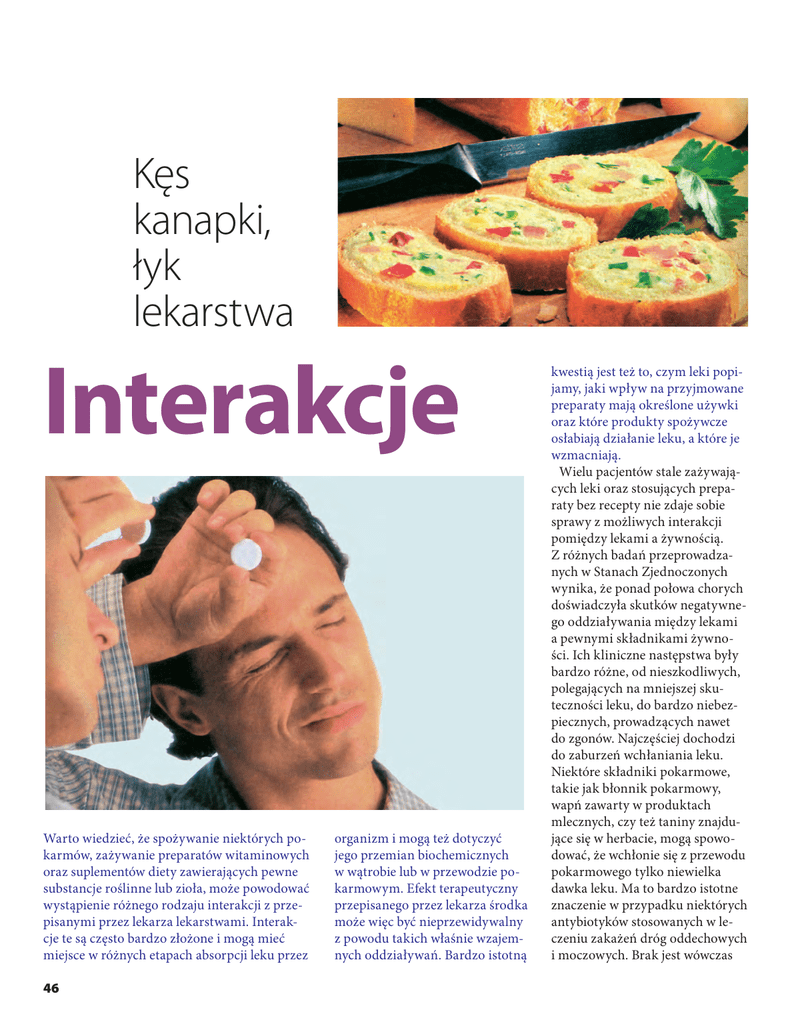 Kęs kanapki, łyk lekarstwa Interakcje Warto wiedzieć, że spożywanie niektórych pokarmów, zażywanie preparatów witaminowych oraz suplementów diety zawierających pewne substancje roślinne lub zioła, może powodować wystąpienie różnego rodzaju interakcji z przepisanymi przez lekarza lekarstwami. Interakcje te są często bardzo złożone i mogą mieć miejsce w różnych etapach absorpcji leku przez 46 organizm i mogą też dotyczyć jego przemian biochemicznych w wątrobie lub w przewodzie pokarmowym. Efekt terapeutyczny przepisanego przez lekarza środka może więc być nieprzewidywalny z powodu takich właśnie wzajemnych oddziaływań. Bardzo istotną kwestią jest też to, czym leki popijamy, jaki wpływ na przyjmowane preparaty mają określone używki oraz które produkty spożywcze osłabiają działanie leku, a które je wzmacniają. Wielu pacjentów stale zażywających leki oraz stosujących preparaty bez recepty nie zdaje sobie sprawy z możliwych interakcji pomiędzy lekami a żywnością. Z różnych badań przeprowadzanych w Stanach Zjednoczonych wynika, że ponad połowa chorych doświadczyła skutków negatywnego oddziaływania między lekami a pewnymi składnikami żywności. Ich kliniczne następstwa były bardzo różne, od nieszkodliwych, polegających na mniejszej skuteczności leku, do bardzo niebezpiecznych, prowadzących nawet do zgonów. Najczęściej dochodzi do zaburzeń wchłaniania leku. Niektóre składniki pokarmowe, takie jak błonnik pokarmowy, wapń zawarty w produktach mlecznych, czy też taniny znajdujące się w herbacie, mogą spowodować, że wchłonie się z przewodu pokarmowego tylko niewielka dawka leku. Ma to bardzo istotne znaczenie w przypadku niektórych antybiotyków stosowanych w leczeniu zakażeń dróg oddechowych i moczowych. Brak jest wówczas efektu terapeutycznego i poprawy klinicznej. Bardzo trudne do przewidzenia, a zarazem bardzo groźne w skutkach, są zaburzenia metabolizmu leków w organizmie spowodowane na przykład działaniem flawonoidów i furanokumaryn zawartych w owocach cytrusowych, zwłaszcza w grejpfrutach. Zahamowanie czynności enzymów zawartych w wątrobie i jelicie cienkim doprowadza do tego, że niektóre leki nie mogą być metabolizowane, co prowadzi do bardzo dużego wzrostu ich stężenia we krwi i, w konsekwencji, do wystąpienia objawów klinicznych „przedawkowania”, takich jak spadek lub wzrost ciśnienia tętniczego krwi czy też zaburzenia przewodzenia i rytmu serca. Większość poznanych dotychczas przypadków wzajemnego oddziaływania pomiędzy żywnością a lekami zachodzi na etapie wchłaniania leku. Ma to miejsce, kiedy lek zażywany jest w trakcie jedzenia lub tuż przed posiłkiem. Leki podane doustnie wchłaniają się w całym przewodzie pokarmowym, głównie jednak w jelicie cienkim, ponieważ ma ono ogromną, silnie unaczynioną powierzchnię chłonną (około 300 m²). Skutki interakcji mogą mieć różne stopnie nasilenia, a statystyki pokazują, że w co najmniej 30 procentach w istotny sposób zaburzają proces leczenia i narażają chorych na poważne powikłania. Z analiz przeprowadzonych w Polsce na podstawie badań losowych wiemy, że skala problemu jest bardzo duża. Narażenie na interakcje między żywnością a lekami wystąpiło u 62 proc. badanych, przyjmujących co najmniej jeden lek, a przecież ryzyko interakcji rośnie wraz z ilością zażywanych leków. W Polsce aż 58 proc. osób zażywa stale więcej niż 3 leki. W badaniach przeprowadzonych przez Instytut Żywności i Żywienia ponad 50 proc. respondentów nie zdawało sobie sprawy z możliwości interakcji pomiędzy przyjmowanymi lekami a spożywaną żywnością. Podstawowa wiedza może zapobiec lub ograniczyć możliwości wystąpienia interakcji. Należy pamiętać, że występują one częściej u osób, których dieta jest nieprawidłowo zbilansowana. Jeśli jakieś produkty spożywcze lub składniki odżywcze zjadane są w nadmiernych ilościach, a inne w niewystarczających, to narażenie na ryzyko interakcji jest większe. Interakcje leków z tłuszczami Szybkość wchłaniania niektórych leków zależy od zawartości tłuszczów w posiłkach, ponieważ powodują one zwiększone wchłanianie leków o dużej lipofilności (jest to cecha związku chemicznego wskazująca na jego duże powinowactwo do tłuszczów i słabą rozpuszczalność w wodzie). Takie leki są bardzo dobrze rozpuszczalne w tłuszczach emulgowanych przez kwasy żółciowe. Emulsja tłuszczowa staje się nośnikiem dla leku i przez to jego wchłanianie istotnie wzrasta. Skutki wybranych interakcji leków z tłuszczami: Posiłki z dużą zawartością tłuszczu, zwiększając wchłanianie preparatów teofiliny, mogą narażać pacjenta na wystąpienie zaburzeń rytmu serca, tachykardii (kołatania serca), hipotonii (spadku ciśnienia), bólów głowy oraz zaburzeń snu. Teofilina to alkaloid purynowy występujący, między innymi w liściach herbaty. Przede wszystkim znajduje ona zastosowanie w leczeniu astmy oskrzelowej i przewlekłej zaporowej choroby oskrzelowopłucnej (przykładowe leki to euphyllin, teophylium). Przeciwwskazania do stosowania preparatów teofiliny to m. in. przebyty zawał serca, zaburzenia rytmu serca, ciężkie nadciśnienie tętnicze, padaczka. Przyjmowanie niektórych lipofilnych leków z grupy ßadrenolityków (beta blokerów) przed jedzeniem, w czasie jedzenia lub tuż po spożyciu posiłku z dużą zawartością tłuszczu może być przyczyną wielu groźnych dla zdrowia objawów, takich jak: zwolnienie czynności serca, niedociśnienie tętnicze, blok przedsionkowo-komorowy, niewydolność serca. Beta-blokery to rozległa grupa preparatów stosowanych w wielu schorzeniach kardiologicznych, przede wszystkim w chorobie wieńcowej, zaburzeniach rytmu serca i nadciśnieniu tętniczym (np. proplanolol, bisocard, metocard). Spożywanie posiłków obfitujących w tłuszcz wraz z niektórymi lekami prz