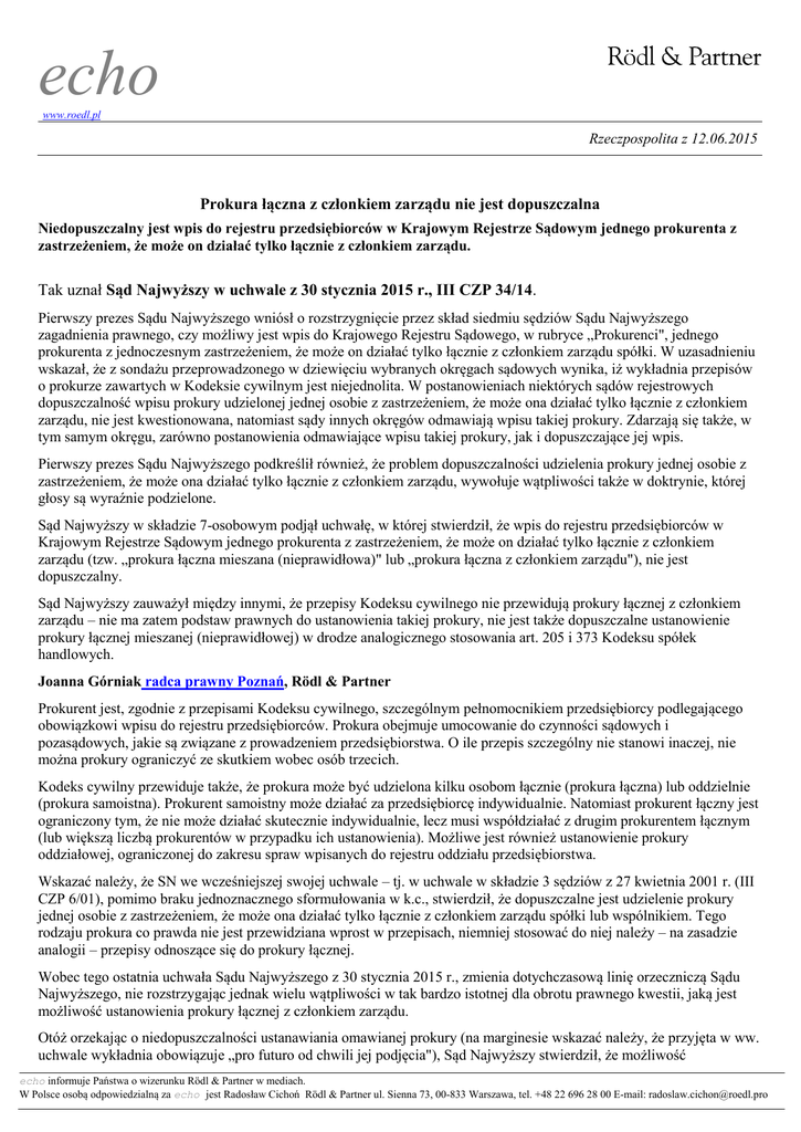 echo www.roedl.pl Rzeczpospolita z 12.06.2015 Prokura łączna z członkiem zarządu nie jest dopuszczalna Niedopuszczalny jest wpis do rejestru przedsiębiorców w Krajowym Rejestrze Sądowym jednego prokurenta z zastrzeżeniem, że może on działać tylko łącznie z członkiem zarządu. Tak uznał Sąd Najwyższy w uchwale z 30 stycznia 2015 r., III CZP 34/14. Pierwszy prezes Sądu Najwyższego wniósł o rozstrzygnięcie przez skład siedmiu sędziów Sądu Najwyższego zagadnienia prawnego, czy możliwy jest wpis do Krajowego Rejestru Sądowego, w rubryce „Prokurenci", jednego prokurenta z jednoczesnym zastrzeżeniem, że może on działać tylko łącznie z członkiem zarządu spółki. W uzasadnieniu wskazał, że z sondażu przeprowadzonego w dziewięciu wybranych okręgach sądowych wynika, iż wykładnia przepisów o prokurze zawartych w Kodeksie cywilnym jest niejednolita. W postanowieniach niektórych sądów rejestrowych dopuszczalność wpisu prokury udzielonej jednej osobie z zastrzeżeniem, że może ona działać tylko łącznie z członkiem zarządu, nie jest kwestionowana, natomiast sądy innych okręgów odmawiają wpisu takiej prokury. Zdarzają się także, w tym samym okręgu, zarówno postanowienia odmawiające wpisu takiej prokury, jak i dopuszczające jej wpis. Pierwszy prezes Sądu Najwyższego podkreślił również, że problem dopuszczalności udzielenia prokury jednej osobie z zastrzeżeniem, że może ona działać tylko łącznie z członkiem zarządu, wywołuje wątpliwości także w doktrynie, której głosy są wyraźnie podzielone. Sąd Najwyższy w składzie 7-osobowym podjął uchwałę, w której stwierdził, że wpis do rejestru przedsiębiorców w Krajowym Rejestrze Sądowym jednego prokurenta z zastrzeżeniem, że może on działać tylko łącznie z członkiem zarządu (tzw. „prokura łączna mieszana (nieprawidłowa)" lub „prokura łączna z członkiem zarządu"), nie jest dopuszczalny. Sąd Najwyższy zauważył między innymi, że przepisy Kodeksu cywilnego nie przewidują prokury łącznej z członkiem zarządu – nie ma zatem podstaw prawnych do ustanowienia takiej prokury, nie jest także dopuszczalne ustanowienie prokury łącznej mieszanej (nieprawidłowej) w drodze analogicznego stosowania art. 205 i 373 Kodeksu spółek handlowych. Joanna Górniak radca prawny Poznań, Rödl & Partner Prokurent jest, zgodnie z przepisami Kodeksu cywilnego, szczególnym pełnomocnikiem przedsiębiorcy podlegającego obowiązkowi wpisu do rejestru przedsiębiorców. Prokura obejmuje umocowanie do czynności sądowych i pozasądowych, jakie są związane z prowadzeniem przedsiębiorstwa. O ile przepis szczególny nie stanowi inaczej, nie można prokury ograniczyć ze skutkiem wobec osób trzecich. Kodeks cywilny przewiduje także, że prokura może być udzielona kilku osobom łącznie (prokura łączna) lub oddzielnie (prokura samoistna). Prokurent samoistny może działać za przedsiębiorcę indywidualnie. Natomiast prokurent łączny jest ograniczony tym, że nie może działać skutecznie indywidualnie, lecz musi współdziałać z drugim prokurentem łącznym (lub większą liczbą prokurentów w przypadku ich ustanowienia). Możliwe jest również ustanowienie prokury oddziałowej, ograniczonej do zakresu spraw wpisanych do rejestru oddziału przedsiębiorstwa. Wskazać należy, że SN we wcześniejszej swojej uchwale – tj. w uchwale w składzie 3 sędziów z 27 kwietnia 2001 r. (III CZP 6/01), pomimo braku jednoznacznego sformułowania w k.c., stwierdził, że dopuszczalne jest udzielenie prokury jednej osobie z zastrzeżeniem, że może ona działać tylko łącznie z członkiem zarządu spółki lub wspólnikiem. Tego rodzaju prokura co prawda nie jest przewidziana wprost w przepisach, niemniej stosować do niej należy – na zasadzie analogii – przepisy odnoszące się do prokury łącznej. Wobec tego ostatnia uchwała Sądu Najwyższego z 30 stycznia 2015 r., zmienia dotychczasową linię orzeczniczą Sądu Najwyższego, nie rozstrzygając jednak wielu wątpliwości w tak bardzo istotnej dla obrotu prawnego kwestii, jaką jest możliwość ustanowienia prokury łącznej z członkiem zarządu. Otóż orzekając o niedopuszczalności ustanawiania omawianej prokury (na marginesie wskazać należy, że przyjęta w ww. uchwale wykładnia obowiązuje „pro futuro od chwili jej podjęcia"), Sąd Najwyższy stwierdził, że możliwość echo informuje Państwa o wizerunku Rödl & Partner w mediach. W Polsce osobą odpowiedzialną za echo jest Radosław Cichoń Rödl & Partner ul. Sienna 73, 00-833 Warszawa, tel. +48 22 696 28 00 E-mail: [email protected] dopuszczenia prokury łącznej mieszanej może de lege lata wynikać tylko z umowy spółki lub statutu. Według SN – tylko taka prokura łączna mieszana jest dopuszczalna na tle przepisów k.c. i k.s.h., gdyż o sposobie reprezentacji spółki może bowiem decydować ustawa lub oparty na niej statut (umowa spółki), a nie oświadczenie woli członków zarządu spółki. Wobec tego pojawia się pytanie – czy Sąd Najwyższy – pomimo orzeczenia o niedopuszczalności ustanawiania prokury łącznej z członkiem zarządu – zostawił przedsiębiorcom „furtkę" do ustanawiania takiej prokury poprzez odpowiednią zmianę umowy spółki w zakresie reprezentacji. Kolejną niewiadomą jest, czy sądy rejestrowe będą wpisywały w taki sposób ustanowioną prokurę. Istnieje bowiem duża niepewność co do przyszłego podejścia sądów rejestrowych w tym zakresie ponieważ uchwała SN z 30 stycznia 2015 r. (III CZP 34/14) nie posiada mocy zasady prawnej, a więc nie jest wiążąca dla innych sądów, co oznacza, że nie muszą się one do niej stosować. W rezultacie stanowisko SN wyrażone w uchwale z 30 stycznia 2015r. rodzi szereg wątpliwości praktycznych i prawnych. Źródło: http://www.rp.pl/artykul/1207811-Prokura-laczna-z-czlonkiem-zarzadu-nie-jestdopuszczalna.html?templat