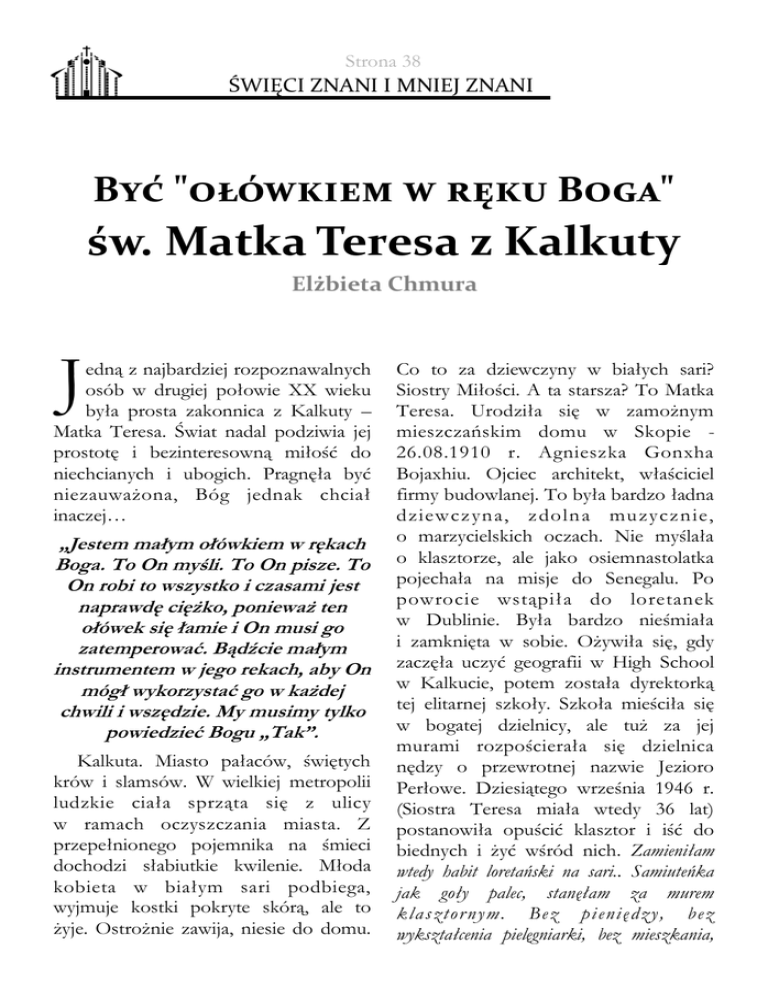 Strona 38 ŚWIĘCI ZNANI I MNIEJ ZNANI Być "ołówkiem w ręku Boga" św. Matka Teresa z Kalkuty Elżbieta Chmura J edną z najbardziej rozpoznawalnych osób w drugiej połowie XX wieku była prosta zakonnica z Kalkuty – Matka Teresa. Świat nadal podziwia jej prostotę i bezinteresowną miłość do niechcianych i ubogich. Pragnęła być niezauważona, Bóg jednak chciał inaczej… „Jestem małym ołówkiem w rękach Boga. To On myśli. To On pisze. To On robi to wszystko i czasami jest naprawdę ciężko, ponieważ ten ołówek się łamie i On musi go zatemperować. Bądźcie małym instrumentem w jego rekach, aby On mógł wykorzystać go w każdej chwili i wszędzie. My musimy tylko powiedzieć Bogu „Tak”. Kalkuta. Miasto pałaców, świętych krów i slamsów. W wielkiej metropolii ludzkie ciała sprząta się z ulicy w ramach oczyszczania miasta. Z przepełnionego pojemnika na śmieci dochodzi słabiutkie kwilenie. Młoda kobieta w białym sari podbiega, wyjmuje kostki pokryte skórą, ale to żyje. Ostrożnie zawija, niesie do domu. Co to za dziewczyny w białych sari? Siostry Miłości. A ta starsza? To Matka Teresa. Urodziła się w zamożnym mieszczańskim domu w Skopie 26.08.1910 r. Agnieszka Gonxha Bojaxhiu. Ojciec architekt, właściciel firmy budowlanej. To była bardzo ładna dziew cz yn a, z doln a muzyczn ie, o marzycielskich oczach. Nie myślała o klasztorze, ale jako osiemnastolatka pojechała na misje do Senegalu. Po powrocie wstąpiła do loretanek w Dublinie. Była bardzo nieśmiała i zamknięta w sobie. Ożywiła się, gdy zaczęła uczyć geografii w High School w Kalkucie, potem została dyrektorką tej elitarnej szkoły. Szkoła mieściła się w bogatej dzielnicy, ale tuż za jej murami rozpościerała się dzielnica nędzy o przewrotnej nazwie Jezioro Perłowe. Dziesiątego września 1946 r. (Siostra Teresa miała wtedy 36 lat) postanowiła opuścić klasztor i iść do biednych i żyć wśród nich. Zamieniłam wtedy habit loretański na sari.. Samiuteńka jak goły palec, stanęłam za murem klasztornym. Bez pieniędzy, bez wykształcenia pielęgniarki, bez mieszkania, Strona 39 ŚWIĘCI ZNANI I MNIEJ ZNANI bez planów, ale z poczuciem pewności - Bóg mnie nie opuści! U amerykańskich sióstr szpitalnych skończyła kurs pielęgniarski. Zamieszkała w znalezionej opuszczonej chatynce i zaczęła uczyć okoliczne dzieci alfabetu, rysując litery na glinianym klepisku. Myła dzieci, szukała chleba, pomagała w szpitalu. Cóż znaczy ta bieganina wobec śmiercionośnej chmury wiszącej nad Kalkutą, dławiącej każdą nadzieję. Zaczął mnie kusić komfort Loreto. Pewnie bym nie wytrzymała, gdyby nie przyszły do mnie moje uczennice. Przywdziały białe sari - to pierwsze Misjonarki Miłości... Potem dołączyły do nas Europejki, Amerykanki, Afrykanki... Musza się uczyć zawodu, kończyć studia prawnicze, medyczne, aby pomóc ludziom… W 1950r. zostaje założone Zgromadzenie Sióstr Misjonarek Miłości i zatwierdzone przez Kościół. Ja ciągle słyszę krzyk wyrzucanych dzieci... Zabijają nienarodzone. Swoje "ja" stawiają ponad Boga. Ludzie decydują o tym, kto ma żyć, a kto nie. Chcą decydować jak Bóg. Skąd! Taka siła w tej kobiecie, zawsze trochę pochylonej, wychudzonej, z grubymi dłońmi i pomarszczoną twarzą? Mówi cicho o Bogu, o modlitwie, o biednych, a słuchają jej wielcy na uniwersytetach, na forum światowych organizacji i stają się przy niej cisi, zmieszani, nawet zalęknieni, gdy patrzy im w oczy. Jest prostą zakonnicą w sari, ale świadomą swojej godności i wielkości sprawy, którą reprezentuje. Unika rozgłosu, a jest najsławniejszą. Nie zabiega o łaski prominentów. W 1982 r. podczas międzynarodowej imprezy na rzecz solidarności z Trzecim Światem, oświadczyła Späthowi: - Niech pan otworzy biednym drzwi, a Bóg będzie panu błogosławił. Jest czasem cięta na natrętnych. Amerykańskiemu dziennikarzowi, który z przerażeniem patrzył na Matkę, jak opatrywała zgangrenowane, cuchnące rany, powiedział: - Ja bym za milion tego nie zrobił – odpowiedziała - Ja też nie. Pan nie wierzy w Boga. Ja wierzę i dla Niego to robię za darmo. Przyjmuje ordery, daniny, ale nosi tylko krzyżyk, przypięty do sari na lewym ramieniu. Otrzymała międzynarodową nagrodę Johna Kennedy’ego, nagrodę Jana XIII, nagrodę dla najbardziej zasłużonej kobiety Azji, doktorat honorowy uniwersytetów w Delhi, Filadelfii, Cambridge, Waszyngtonie i tytuł Doktora Ludzkości. Wreszcie w 1979 r. -Pokojową Nagrodę Nobla. Nie chciała się zgodzić na królewski bankiet, a wzięła pieniądze przeznaczone na przyjęcie i zbudowała dom dla trędowatych. Sama jestem niegodna tej nagrody, ale przyjmuję ją, jako uznanie ludzkiej godności w najbiedniejszych. W auli Uniwersytetu w Oslo dała reprymendę całemu Zachodowi: - Największym wyrzutem dla was jest krzyk nienarodzonego dziecka… Przypomniała im to mocniej – Strona 40 ŚWIĘCI ZNANI I MNIEJ ZNANI Nie odwracajcie się plecami do nędznych, bo odwracacie się od Chrystusa. To On biedny, nagi, bezdomny, abyśmy mogli Go kochać. Powstała organizacja – Przyjaciele Matki Teresy. Oburzyła się bardzo. - Ja nie chcę przyjaciół, ja potrzebuję pomocników. Bogata pani chciała mieć zdjęcie z Matką Teresą. Matka Teresa pokazała biedotę i powiedziała: Niech się pani sfotografuje z nimi - ja tam jestem. Siostry pracują w kilkudziesięciu krajach świata. W samych Indiach jest 20 przytułków, a na świecie? W Polsce również powstały domy Zgromadzenia w Zaborowie, Warszawie, Katowicach, Szczecinie. – Wystarczy mi jedna stara maszyna do pisania. Nigdy nie myślę o pieniądzach. Pan Bóg je zsyła. Jeśli nie ma, to znaczy że nie są potrzebne. Dlaczego mam się denerwować? Tylko dziecko potrafi zauf ać tak ko ch ającemu O jcu. W kaplicach Sióstr Misjonarek Miłości pod krzyżem jest napis: - Kochaj, jak Ja cię ukochałem!!! A do 