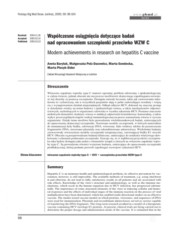 Postepy Hig Med Dosw. (online), 2005; 59: 98-104 www.phmd.pl Review Received: 2004.11.30 Accepted: 2005.02.14 Published: 2005.03.22 Współczesne osiągnięcia dotyczące badań nad opracowaniem szczepionki przeciwko WZW C Modern achievements in research on hepatitis C vaccine Aneta Baryluk, Małgorzata Polz-Dacewicz, Marta Sendecka, Marta Piecyk-Sidor Zakład Wirusologii Akademii Medycznej w Lublinie Streszczenie Wirusowe zapalenie wątroby typu C stanowi ogromny problem zdrowotny i epidemiologiczny w całym świecie, jednak obecnie nie ma jeszcze możliwości skutecznego zapobiegania rozwojowi tej choroby za pomocą szczepienia. Dostępne metody leczenia, takie jak zastosowanie interferonu a i rybawiryny, nie u wszystkich pacjentów dają w pełni zadowalające rezultaty i wiążą się z występowaniem działań niepożądanych. Odkąd odkryto HCV, dokonał się znaczny postęp w dziedzinie wiedzy na temat budowy i epidemiologii wirusa, a także mechanizmów odpornościowych, zachodzących w organizmie człowieka w wyniku zakażenia HCV. Poznano znaczenie niektórych elementów struktury wirusa w indukcji odpowiedzi komórkowej i humoralnej, a także wpływ poszczególnych etapów reakcji immunologicznej na proces namnażania wirusa w żywym organizmie. Dzięki temu możliwe było prowadzenie wielokierunkowych badań, zmierzających do opracowania skutecznej szczepionki. Testowano modele szczepionek, w których materiałem do immunizacji były białka, sekwencje DNA, wirosomy. Jako wektory zdolne do przenoszenia fragmentów DNA, stosowano plazmidy oraz rekombinowane adenowirusy. Wieloletnie badania zaowocowały stworzeniem modelu szczepionki terapeutycznej, zawierającej białka E1 otoczki HCV. Obecnie są przeprowadzane badania kliniczne, zmierzające do ustalenia właściwego dawkowania i schematu podawania szczepionki. Szacuje się, że w najbliższej przyszłości szczepionka taka będzie dostępna jako jeden z elementów terapii u chorych na wirusowe zapalenie wątroby typu C. Są prowadzone również wytężone badania, zmierzające do opracowania szczepionki profilaktycznej, której podanie pozwoli zapobiegać rozwojowi zakażenia HCV. Słowa kluczowe: wirusowe zapalenie wątroby typu C • HCV • szczepionka przeciwko WZW typu C Summary - - - - - Hepatitis C is an immense health and epidemiological problem; its effective prevention by vaccination, however, is still impossible. The available methods of treatment, e.g. using interferon a and ribavirin, do not lead to fully satisfactory results in all patients and are associated with side effects. Knowledge of the virus’s structure and epidemiology, as well as the immune mechanisms, which occur in the human organism due to HCV infection, has progressed substantially. The importance of some structural elements of the virus in inducing cellular and humoral responses and the effects of individual stages of the immune reaction on the process of viral multiplication have been determined, which has enabled multi-directional studies on an effective vaccine. The studies tested vaccine models in which proteins, virosomes, and sequences of DNA were used for immunization. Plasmids and recombinant adenoviruses served as vectors capable of transferring the DNA fragments. This long-term research resulted in a model of a therapeutic vaccine containing HCV envelope E1 proteins. At present, clinical trials are being carried out to determine the proper dosage and administration mode of the vaccine. It is estimated that in the 98 Baryluk A. i wsp. – Współczesne osiągnięcia dotyczące badań… nearest future such a vaccine will be available as an element of therapy in patients with hepatitis C. Furthermore, intensive studies have been undertaken to develop a prophylactic vaccine to prevent the development of HCV infection. Key words: Full-text PDF: Word count: Tables: Figures: References: Adres autorki: hepatitis C • HCV • HCV vaccine http://www.phmd.pl/pub/phmd/vol_59/7168.pdf 3441 — — 43 lek. med. Aneta Baryluk, Zakład Wirusologii AM w Lublinie, Collegium Uniwersum, ul. Chodźki 1, 20-093 Lublin, e-mail: [email protected] WIRUS HCV I EPIDEMIOLOGIA WIRUSOWEGO ZAPALENIA WĄTROBY TYPU C Wirus zapalenia wątroby typu C (Hepatitis C virus – HCV), po raz pierwszy został wyizolowany w 1989 r. [4,7]. Jest klasyfikowany jako Hepacivirus i należy do rodziny Flaviviridae [21]. Genom wirusa jest zbudowany z pojedynczej, dodatnio spolaryzowanej nici RNA, zawierającej około 9,5 tys. nt. W genomie wyróżnia się wysoce konserwatywny region 5’niekodujący oraz część kodującą poliproteinę, z której powstają białka strukturalne (białko rdzenia C i 2 białka otoczkowe E1 i E2/NS1) oraz niestrukturalne (NS2, NS3 a/b, NS4 a/b, NS5 a/b) [3,4,21,26,36]. - - - - - HCV jest czynnikiem wywołującym wirusowe zapalenie wątroby (WZW) początkowo określane jako zapalenie wątroby nie-A, nie-B, a obecnie znane jakoWZW typu C. Szacuje się, że wirusem zapalenia wątroby typu C zakażonych jest w całym świecie około 170 mln ludzi [2], częstość zakażeń w krajach rozwiniętych waha się w granicach 1-3% populacji, a w niektórych uboższych regionach świata dochodzi nawet do ponad 20% [24]. HCV może powodować zarówno ostre, jak i przewlekłe zapalenie wątroby. Pierwotne zakażenie często ma przebieg bezobjawowy. Według różnych źródeł u 50–85% zakażonych osób stwierdza się przewlekłą obecność wirusa w organizmie, a w konsekwencji również przewlekłe zapalenie wątroby, które z kolei jest główną przyczyną marskości wątroby (1/3 chorych z WZW C), raka wątroby, a nawet śmierci z powodu zaawansowanych zmian chorobowych i niewydolności wątroby [17,21,24,26,31,36]. Do zakażenia HCV może dochodzić poprzez kontakt z zakażoną krwią oraz – znacznie rzadziej – przez kontakty seksualne. W krajach, gdzie badania w kierunku obecności przeciwciał anty-HCV oraz RNA wirusa są powszechnie dostępne, udał