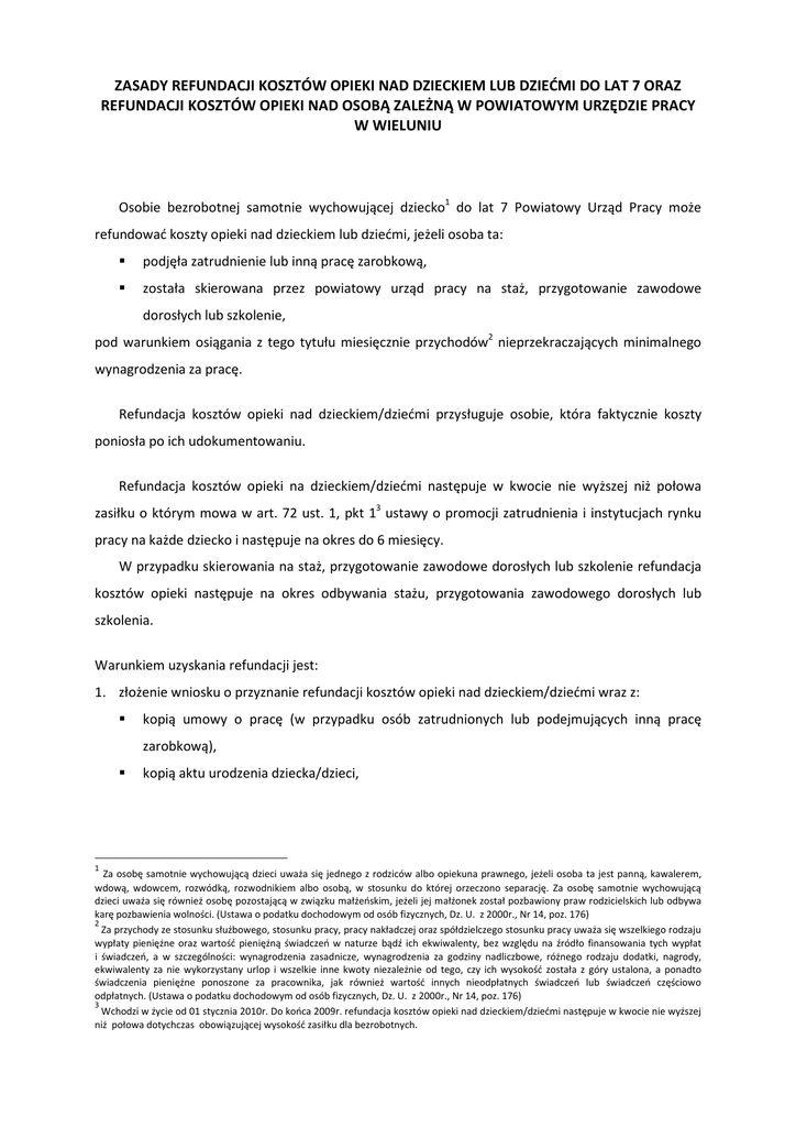 ZASADY REFUNDACJI KOSZTÓW OPIEKI NAD DZIECKIEM LUB DZIEĆMI DO LAT 7 ORAZ REFUNDACJI KOSZTÓW OPIEKI NAD OSOBĄ ZALEŻNĄ W POWIATOWYM URZĘDZIE PRACY W WIELUNIU Osobie bezrobotnej samotnie wychowującej dziecko1 do lat 7 Powiatowy Urząd Pracy może refundować koszty opieki nad dzieckiem lub dziećmi, jeżeli osoba ta: podjęła zatrudnienie lub inną pracę zarobkową, została skierowana przez powiatowy urząd pracy na staż, przygotowanie zawodowe dorosłych lub szkolenie, pod warunkiem osiągania z tego tytułu miesięcznie przychodów2 nieprzekraczających minimalnego wynagrodzenia za pracę. Refundacja kosztów opieki nad dzieckiem/dziećmi przysługuje osobie, która faktycznie koszty poniosła po ich udokumentowaniu. Refundacja kosztów opieki na dzieckiem/dziećmi następuje w kwocie nie wyższej niż połowa zasiłku o którym mowa w art. 72 ust. 1, pkt 13 ustawy o promocji zatrudnienia i instytucjach rynku pracy na każde dziecko i następuje na okres do 6 miesięcy. W przypadku skierowania na staż, przygotowanie zawodowe dorosłych lub szkolenie refundacja kosztów opieki następuje na okres odbywania stażu, przygotowania zawodowego dorosłych lub szkolenia. Warunkiem uzyskania refundacji jest: 1. złożenie wniosku o przyznanie refundacji kosztów opieki nad dzieckiem/dziećmi wraz z: kopią umowy o pracę (w przypadku osób zatrudnionych lub podejmujących inną pracę zarobkową), 1 kopią aktu urodzenia dziecka/dzieci, Za osobę samotnie wychowującą dzieci uważa się jednego z rodziców albo opiekuna prawnego, jeżeli osoba ta jest panną, kawalerem, wdową, wdowcem, rozwódką, rozwodnikiem albo osobą, w stosunku do której orzeczono separację. Za osobę samotnie wychowującą dzieci uważa się również osobę pozostającą w związku małżeńskim, jeżeli jej małżonek został pozbawiony praw rodzicielskich lub odbywa karę pozbawienia wolności. (Ustawa o podatku dochodowym od osób fizycznych, Dz. U. z 2000r., Nr 14, poz. 176) 2 Za przychody ze stosunku służbowego, stosunku pracy, pracy nakładczej oraz spółdzielczego stosunku pracy uważa się wszelkiego rodzaju wypłaty pieniężne oraz wartość pieniężną świadczeń w naturze bądź ich ekwiwalenty, bez względu na źródło finansowania tych wypłat i świadczeń, a w szczególności: wynagrodzenia zasadnicze, wynagrodzenia za godziny nadliczbowe, różnego rodzaju dodatki, nagrody, ekwiwalenty za nie wykorzystany urlop i wszelkie inne kwoty niezależnie od tego, czy ich wysokość została z góry ustalona, a ponadto świadczenia pieniężne ponoszone za pracownika, jak również wartość innych nieodpłatnych świadczeń lub świadczeń częściowo odpłatnych. (Ustawa o podatku dochodowym od osób fizycznych, Dz. U. z 2000r., Nr 14, poz. 176) 3 Wchodzi w życie od 01 stycznia 2010r. Do końca 2009r. refundacja kosztów opieki nad dzieckiem/dziećmi następuje w kwocie nie wyższej niż połowa dotychczas obowiązującej wysokość zasiłku dla bezrobotnych. zaświadczeniem o uczęszczaniu dziecka/dzieci do żłobka, przedszkola, szkoły lub innej placówki zajmującej się opieką nad dziećmi wraz z zaznaczeniem od kiedy uczęszcza do w/w placówek lub kopią umowy zawartej z opiekunką, dokumentami potwierdzającymi bycie osobą samotnie wychowującą dziecko/dzieci (kopia sentencji wyroku orzekającego rozwód lub separację, kopia aktu zgonu małżonka); 2. złożenia co miesiąc – do 5 dnia każdego miesiąca za miesiąc poprzedni – rozliczenia faktycznie poniesionych kosztów opieki nad dzieckiem/dziećmi wraz z: dokumentami potwierdzającymi poniesienie w/w kosztów (rachunek/faktura, pokwitowanie zapłaty), kopią listy obecności wraz z zaświadczeniem od pracodawcy o wysokości osiąganych przychodów. W przypadku dokonywania refundacji za niepełny miesiąc, zwrot naliczany będzie proporcjonalnie do liczby dni, za które przysługuje refundacja. Na wniosek osoby bezrobotnej urząd może wypłacić zaliczkę na refundację kosztów opieki nad dzieckiem/dziećmi. Na opisanych wyżej zasadach może nastąpić refundacja kosztów opieki nad osobą zależną.4 4 Oznacza to osobę wymagającą ze względu na stan zdrowia lub wiek stałej opieki, połączoną więzami rodzinnymi lub powinowactwem z osobą objętą usługami lub instrumentami rynku pracy lub pozostającą z nią we wspólnym gospodarstwie domowym. (Ustawa o promocji zatrudnienia i instytucjach rynku pracy, Dz. U. z 2008r. Nr 69, poz. 415 z późn. zm.)