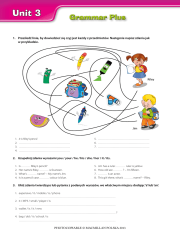 Unit 3 Grammar Plus 1. Prześledź linie, by dowiedzieć się czyj jest każdy z przedmiotów. Następnie napisz zdania jak w przykładzie. Riley Jim 1. 2. 3. 4. It is Riley’s pencil. …………………………………………… …………………………………………… …………………………………………… 5. …………………………………………… 6. …………………………………………… 7. …………………………………………… 2. Uzupełnij zdania wyrazami you / your / he / his / she / her / it / its. 1. 2. 3. 4. Is ……… Riley’s pencil? Her name’s Riley. ……… is fourteen. What’s ……… name? – My name’s Jim. Is it a pencil case. ……… colour is blue. 5. 6. 7. 8. Jim has a ruler. ……… ruler is yellow. How old are ……… ? – I’m fifteen. ……… is an actor. This girl there, what’s ……… name? – Riley. 3. Ułóż zdania twierdzące lub pytania z podanych wyrazów, we właściwym miejscu dodając ‘a’ lub ‘an’. 1. expensive / it / mobile / is / phone …………………………………………………………………………………… 2. it / MP3 / small / player / is …………………………………………………………………………………… 3. wallet / is / it / new …………………………………………………………………………………… ? 4. bag / old / it / school / is …………………………………………………………………………………… 1 PHOTOCOPIABLE © MACMILLAN POLSKA 2013 Unit 3 Grammar Plus Answer key 1. Prześledź linie, by dowiedzieć się czyj jest każdy z przedmiotów. Następnie napisz zdania jak w przykładzie. Riley Jim 1. 2. 3. 4. 5. It is Riley’s glue stick. 6. It is Jim’s pencil case. 7. It is Jim and Riley’s marker. It is Riley’s pencil. It is Riley’s pen. It is Jim’s ruler. It is Jim’s school bag. 2. Uzupełnij zdania wyrazami you / your / he / his / she / her / it / its. 1. 2. 3. 4. Is it Riley’s pencil? Her name’s Riley. She is fourteen. What’s her name? – My name’s Jim. Is it a pencil case. Its colour is blue. 5. 6. 7. 8. Jim has a ruler. His ruler is yellow. How old are you ? – I’m fifteen. He is an actor. This girl there, what’s her name? – Riley. 3. Ułóż zdania twierdzące lub pytania z podanych wyrazów, we właściwym miejscu dodając ‘a’ lub ‘an’. 1. expensive / it / mobile / is / phone It is an expensive mobile phone. 2. it / MP3 / small / player / is It is a small MP3 player. 3. wallet / is / it / new Is it a new wallet? 4. bag / old / it / school / is It is an old school bag. 2 PHOTOCOPIABLE © MACMILLAN POLSKA 2013