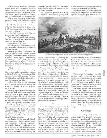 Wykrwawione bataliony walczące w pierwszej linii wymagały wzmocnienia. W sukurs ruszyły im stojące dotąd w odwodzie: 2. batalion strzelców austriackich oraz złożony z Włochów 1. batalion strzelców rzymskich. Zanim oba oddziały wzmocniły pierwszą linię, gen. Pimodan wydał rozkaz wznowienia szturmu. Niestety, chwilę potem kula raniła go w twarz. Nie zsiadając z konia opatrzył prowizorycznie ranę i krzyknął do swoich żołnierzy: – Odwagi, moje dzieci! Bóg jest z nami! Naprzód! Na bagnety! Pod wrażeniem dzielnej postawy dowódcy z piersi jego podkomendnych wyrwał się okrzyk: – Niech żyje Pimodan!! – Nie krzyczeć! Maszerować! – odparł dowódca, wskazując szablą kierunek natarcia. Niestety po chwili otrzymał kolejny, drugi postrzał, krótko potem następny. Wreszcie kolejna kula wystrzelona przez agenta piemonckiego ukrytego w szeregach papieskich przeszyła mu pierś. Spadając z siodła, śmiertelnie ranny, krzyknął jeszcze do żołnierzy: – Bóg jest z nami! Tymczasem kontrolujący przebieg bitwy zza rzeki Lamoriciere ruszył w kierunku farmy. Po drodze spotkał żołnierzy niosących rannego Pimodana. Zbliżył się do bohaterskiego generała, by uścisnąć mu rękę. – Generale! Biją się jak bohaterowie! – mówił z wysiłkiem ranny dowódca. – Honor Kościoła ocalony! Bądź zdrów! Niestety, optymizm dzielnego generała nie miał uzasadnienia w aktualnej sytuacji na placu boju. Oddziałom walczącym zaczynało brakować sił. Na rozkaz Lamoriciere’a w kierunku Musone ruszyła ostatnia rezerwa – pułk Szwajcarów. Niestety, słabo wyszkolone bataliony nie potrafiły przejść pozostającej pod ostrzałem rzeki. Widok wybuchających w szyku granatów siejących śmierć i zniszczenie dla niedoświadczonych żołnierzy był ponad siły. Ogarnęła ich panika i rzucili się do ucieczki. Na domiar złego, rejteradę Szwajcarów zauważyli będący już na wzgórzu żołnierze 1. baonu strzelców rzymskich. Widok uciekających rezerw wpłynął na nich demoralizująco. Nagle i oni rzucili się biegiem w dół. Po drodze spanikowane oddziały po- ciągnęły za sobą oddział artylerzystów, którzy pierzchli pozostawiając działa na łaskę losu. Na szczęście panice nie uległ 2. batalion dowodzony przez mjr. ko ranni towarzysze broni, bohaterscy obrońcy postanowili się poddać. Mało brakowało, a skończyłoby się to dla nich tragicznie. Rozwścieczeni oporem Piemontczycy rzucili się na Włoska artyleria prowadzi ostrzał farmy zajętej przez oddziały papieskie Fuchmanna złożony z żołnierzy rekrutowanych na terenach cesarstwa austriackiego (w jego skład wchodziła liczna grupa chłopów z Galicji). Z wielką brawurą wsparł on oddziały walczące w pierwszej linii. Był na to najwyższy czas. Szeregi Franko-Belgów były już mocno przetrzebione. Dowodzący półbatalionem Becdelievre rozporządzał już tylko 90 ludźmi z prawie 300, którzy wyszli z Loreto. Wspierali ich także Irlandczycy oraz niezdemoralizowane bataliony strzelców szwajcarskich i włoskich. Papieskim udało się chwilowo zatrzymać parcie oddziałów piemonckich, co umożliwiło wycofanie własnych sił na płaskowyż. Wśród nich był pododdział kanonierów ciągnących działa własnymi rękami. Odwrót osłaniali ludzie Fuchmanna odpierając ataki piemonckich lansjerów. *** Gdy triumfujący żołnierze Cialdiniego wkroczyli na teren farmy w Crocettie, nagle z okien zabudowań posypały się na nich kule karabinowe. Okazało się, że byli tu jeszcze FrankoBelgowie, do których w zamieszaniu bitewnym nie dotarł rozkaz wycofania się. Pod ogniem z karabinów napastnicy musieli się zatrzymać. Niestety, wkrótce na terenie farmy zaczęły wybuchać pociski artyleryjskie wzniecające pożary. Gdy płomienie zagroziły szopie, w której leżeli cięż- obrońców farmy, by ich wymordować. Na szczęście interweniował znajdujący się tam jako jeniec oficer o nazwisku Tromboni, któremu udało się odwieść rodaków od dokonania zbrodni wojennej. *** Tymczasem wycofujące się siły główne wojsk papieskich powróciły do Loreto. Piemontczycy nie ścigali ich. Obawiali się zasadzki. Z ponad 5 tys. żołnierzy papieskich, którzy rano opuścili miasto, wieczorem wróciło do niego zaledwie ok. 2000. Nie było wśród nich naczelnego wodza. Gen. Krzysztof Lamoriciere postanowił pozostawić rozbitą armię na miejscu, a sam na czele szczupłego oddziału udał się do Ankony. Takie rozwiązanie uznał za niezbędne, ponieważ obawiał się, że sprowadzenie pobitej armii do oblężonej twierdzy może odbić się ujemnie na morale załogi. Kapitulacja Noc po bitwie pod Castelfidardo wojska papieskie spędziły w Loreto. Honorowy posterunek (znajdujący się najbliżej wojsk piemonckich) przy bramie Recanati objęli Irlandczycy z Legionu św. Patryka oraz Polacy służący pod komendą Fuchmanna. Rano 19 września Cialdini rozpoczął manewr okrążania miasta. Mimo y e Leanto 2-3 (26-27) 2010 – st. 17