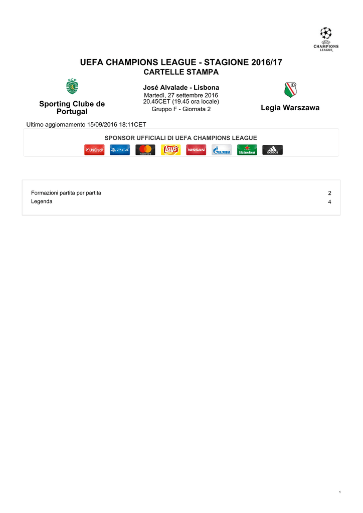 UEFA CHAMPIONS LEAGUE - STAGIONE 2016/17 CARTELLE STAMPA José Alvalade - Lisbona Sporting Clube de Portugal Martedì, 27 settembre 2016 20.45CET (19.45 ora locale) Gruppo F - Giornata 2 Legia Warszawa Ultimo aggiornamento 15/09/2016 18:11CET SPONSOR UFFICIALI DI UEFA CHAMPIONS LEAGUE Formazioni partita per partita 2 Legenda 4 1 Sporting Clube de Portugal - Legia Warszawa Martedì 27 settembre 2016 - 20.45CET (19.45 ora locale) Cartella stampa José Alvalade, Lisbona Formazioni partita per partita Sporting Clube de Portugal UEFA Champions League - Fase a gironi Gruppo F Club G V P S RF GS P.ti Borussia Dortmund 1 1 0 0 6 0 3 Real Madrid CF 1 1 0 0 2 1 3 Legia Warszawa 1 0 0 1 0 6 0 Sporting Clube de Portugal 1 0 0 1 1 2 0 Giornata 1 (14/09/2016) Real Madrid CF 2-1 Sporting Clube de Portugal Reti: 0-1 Bruno César 48, 1-1 Ronaldo 89, 2-1 Morata 90+4 Sporting Clube de Portugal: Rui Patrício, Ruiz (92 Campbell), Bruno César, Coates, William Carvalho, João Pereira, Adrien Silva (73 Elías), Dost, Zeegelaar, Ruben Semedo, Gelson Martins (70 Marković) Giornata 2 (27/09/2016) Sporting Clube de Portugal-Legia Warszawa Giornata 3 (18/10/2016) Sporting Clube de Portugal-Borussia Dortmund Giornata 4 (02/11/2016) Borussia Dortmund-Sporting Clube de Portugal Giornata 5 (22/11/2016) Sporting Clube de Portugal-Real Madrid CF Giornata 6 (07/12/2016) Legia Warszawa-Sporting Clube de Portugal Legia Warszawa UEFA Champions League - Secondo turno di qualificazione (12/07/2016) HŠK Zrinjski 1-1 Legia Warszawa Reti: 0-1 Nikolić 49, 1-1 Katanec 57 Legia Warszawa: Malarz (46 Cierzniak), Jodłowiec, Lewczuk, Guilherme, Duda (60 Alexandrov), Nikolić (76 Prijovic), Hloušek, Kucharczyk, Rzeźniczak, Broź, Moulin (19/07/2016) Legia Warszawa 2-0 HŠK Zrinjski (tot: 3-1) Reti: 1-0 Nikolić 28 (R) , 2-0 Nikolić 62 Legia Warszawa: Malarz, Pazdan, Jodłowiec, Lewczuk, Guilherme (15 Hämäläinen), Nikolić (75 Kopczyński), Hloušek, Kucharczyk (84 Brzyski), Broź, Moulin, Alexandrov Terzo turno preliminare (27/07/2016) FK AS Trenčín 0-1 Legia Warszawa Reti: 0-1 Nikolić 69 Legia Warszawa: Malarz, Pazdan, Jodłowiec (85 Hämäläinen), Lewczuk, Nikolić (75 Prijovic), Kopczyński, Brzyski, Kucharczyk, Bereszyński, Moulin, Alexandrov (89 Broź) (03/08/2016) Legia Warszawa 0-0 FK AS Trenčín (tot: 1-0) Legia Warszawa: Malarz, Pazdan, Jodłowiec, Lewczuk, Langil (69 Alexandrov), Nikolić (78 Prijovic), Hloušek, 2 Sporting Clube de Portugal - Legia Warszawa Cartella stampa Martedì 27 settembre 2016 - 20.45CET (19.45 ora locale) José Alvalade, Lisbona Kopczyński, Kucharczyk, Bereszyński (56 Broź), Moulin Spareggi (17/08/2016) Dundalk FC 0-2 Legia Warszawa Reti: 0-1 Nikolić 56 (R) , 0-2 Prijovic 90+4 Legia Warszawa: Malarz, Pazdan, Jodłowiec, Lewczuk, Langil (88 Alexandrov), Odjidja (76 Kopczyński), Nikolić (83 Prijovic), Hloušek, Kucharczyk, Broź, Moulin (23/08/2016) Legia Warszawa 1-1 Dundalk FC (tot: 3-1) Reti: 0-1 Benson 19, 1-1 Kucharczyk 90+2 Legia Warszawa: Malarz, Pazdan, Jodłowiec, Lewczuk, Langil (65 Guilherme), Odjidja, Nikolić (71 Bereszyński), Hloušek, Kucharczyk, Broź, Moulin (93 Prijovic) Fase a gironi Giornata 1 (14/09/2016) Legia Warszawa 0-6 Borussia Dortmund Reti: 0-1 Götze 7, 0-2 Papastathopoulos 15, 0-3 Bartra 17, 0-4 Raphaël Guerreiro 51, 0-5 Castro 76, 0-6 Aubameyang 87 Legia Warszawa: Malarz, Jodłowiec, Czerwiński, Dąbrowski, Guilherme, Langil, Odjidja, Kazaishvili (66 Alexandrov), Bereszyński, Moulin (76 Radović), Prijovic (63 Nikolić) Giornata 2 (27/09/2016) Sporting Clube de Portugal-Legia Warszawa Giornata 3 (18/10/2016) Real Madrid CF-Legia Warszawa Giornata 4 (02/11/2016) Legia Warszawa-Real Madrid CF Giornata 5 (22/11/2016) Borussia Dortmund-Legia Warszawa Giornata 6 (07/12/2016) Legia Warszawa-Sporting Clube de Portugal 3 Sporting Clube de Portugal - Legia Warszawa Martedì 27 settembre 2016 - 20.45CET (19.45 ora locale) Cartella stampa José Alvalade, Lisbona Legenda Statistiche di tutti i tempi I dati statistici di tutti i tempi delle squadre partecipanti alle competizioni UEFA per club. Competizioni UEFA per club: Si tratta dei dati considerati validi per elaborare le statistiche ufficiali delle competizioni UEFA per club, ossia Coppa dei Campioni, UEFA Champions League, UEFA Europa League, Coppa delle Coppe UEFA, Supercoppa UEFA (dal 1973), Coppa UEFA Intertoto, Coppa Intercontinentale. La Coppa delle Fiere non viene inclusa, così come la Supercoppa del 1972, dato che non si sono tenute sotto la supervisione UEFA, mentre la Coppa del Mondo per Club FIFA è esclusa. Direttori di gara UCL: Gare totali arbitrate in UEFA Champions League dalla stagione 1992/93, solo dalla fase a gironi alla finale. Le partite in cui l'arbitro interessato ha svolto la funzione di quarto uomo non sono incluse in questa statistica. Si tratta dei dati considerati validi per elaborare le statistiche ufficiali della competizione. UEFA: Gare totali arbitrate nelle competizioni UEFA per club compresi tutti i turni di qualificazione. Le partite in cui l'arbitro interessato ha svolto la funzione di quarto uomo non sono incluse in questa statistica. Si tratta dei dati considerati validi per elaborare le statistiche ufficiali della competizione. Competizioni Competizioni Club Competizioni per squadre nazionali UCL: UEFA Champions League ECCC: Coppa dei Campioni UEL: UEFA Europa League UCUP: Coppa UEFA UCWC: Coppa delle Coppe UEFA SCUP: Supercoppa UEFA UIC: Coppa UEFA Intertoto ICF: Coppa delle Fiere EURO: Campionati europei UEFA Mondiali: Coppa del Mondo FIFA CONFCUP: FIFA Confederations Cup Amic: Amichevoli Amic U21: Amichevoli Under-21 U21: Campionato Europeo UEFA Under 21 U17: Europei Under 17 U16: Europei Under 16 U19: Europei Under 19 U18: Europei Under 18 WWC: FIFA Women's World Cup WEURO: Campionati Europei femminili UEFA Fasi della competizione Altre abbreviazioni F: Finale Grp 1: Prima fase a gironi 3TP: Terzo turno preliminare 2TU: Secondo turno 4TU: Quarto turno 1/2: Semifi