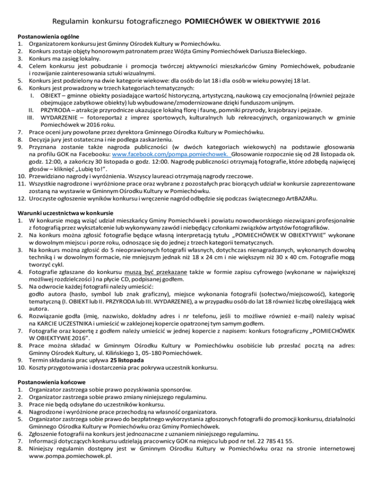 Regulamin konkursu fotograficznego POMIECHÓWEK W OBIEKTYWIE 2016 Postanowienia ogólne 1. Organizatorem konkursu jest Gminny Ośrodek Kultury w Pomiechówku. 2. Konkurs zostaje objęty honorowym patronatem przez Wójta Gminy Pomiechówek Dariusza Bieleckiego. 3. Konkurs ma zasięg lokalny. 4. Celem konkursu jest pobudzanie i promocja twórczej aktywności mieszkańców Gminy Pomiechówek, pobudzanie i rozwijanie zainteresowania sztuki wizualnymi. 5. Konkurs jest podzielony na dwie kategorie wiekowe: dla osób do lat 18 i dla osób w wieku powyżej 18 lat. 6. Konkurs jest prowadzony w trzech kategoriach tematycznych: I. OBIEKT – gminne obiekty posiadające wartość historyczną, artystyczną, naukową czy emocjonalną (również pejzaże obejmujące zabytkowe obiekty) lub wybudowane/zmodernizowane dzięki funduszom unijnym. II. PRZYRODA – atrakcje przyrodnicze ukazujące lokalną florę i faunę, pomniki przyrody, krajobrazy i pejzaże. III. WYDARZENIE – fotoreportaż z imprez sportowych, kulturalnych lub rekreacyjnych, organizowanych w gminie Pomiechówek w 2016 roku. 7. Prace oceni jury powołane przez dyrektora Gminnego Ośrodka Kultury w Pomiechówku. 8. Decyzja jury jest ostateczna i nie podlega zaskarżeniu. 9. Przyznana zostanie także nagroda publiczności (w dwóch kategoriach wiekowych) na podstawie głosowania na profilu GOK na Facebooku: www.facebook.com/pompa.pomiechowek. Głosowanie rozpocznie się od 28 listopada ok. godz. 12:00, a zakończy 30 listopada o godz. 12:00. Nagrodę publiczności otrzymają fotografie, które zdobędą najwięcej głosów – kliknięć „Lubię to!”. 10. Przewidziano nagrody i wyróżnienia. Wszyscy laureaci otrzymają nagrody rzeczowe. 11. Wszystkie nagrodzone i wyróżnione prace oraz wybrane z pozostałych prac biorących udział w konkursie zaprezentowane zostaną na wystawie w Gminnym Ośrodku Kultury w Pomiechówku. 12. Uroczyste ogłoszenie wyników konkursu i wręczenie nagród odbędzie się podczas świątecznego ArtBAZARu. Warunki uczestnictwa w konkursie 1. W konkursie mogą wziąć udział mieszkańcy Gminy Pomiechówek i powiatu nowodworskiego niezwiązani profesjonalnie z fotografią przez wykształcenie lub wykonywany zawód i niebędący członkami związków artystów fotografików. 2. Na konkurs można zgłosić fotografie będące własną interpretacją tytułu „POMIECHÓWEK W OBIEKTYWIE” wykonane w dowolnym miejscu i porze roku, odnoszące się do jednej z trzech kategorii tematycznych. 3. Na konkurs można zgłosić do 5 nieoprawionych fotografii własnych, dotychczas nienagradzanych, wykonanych dowolną techniką i w dowolnym formacie, nie mniejszym jednak niż 18 x 24 cm i nie większym niż 30 x 40 cm. Fotografie mogą tworzyć cykl. 4. Fotografie zgłaszane do konkursu muszą być przekazane także w formie zapisu cyfrowego (wykonane w największej możliwej rozdzielczości ) na płycie CD, podpisanej godłem. 5. Na odwrocie każdej fotografii należy umieścić: godło autora (hasło, symbol lub znak graficzny), miejsce wykonania fotografii (sołectwo/miejscowość), kategorię tematyczną (I. OBIEKT lub II. PRZYRODA lub III. WYDARZENIE), a w przypadku osób do lat 18 również liczbę określającą wiek autora. 6. Rozwiązanie godła (imię, nazwisko, dokładny adres i nr telefonu, jeśli to możliwe również e-mail) należy wpisać na KARCIE UCZESTNIKA i umieścić w zaklejonej kopercie opatrzonej tym samym godłem. 7. Fotografie oraz kopertę z godłem należy umieścić w jednej kopercie z napisem: konkurs fotograficzny „POMIECHÓWEK W OBIEKTYWIE 2016”. 8. Prace można składać w Gminnym Ośrodku Kultury w Pomiechówku osobiście lub przesłać pocztą na adres: Gminny Ośrodek Kultury, ul. Kilińskiego 1, 05-180 Pomiechówek. 9. Termin składania prac upływa 25 listopada 10. Koszty przygotowania i dostarczenia prac pokrywa uczestnik konkursu. Postanowienia końcowe 1. Organizator zastrzega sobie prawo pozyskiwania sponsorów. 2. Organizator zastrzega sobie prawo zmiany niniejszego regulaminu. 3. Prace nie będą odsyłane do uczestników konkursu. 4. Nagrodzone i wyróżnione prace przechodzą na własność organizatora. 5. Organizator zastrzega sobie prawo do bezpłatnego wykorzystania zgłoszonych fotografii do promocji konkursu, działalności Gminnego Ośrodka Kultury w Pomiechówku oraz Gminy Pomiechówek. 6. Zgłoszenie fotografii na konkurs jest jednoznaczne z uznaniem niniejszego regulaminu. 7. Informacji dotyczących konkursu udzielają pracownicy GOK na miejscu lub pod nr tel. 22 785 41 55. 8. Niniejszy regulamin dostępny jest w Gminnym Ośrodku Kultury w Pomiechówku oraz na stronie internetowej www.pompa.pomiechowek.pl.