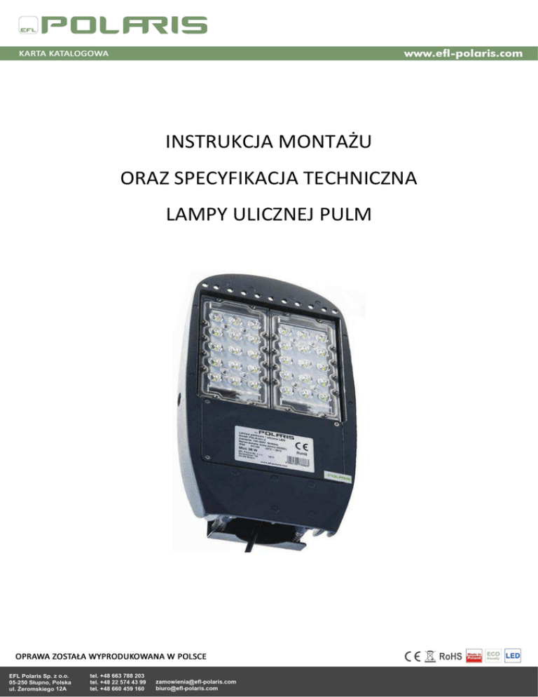 INSTRUKCJA MONTAŻU ORAZ SPECYFIKACJA TECHNICZNA LAMPY ULICZNEJ PULM POSTANOWIENIA OGÓLNE 1. Podłączenie opraw do sieci mogą wykonywać tylko osoby z odpowiednimi uprawnieniami. 2. Dokonywanie jakichkolwiek czynności wewnątrz oprawy przy włączonym zasilaniu grozi porażeniem elektrycznym. 3. Producent nie ponosi odpowiedzialności za wady wynikłe z niestosowania zaleceń niniejszej Instrukcji. 4. Producent zastrzega sobie możliwość zmian konstrukcji produktu. 5. Nie instalować oprawy w pomieszczeniach pozbawionych obiegu powietrza. 6. Aby zachować bezpieczeństwo funkcjonowania oprawy, należy postępować zgodnie z instrukcją montażu. PRZEZNACZENIE I CHARAKTERYSTYKA URZĄDZENIA Lampa PULM jest najlepszym rozwiązaniem do oświetlania terenów zewnętrznych, dróg, placów, parków, alejek. Z uwagi na niewielkie rozmiary i jednocześnie bardzo wysoką skuteczność świetlna świetnie nadaje się do oświetlania obiektów typu hale i magazyny przemysłowe. Obudowa oprawy jest przystosowana do montażu zarówno na słupach jak i zwieszania. Zamontowane w oprawie wysokowydajne źródło światła wykorzystujące diody LED najlepszego światowego producenta tego typu rozwiązań – firmy CREE oraz specjalistyczny zasilacz pozwalają na osiągnięcie ponad 50 000 godzin czasu bezawaryjnej pracy całej oprawy. Oprawa gwarantuje szczelność na poziomie IP 65, dzięki zespołowi uszczelek oraz specjalnej konstrukcji samej obudowy. Oprawa jest dostępna z soczewkami, które zapewniają asymetryczny kąt świecenia 140 O x 80 O, z odchyleniem 25O. BUDOWA LAMPY PULM – ELEMENTY SKŁADOWE Oprawa lampy składa się z jednolitego odlewu aluminiowego. Dzięki żeberkowanej tylnej powierzchni zapewnia doskonałe warunki chłodzenia diodom LED umieszczonym na przedniej powierzchni obudowy. Uszczelnienie komory zasilacza oraz soczewek silikonowymi uszczelkami, zapewnia szczelność całej oprawy w klasie IP65. Poniżej zamieszczono zdjęcia oprawy wraz z opisem komponentów. 1. Korpus lampy 2. Płytki PCB z diodami LED oraz soczewki 2 3. Komora zasilacza 3 4 4. Tabliczka znamionowa oprawy 5. Jarzmo mocujące wraz z śrubami 1 dociskającymi 6. Przewód zasilający – 230V AC (L, N, PE) 5 6 7 7. Złącze hermetyczna, 3-polowe Montaż oprawy Podczas montażu oprawy niezbędne są: klucz imbusowy 6, narzędzie do ściągania izolacji, śrubokręt krzyżakowy, klucz płaski I. Za pomocą klucza nimbusowego poluzować śruby w jarzmie mocującym, tak by możliwe było zamocowanie oprawy na słupie lub innym uchwycie II. Dokonać połączenie przewodu zasilającego lampę z przewozem zasilającym słup zgodnie z instrukcją poniżej 1. Rozłożyć dołączoną do oprawy złączkę hermetyczną. Przeprowadzić przewody jak na załączonym rysunku 2. Dokonać połączenia żył przewodów za pomocą 3-polowej kostki łączeniowej znajdującej się wewnątrz złączki – obowiązkowe uziemienie 3. Wsunąć kostkę do wnętrza złączki. 4. Skręcić złączkę zgodnie z rysunkiem 4, za pomocą klucza , z siłą około 2,5Nm 5. Wsunąć gumki dławnicy uszczelniającej pomiędzy przewód a zaciski złączki. 6. Nakręcić nakrętki dławnicy 7. Za pomocą kluczy, z umiarkowaną siłą dokręcić nakrętki III. IV. V. Nałożyć oprawę na słup / rurę mocującą Delikatnie dokręcając śruby nimbusowe jarzma, dokonać ustawienia oprawy w odpowiednim kierunku świecenia Mocno skręcić śruby jarzma, uniemożliwiając obrót oprawy na słupie UWAGA: Podczas podłączania należy upewnić się czy wyłączone zostało główne źródło zasilania. SPEFYFIKACJA TECHNICZNA model moc strumień świetlny barwa światła PULM-031-Z 36 W 4 150 lm PULM-041-Z 46 W 4 750 lm PULM-051-Z 56 W 5 286 lm 3 000 - 4 000 K lub 5 000 - 7 000 K zasilanie 100-265V AC / 50 - 60Hz współczynnik mocy cos φ >0,95 typ diody LED Cree XT-E Ilość diod LED 30 wskaźnik oddawania barw Ra ≥ 75** O 140 x 80 , odchylenie 25O kąt świecenia O temperatura robocza - 40°C do + 50°C temperatura przechowywania -30°C do + 70°C żywotność >50 000 h wskaźnik IP 65 obudowa materiał aluminium, PMMA wymiary 340x190x65 masa gwarancja opcja 3kg 2 lata 5 lat gwarancji sensor ruchu / zmierzchu * przy składaniu zamówienia prosimy podać żądaną barwę światła ** CRI>75, 80, 90 – dostępne na zamówienie Wymiary oprawy Lampy z serii PULM zgodne są z: • Ustawą z dnia 13 kwietnia 2007r. o kompatybilności elektromagnetycznej. • Rozporządzeniem Ministra Gospodarki z dnia 21 sierpnia 2007 r. w sprawie zasadniczych wymagań dla sprzętu elektrycznego Lampy spełniają wymagania norm: • PN-EN 61547:2009, Sprzęt do ogólnych celów oświetleniowych -- Wymagania dotyczące kompatybilności elektromagnetycznej • PN-EN 60598-1:2007, Oprawy oświetleniowe – Część 1: Wymagania ogólne i badania; • PN-EN 61000-3-2:2007, Kompatybilność elektromagnetyczna (EMC) -- Część 3-2: Poziomy dopuszczalne Poziomy dopuszczalne emisji harmonicznych prądu (fazowy prąd zasilający odbiornika < lub = 16 A) • PN-EN 61000-3-3:2011, Kompatybilność elektromagnetyczna (EMC) -- Część 3-3: Poziomy dopuszczalne Ograniczanie zmian napięcia, wahań napięcia i migotania światła w publicznych sieciach zasilających niskiego napięcia, powodowanych przez odbiorniki o fazowym prądzie znamionowym < lub = 16 A przyłączone bezwarunkowo • PN-EN 55015:2007, Poziomy dopuszczalne i metody pomiarów zaburzeń radioelektrycznych wytwarzanych przez elektryczne urządzenia oświetleniowe i urządzenia podobne. • PN-EN 60529:2003, Stopnie ochrony zapewnianej przez obudowy (Kod IP). • PN-EN 62031:2010+A1:2013, Moduły LED do ogólnych celów oświetleniowych -- Wymagania bezpieczeństwa” zharmonizowanych z następującymi Dyrektywami Unii Europejskiej: • Dyrektywa Kompatybilności Elektromagnetycznej EMC - 2004/108/WE • Dyrektywa Niskonapięciowa LVD - 2006/95/WE KONSERWACJA ORAZ ZASADY EKSPLOATACJI Lampy z serii PULM są prak