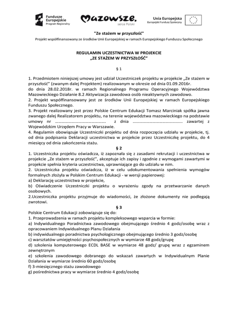 "Ze stażem w przyszłość" Projekt współfinansowany ze środków Unii Europejskiej w ramach Europejskiego Funduszu Społecznego REGULAMIN UCZESTNICTWA W PROJEKCIE „ZE STAŻEM W PRZYSZŁOŚĆ” §1 1. Przedmiotem niniejszej umowy jest udział Uczestniczek projektu w projekcie „Ze stażem w przyszłość” (zwanym dalej Projektem) realizowanym w okresie od dnia 01.09.2016r. do dnia 28.02.2018r. w ramach Regionalnego Programu Operacyjnego Województwa Mazowieckiego Działanie 8.2 Aktywizacja zawodowa osób nieaktywnych zawodowo. 2. Projekt współfinansowany jest ze środków Unii Europejskiej w ramach Europejskiego Funduszu Społecznego. 3. Projekt realizowany jest przez Polskie Centrum Edukacji Tomasz Marciniak spółka jawna zwanego dalej Realizatorem projektu, na terenie województwa mazowieckiego na podstawie umowy nr ………………………………………. z dnia ……………………………………... zawartej z Wojewódzkim Urzędem Pracy w Warszawie. 4. Regulamin obowiązuje Uczestniczki projektu od dnia rozpoczęcia udziału w projekcie, tj. od dnia podpisania Deklaracji uczestnictwa w projekcie przez Uczestniczkę projektu, do 4 miesięcy od dnia zakończenia stażu. §2 1. Uczestniczka projektu oświadcza, iż zapoznała się z zasadami rekrutacji i uczestnictwa w projekcie „Ze stażem w przyszłość”, akceptuje ich zapisy i zgodnie z wymogami zawartymi w projekcie spełnia kryteria uczestnictwa, uprawniające go do udziału w nim. 2. Uczestniczka projektu oświadcza, iż w celu udokumentowania spełnienia wymogów formalnych złożyła w Polskim Centrum Edukacji - w wersji papierowej: a) Deklarację uczestnictwa w projekcie, b) Oświadczenie Uczestniczki projektu o wyrażeniu zgody na przetwarzanie danych osobowych. 2.Uczestniczka projektu przyjmuje do wiadomości, że złożone dokumenty nie podlegają zwrotowi. §3 Polskie Centrum Edukacji zobowiązuje się do: 1. Przeprowadzenia w ramach projektu kompleksowego wsparcia w formie: a) Indywidualnego Poradnictwa zawodowego obejmującego średnio 4 godz/osobę wraz z opracowaniem Indywidualnego Planu Działania b) indywidualnego poradnictwa psychologicznego obejmującego średnio 3 godz/osobę c) warsztatów umiejętności psychospołecznych w wymiarze 48 godz/grupę d) szkolenia komputerowego ECDL BASE w wymiarze 48 godz/ grupę wraz z egzaminem zewnętrznym e) szkolenia zawodowego dobranego do wskazań zawartych w Indywidualnym Planie Działania w wymiarze średnio 60 godz/osobę f) 3-miesięcznego stażu zawodowego g) pośrednictwa pracy w wymiarze średnio 4 godz/osobę "Ze stażem w przyszłość" Projekt współfinansowany ze środków Unii Europejskiej w ramach Europejskiego Funduszu Społecznego 2. Zapewnienia zaplecza lokalowego, technicznego i kadrowego, niezbędnego do realizacji projektu. 3. Wypłaty stypendium szkoleniowego na podstawie imiennych list obecności Uczestniczki projektu biorącej udział w szkoleniu. 4. Wypłaty stypendium stażowego na podstawie imiennych list obecności Uczestniczki projektu na stażu. §4 1. Uczestniczka projektu akceptuje terminy i miejsca wyznaczone przez Realizatora projektu oraz zobowiązuje się do: a) udziału w pełnej ścieżce aktywizacji w ramach projektu oraz do bieżącego informowania Polskiego Centrum Edukacji o wszystkich zdarzeniach, mogących zakłócić lub uniemożliwić dalszy udział w projekcie, b) regularnego, punktualnego i aktywnego uczestnictwa w każdej formie wsparcia przewidzianej w projekcie, c) każdorazowego potwierdzania uczestnictwa w szkoleniu i na stażu na listach obecności, d) wypełniania ankiet i testów związanych z realizacją projektu i monitoringiem jego późniejszych rezultatów, e) udziału we wszystkich badaniach, dotyczących ich sytuacji zawodowej po zakończeniu udziału w projekcie, przeprowadzanych przez Polskie Centrum Edukacji, Instytucję Wdrażającą lub instytucje do tego upoważnione, f) niezwłocznego informowania o zmianach danych osobowych, wpisanych w Deklaracji uczestnictwa oraz o zmianie swojej sytuacji zawodowej (np. podjęcie zatrudnienia) oraz innych danych mających wpływ na realizację projektu. g) uczestnictwa w szkoleniu zawodowym przez okres wynikający z harmonogramu zajęć, systematycznego realizowania programu i przestrzegania regulaminu obowiązującego w Instytucji Szkoleniowej, h) ukończenia szkolenia w przewidzianym terminie, i) niezwłocznego usprawiedliwienia wszelkich nieobecności na szkoleniu i stażu tj. nie później niż w ciągu 2 dni od dnia nieobecności oraz poinformowania Polskiego Centrum Edukacji o przyczynach i przewidywanym terminie nieobecności. W przypadku nieobecności spowodowanej chorobą Uczestniczka projektu zobowiązana jest dostarczyć do Polskiego Centrum Edukacji zaświadczenia na druku ZUS ZLA w terminie 7 dni od dnia jego wystawienia. j) zwrotu kosztów uczestnictwa w projekcie w przypadku nieuzasadnionego przerwania udziału w projekcie (średni koszt uczestnictwa w projekcie wynosi 17 592,54pln) k) poinformowania Polskiego Centrum Edukacji o każdym przypadku podjęcia zatrudnienia, innej pracy zarobkowej lub działalności gospodarczej. Uczestniczka projektu jest wówczas zobowiązana do niezwłocznego dostarczenia do Polskiego Centrum Edukacji zaświadczenia o zatrudnieniu, kopii stosownej umowy o pracę, umowy cywilnoprawnej lub wpisu do ewidencji działalności gospodarczej. l) powiadomienia Polskiego Centrum Edukacji o wszelkich zmianach dotyczących informacji zawartych w złożonych dokumentach uprawniających go do uczestnictwa w projekcie, "Ze stażem w przyszłość" Projekt współfinansowany ze środków Unii Europejskiej w ramach Europejskiego Funduszu Społecznego m) przyjęcia oferty zatrudnienia u pracodawcy, u którego odbywał staż. §5 1. Na koszty uczestnictwa w projekcie przypadające na jednego uczestnika (17 592,54pln) składają się m.in.: a) wartość udzielonego wsparcia b) należność instytucji szkoleniowej, 