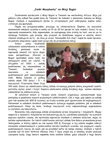 „Janki Muzykanty” na Misji Bugisi Pozdrawiam serdecznie z Misji Bugisi w Tanzanii we wschodniej Afryce. Mija już półtora roku odkąd Pan posłał mnie do Tanzanii do ludności z plemienia Sukuma na Misję Bugisi. Jednym z największych darów tu otrzymanych jest odkrywanie piękna ludzi, z którymi się spotykam. Nigdy nie przypuszczałam, pracując na Uniwersytecie Śląskim, że nauczanie matematyki młodych uczniów w wieku od 14 do 20 lat sprawi mi tyle radości. Dzieci te są naprawdę niesamowite. Gdy zapowiadam, że następnego dnia zrobię im test, one mi za to dziękują. Podobnie, gdy proszę, aby przyszli na dodatkowe zajęcia w sobotę, dzieci również dziękują mi za to, że chcę je uczyć. Niezwykłe! Ich chęć i zapał do nauki sprawia, że pomimo zmęczenia i upału mam wciąż siły do prowadzenia lekcji. Dzieci cenią możliwość zdobywania wykształcenia w szkole średniej, ponieważ może to naprawdę zmienić ich życie dając nowe perspektywy. Chociaż w Bugisi spotkałam wielu ludzi nie umiejących pisać ani czytać, to oficjalnie od 2001 r. szkoły podstawowe są obowiązkowe w Tanzanii. Jednakże poziom nauczania w szkołach podstawowych jest zawstydzająco niski. Mamy bowiem w jednej szkole około 700 dzieci i 5 – 6 nauczycieli. Przeciętna klasa liczy 100 osób. Dzieci po zakończeniu takiej szkoły otrzymują jedynie dobrą znajomość suahili, potrafią czytać, pisać i liczyć. Dopiero ukończenie szkoły średniej daje szanse młodemu człowiekowi na zdobycie pracy. W ostatnich latach w Tanzanii wiele różnych organizacji zainwestowało dużo pieniędzy w powstanie nowych prywatnych szkół średnich. Cóż z tego, gdy opłata za szkołę jest tak wysoka (ok. 800 $ rocznie), że liczba uczniów jest ograniczona do najbogatszych. Natomiast w szkołach średnich państwowych sytuacja wygląda podobnie jak w szkołach podstawowych. Klasy są duże, brakuje nauczycieli oraz odpowiedniego wyposażenia w czytelnie czy laboratoria. Bezcenną rolę odgrywają szkoły prowadzone przez misjonarzy i misjonarki. Mając wsparcie z zewnątrz, misjonarze nie koncentrują się na „zarabianiu pieniędzy” na uczniach poprzez wysokie czesne, ale wychodzą naprzeciw biednym a zdolnym dzieciom, dając im solidne wykształcenie. Do takich szkół można zaliczyć szkołę Don Bosco prowadzoną przez Salezjanów, w której opłata na rok wynosi 200 $. Pracując w tej szkole mogłam odkryć niezwykle utalentowanych a jednocześnie bardzo biednych uczniów, nie mających często podstawowych rzeczy do nauki jak na przykład nafty do lampy oliwnej. Jednym z takich uczniów był 19 letni Wilfred Albinus. Dnia 7 lipca utopił się w lokalnej studni podczas czerpania wody. Jego śmierć napełniła mnie wielkim bólem, gdyż odszedł z tego świata bardzo uzdolniony i obiecujący młodzieniec, ale jednocześnie w moim sercu była nadzieja, że mam orędownika w Niebie. Jestem bowiem mocno przekonana, że Wilfred to święty. Pochodził z wyjątkowo biednej rodziny. Ojciec zostawił ich jak on był jeszcze mały. Mama, która jest katechistą na naszej Misji, została sama z szóstką dzieci. Ks. Janusz, znając sytuację tej rodziny, włączył Wilfreda i jego starszych braci do grona dzieci objętych „Duchową Adopcją” opłacając im naukę w szkole Don Bosco. Wilfred był najlepszym uczniem w klasie. Wybrany przez rówieśników na przewodniczącego klasy był mimo to bardzo skromny. Wszystkie egzaminy z matematyki pisał na co najmniej 90%, a w czasie przerw śródsemestralnych prosił mnie o dodatkowe lekcje w zamian oferując na przykład zamiatanie mojego podwórka. Poszedł do szkoły podstawowej w wieku 10 lat, ponieważ wcześniej pasł krowy. Gdy w 2008 r. prowadziłam zajęcia dla uczniów przygotowujących się do egzaminów wstępnych do Don Bosco, przyjeżdżał na zajęcia pokonując 40 km w jedną stronę. Nie narzekał, że musi tak daleko jechać, ale cieszył się, że ma możliwość brania udziału w bezpłatnych korepetycjach. To właśnie ujęło mnie w nim najbardziej. Postawa wdzięczności! Mając tak niewiele, umiał wszystko docenić i za to podziękować. Podczas, gdy niektórzy uczniowie Don Bosco narzekają, że codziennie jedzą to samo na obiad: ugali na maharage (pewien rodzaj grysiku z mąki kukurydzianej z fasolą), Wilfred cieszył się, że każdego dnia ma lunch i nawet tłumaczył mi jak bardzo to jest pożywne. Jego zwyczajne życie, naznaczone trudami i ubóstwem, a jednocześnie wdzięcznością i pogodą ducha promieniowało na innych. Takich dzieci jak Wilfred jest więcej. Dlatego w przyszłym roku chcę dalej wspomagać finansowo zwłaszcza biedne a uzdolnione dzieci, umożliwiając im kontynuowanie nauki w szkole średniej, a przez to otwierać lepsze perspektywy na życie. Na szczególną uwagę zasługują dziewczęta, które w tej kulturze są dominowane przez chłopców. Ogromnie cieszę się, że od kilku miesięcy przychodzą one do mnie, aby porozmawiać o swoim życiu, zmaganiach, problemach w rodzinie itp. Jest to dla mnie nowe doświadczenie, które daje mi dużo radości, gdyż dzięki temu czuję, że jestem nie tylko nauczycielem, ale przede wszystkim misjonarką, trochę feminizującą. Dnia 8 grudnia 2010 r., w dzień Niepokalanego Poczęcia i założenia SMA, odnowiłam swoje misyjne zobowiązania na kolejne dwa lata. Jak Bóg pozwoli, to na początku czerwca 2011 r., przyjadę do Polski na 3 miesięczne wakacje, by pełna sił wrócić na kolejne dwa lata do Bugisi. Mungu awabariki, tzn. Niech Bóg Wam błogosławi! Jolanta Kazak, Misjonarka Świecka SMA