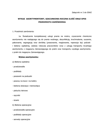 Załącznik nr 2 do SIWZ WYKAZ ASORTYMENTOWY, SZACUNKOWA ROCZNA ILOŚĆ ORAZ OPIS PRZEDMIOTU ZAMÓWIENIA 1. Przedmiot zamówienia: 1a. Świadczenie kompleksowej usługi prania na mokro, czyszczenie chemiczne asortymentu nie nadającego się do prania wodnego, dezynfekcję, krochmalenie, suszenie, pakowanie, segregację oraz obróbkę (prasowanie, maglowanie, reperacja itp) pościeli i bielizny szpitalnej, odzieży roboczej pracowników wraz z usługą transportu brudnego asortymentu z magazynu Zamawiającego do pralni oraz transportu czystego asortymentu z pralni do magazynu Zamawiającego. Wykaz asortymentu: a) Bielizna szpitalna: - prześcieradła - podkłady - poszewki na poduszki - poszwy na koce i na kołdry - bielizna dziecięca i niemowlęca - pieluchy tetrowe - ręczniki - ścierki b) Bielizna operacyjna: - prześcieradła operacyjne - podkłady operacyjne - serwety operacyjne c) Odzież robocza: - spódnice - spodnie - bluzy - fartuchy - kombinezony robocze - koszule flanelowe - bluzy polarowe - kurtki - ocieplacze / bezrękawniki d) Odzież robocza operacyjna: - spodnie – operacyjne - spódnice – operacyjne - bluzy – operacyjne - fartuchy – operacyjne - sukienki operacyjne e) Inny asortyment: - zasłony - firany - koce - materace - poduszki anilanowe i z pierza - kołdry anilanowe i z pierza - obrusy - pokrowce na materace oraz inny asortyment używany w szpitalu np. torby medyczne itp. - obrusy SZACUNKOWA ROCZNA ILOŚĆ WYNOSI – 57 000 kg 1b. Usługa prania i suszenia nakładek do mopów SZACUNKOWA ROCZNA ILOŚĆ WYNOSI – 107 000 sztuk 2. Wykonawca będzie odbierał przeznaczony do prania asortyment własnym transportem z magazynu Zamawiającego i dostarczał czysty asortyment do magazynu Zamawiającego trzy razy w tygodniu (tj, poniedziałek, środa, piątek) w godzinach od 900 - 1100. 3. Ponadto, w przypadku wystąpienia sytuacji wyjątkowych ( np. ognisko epidemiczne, epidemia, jednostkowe sytuacje zagrożenia), a także w przypadku, gdy liczba dni wolnych (następujących bezpośrednio po sobie) wynosi więcej niż 2 – usługa będzie realizowana także w wybrane dni wolne i/lub świąteczne – w celu zapewnienia właściwego funkcjonowania szpitala. W takiej sytuacji Zamawiający informuje Wykonawcę o konieczności realizacji usługi – z zachowaniem, co najmniej 1 – dniowego wyprzedzenia. 4. Środki transportu brudnego i czystego asortymentu winny być oddzielne lub posiadać szczelną podzieloną komorę załadunkową tak, aby asortyment czysty nie miał możliwości jakiegokolwiek kontaktu z asortymentem brudnym. 5. Osoba dostarczająca asortyment zobowiązana jest posiadać prawidłowy ubiór: fartuch ochronny i rękawice ochronne oraz posiadać aktualne badania do celów sanitarnoepidemiologicznych. 6. Czas wykonywania usługi dla asortymentu wymienionego w zał. nr 2 do SIWZ, nie może przekroczyć 3 dni. Przy czym czas wykonania usługi jest liczony od chwili odbioru asortymentu z siedziby Zamawiającego do chwili jego dostarczenia do siedziby Zamawiającego. 7. Pranie, maglowanie, prasowanie lub inne czynności związane z wykonaniem usługi muszą uwzględniać instrukcje (zalecenia) producenta danego asortymentu / produktu. 8. Wyprany i naprawiony asortyment Wykonawca będzie dostarczać do magazynu Zamawiającego w workach foliowych własnym transportem wg asortymentu z podziałem na bieliznę operacyjną, bieliznę oddziałową w opakowaniach po 20 sztuk; odzież roboczą i fartuchy na wieszakach po 10 sztuk a mopy po 50 sztuk lub w ilościach uzgodnionych z Zamawiającym. Ponadto opakowania te muszą być szczelne, zabezpieczać (chronić) przez zanieczyszczeniem biologicznym i fizycznym oraz przed zamoczeniem. 9. Przedmiot zamówienia winien być: 9.1. Suchy, czysty, nie może posiadać zacieków, plam, nie może pylić, wyprasowany, naprawiony 9.2. Bielizna noworodkowa, dziecięca, bielizna z prosektorium winna być osobno prana i pakowana 9.3. Przedmiot zamówienia nie może być zanieczyszczony bakteriologicznie 9.4. Bielizna skażona w oznakowanych workach (czerwonych) musi być poddana dezynfekcji w środkach o szerokim spektrum działania. 10. Reklamacja będzie rozstrzygana przez Wykonawcę w czasie 72 godzin od momentu zgłoszenia dokonanego prze Zamawiającego. 11. Wykonawca odpowiada za asortyment od momentu odebrania go od Zamawiającego do czasu przekazania czystego asortymentu do magazynu Zamawiającego. 12. Wszelkie szkody powstałe na skutek świadczonej usługi ( zagubienie, zniszenie, uszkodzenie itp.) Wykonawca jest zobowiązany usunąć a w razie potrzeby pokryć powstałe koszty. 13. Wykonawca zobowiązany jest przedstawić do oferty plan (opis) technologii prania. 14. Wykonawca zobowiązany jest umożliwić Zamawiającemu na jego żądanie wizytację pralni i procesów technologicznych a także środków transportu na każdym etapie postępowania oraz w każdym czasie realizowanej usługi (wykonywanej umowy), jeżeli Zamawiający będzie mieć wątpliwości co do stanu i realnej możliwości wykonania zamówienia publicznego, zgodnie z wymogami SIWZ i złożoną ofertą przetargową. 15. Zamawiający zastrzega sobie zlecanie prania innego asortymentu w zależności od potrzeb a możliwego do zrealizowania przez Wykonawcę w cenie nie wyższej niż najwyższa cena podana w ofercie za jeden kilogram bądź sztukę. 16. Ważenie asortymentu brudnego leży po stronie Zamawiającego, chyba że po podpisaniu umowy Zamawiający i Wykonawca ustalą inaczej. 17. Wzór protokołu zdawczo-odbiorczego asortymentu zostanie uzgodniony pomiędzy Wykonawcą i Zamawiającym po podpisaniu umowy.