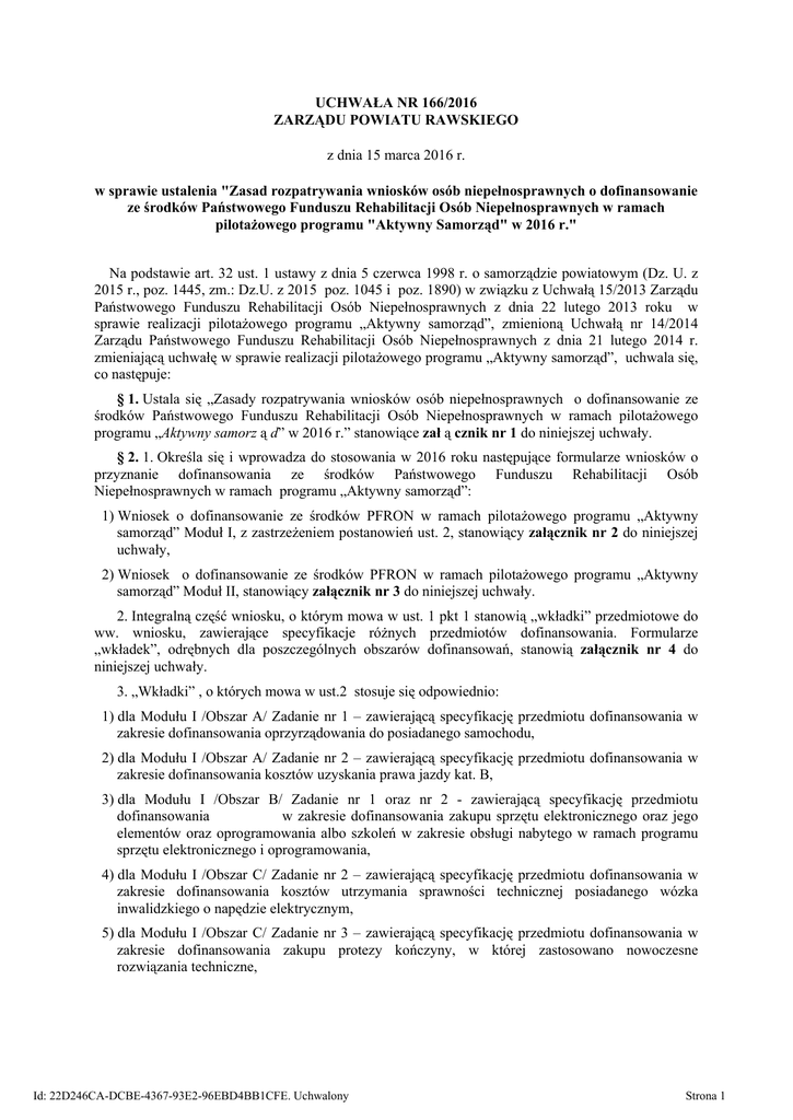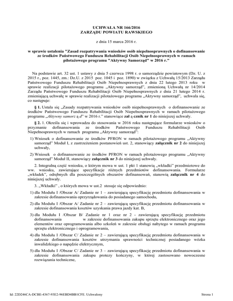 UCHWAŁA NR 166/2016 ZARZĄDU POWIATU RAWSKIEGO z dnia 15 marca 2016 r. w sprawie ustalenia "Zasad rozpatrywania wniosków osób niepełnosprawnych o dofinansowanie ze środków Państwowego Funduszu Rehabilitacji Osób Niepełnosprawnych w ramach pilotażowego programu "Aktywny Samorząd" w 2016 r." Na podstawie art. 32 ust. 1 ustawy z dnia 5 czerwca 1998 r. o samorządzie powiatowym (Dz. U. z 2015 r., poz. 1445, zm.: Dz.U. z 2015 poz. 1045 i poz. 1890) w związku z Uchwałą 15/2013 Zarządu Państwowego Funduszu Rehabilitacji Osób Niepełnosprawnych z dnia 22 lutego 2013 roku w sprawie realizacji pilotażowego programu „Aktywny samorząd”, zmienioną Uchwałą nr 14/2014 Zarządu Państwowego Funduszu Rehabilitacji Osób Niepełnosprawnych z dnia 21 lutego 2014 r. zmieniającą uchwałę w sprawie realizacji pilotażowego programu „Aktywny samorząd”, uchwala się, co następuje: § 1. Ustala się „Zasady rozpatrywania wniosków osób niepełnosprawnych o dofinansowanie ze środków Państwowego Funduszu Rehabilitacji Osób Niepełnosprawnych w ramach pilotażowego programu „Aktywny samorz ą d” w 2016 r.” stanowiące zał ą cznik nr 1 do niniejszej uchwały. § 2. 1. Określa się i wprowadza do stosowania w 2016 roku następujące formularze wniosków o przyznanie dofinansowania ze środków Państwowego Funduszu Rehabilitacji Osób Niepełnosprawnych w ramach programu „Aktywny samorząd”: 1) Wniosek o dofinansowanie ze środków PFRON w ramach pilotażowego programu „Aktywny samorząd” Moduł I, z zastrzeżeniem postanowień ust. 2, stanowiący załącznik nr 2 do niniejszej uchwały, 2) Wniosek o dofinansowanie ze środków PFRON w ramach pilotażowego programu „Aktywny samorząd” Moduł II, stanowiący załącznik nr 3 do niniejszej uchwały. 2. Integralną część wniosku, o którym mowa w ust. 1 pkt 1 stanowią „wkładki” przedmiotowe do ww. wniosku, zawierające specyfikacje różnych przedmiotów dofinansowania. Formularze „wkładek”, odrębnych dla poszczególnych obszarów dofinansowań, stanowią załącznik nr 4 do niniejszej uchwały. 3. „Wkładki” , o których mowa w ust.2 stosuje się odpowiednio: 1) dla Modułu I /Obszar A/ Zadanie nr 1 – zawierającą specyfikację przedmiotu dofinansowania w zakresie dofinansowania oprzyrządowania do posiadanego samochodu, 2) dla Modułu I /Obszar A/ Zadanie nr 2 – zawierającą specyfikację przedmiotu dofinansowania w zakresie dofinansowania kosztów uzyskania prawa jazdy kat. B, 3) dla Modułu I /Obszar B/ Zadanie nr 1 oraz nr 2 - zawierającą specyfikację przedmiotu dofinansowania w zakresie dofinansowania zakupu sprzętu elektronicznego oraz jego elementów oraz oprogramowania albo szkoleń w zakresie obsługi nabytego w ramach programu sprzętu elektronicznego i oprogramowania, 4) dla Modułu I /Obszar C/ Zadanie nr 2 – zawierającą specyfikację przedmiotu dofinansowania w zakresie dofinansowania kosztów utrzymania sprawności technicznej posiadanego wózka inwalidzkiego o napędzie elektrycznym, 5) dla Modułu I /Obszar C/ Zadanie nr 3 – zawierającą specyfikację przedmiotu dofinansowania w zakresie dofinansowania zakupu protezy kończyny, w której zastosowano nowoczesne rozwiązania techniczne, Id: 22D246CA-DCBE-4367-93E2-96EBD4BB1CFE. Uchwalony Strona 1 6) dla Modułu I /Obszar C/ Zadanie nr 4 – zawierającą specyfikację przedmiotu dofinansowania w zakresie dofinansowania kosztów utrzymania sprawności technicznej posiadanej protezy kończyny, w której zastosowano nowoczesne rozwiązania techniczne, 7) dla Modułu I /Obszar D – zawierającą specyfikację przedmiotu dofinansowania w zakresie dofinansowania kosztów opieki dla osoby zależnej. § 3. Wykonanie uchwały powierza się Dyrektorowi PCPR w Rawie Mazowieckiej § 4. Uchwała wchodzi w życie z dniem podjęcia. Starosta Józef Matysiak Wicestarosta Marian Krzyczkowski Członek Zarządu Tadeusz Damaz Członek Zarządu Jarosław Kobierski Członek Zarządu Marek Sekuter Id: 22D246CA-DCBE-4367-93E2-96EBD4BB1CFE. Uchwalony Strona 2 UZASADNIENIE W dniu 24.02.2016 roku Powiat Rawski wyraził gotowość realizacji pilotażowego programu „Aktywny samorząd” w 2016 roku i złożył wystąpienie o przyznanie środków na realizację w/w programu. W dniu 26 kwietnia 2013 roku w Łodzi pomiędzy PFRON z siedzibą w Warszawie, a Powiatem Rawskim została zawarta wieloletnia Umowa nr AS 3/000021/05/D w sprawie realizacji pilotażowego programu „Aktywny samorząd. W związku z tym Powiat Rawski zobowiązał się do stosowania zapisów zawartych w pilotażowym programie „Aktywny samorząd”, postanowień zawartych w „Kierunkach działań oraz warunkach brzegowych obowiązujących realizatorów pilotażowego programu „Aktywny samorząd” w 2016 roku oraz „Zasadach dotyczących wyboru, dofinansowania i rozliczania wniosków o dofinansowanie w ramach modułu I i II pilotażowego programu „Aktywny samorząd”. Zgodnie z „Zasadami dotyczącymi wyboru, dofinansowania i rozliczania wniosków o dofinansowanie w ramach modułu I i II pilotażowego programu „Aktywny samorząd” realizator dokumentuje przyjęte przez siebie szczegółowe zasady rozpatrywania wniosków w sposób umożliwiający ocenę zgodności podejmowanych decyzji z przyjętymi zasadami. W związku z powyższym przedstawia się projekt uchwały w sprawie ustalenia „Zasad rozpatrywania wniosków osób niepełnosprawnych o dofinansowanie ze środków Państwowego Funduszu Rehabilitacji Osób Niepełnosprawnych w ramach pilotażowego programu „Aktywny samorząd” w 2016 r.” Id: 22D246CA-DCBE-4367-93E2-96EBD4BB1CFE. Uchwalony Strona 1