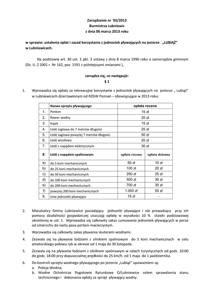Zarządzenie nr 93/2013 Burmistrza Lubniewic z dnia 06 marca 2013 roku w sprawie: ustalenia opłat i zasad korzystania z jednostek pływających na jeziorze „LUBIĄŻ” w Lubniewicach. Na podstawie art. 30 ust. 2 pkt. 3 ustawy z dnia 8 marca 1990 roku o samorządzie gminnym (Dz. U. Z 2001 r. Nr 142, poz. 1591 z późniejszymi zmianami ), zarządza się, co następuje: §1 1. Wprowadza się opłaty za rekreacyjne korzystanie z jednostek pływających na jeziorze „ Lubiąż” w Lubniewicach dzierżawionym od RZGW Poznań – obowiązujące w 2013 roku: opłata roczna Nazwa sprzętu pływającego 1. Ponton 15 zł 2. Rower wodny 20 zł 3. Kajak 15 zł 4. Łódź żaglowa do 7 metrów długości 25 zł 5. Łódź żaglowa powyżej 7 metrów długości 50 zł 6. Łódź wiosłowa 20 zł 7. Łódź z napędem elektrycznym 30 zł 8. Łódź z napędem spalinowym: a) opłata roczna opłata dzienna do 5 koni mechanicznych 50 zł 10 zł b) do 25 koni mechanicznych 100 zł 20 zł c) do 50 koni mechanicznych 250 zł 25 zł d) do 100 koni mechanicznych 500 zł 30 zł e) do 200 koni mechanicznych 700 zł 35 zł f) powyżej 200 koni mechanicznych 1.000 zł 55 zł 9. inne jednostki pływające 15 zł - 2. Mieszkańcy Gminy Lubniewice posiadający jednostki pływające i nie prowadzący przy ich pomocy działalności gospodarczej uiszczają opłatę w wysokości 10 % stawki podstawowej określonej w ust. 1. Wprowadza się całkowity zakaz cumowania jednostek pływających w porze od zmierzchu do świtu poza portem macierzystym. 3. Wprowadza się całkowity zakaz pływania skuterami wodnymi. 4. Zezwala się na pływanie łodziami z silnikiem spalinowym do 5 koni mechanicznych w celu amatorskiego połowu ryb w okresie od 1 maja do 30 listopada. 5. Zezwala się na pływanie łodziami z silnikiem spalinowym w celach turystycznych od godz. 10:00 do godz. 18:00 przy dopuszczalnej prędkości do 25 km/h. od 1 maja do 1 października. 6. Do kontroli sprzętu wodnego pływającego po jeziorze „Lubiąż” upoważnieni są: a. Policja Wodna; b. Wodne Ochotnicze Pogotowie Ratunkowe O/Lubniewice celem sprawdzenia stanu technicznego i dokonania opłaty za sprzęt pływający wodny. 1. §2 Opłaty, o których mowa w § 1 ust. 1 należy uiszczać (z podaniem nazwy lub numeru jednostki pływającej) w: a. kasie Urzędu Miejskiego w Lubniewicach, ul. Jana Pawła II 51; b. przelewem na konto Gminy Lubniewice Nr 53 8369 0008 0050 0018 2000 0010. §3 Wykonanie zarządzenia powierza się Kierownikowi Referatu Inwestycji i Nieruchomości Urzędu Miejskiego Lubniewice. §4 Traci moc Zarządzenie Nr 56/2012 Burmistrza Lubniewic z dnia 02 maja 2012 roku w sprawie ustalenia opłat i zasad korzystania jednostek pływających z jeziora „Lubiąż” w Lubniewicach. §5 Zarządzenie wchodzi w życie z dniem podpisania.