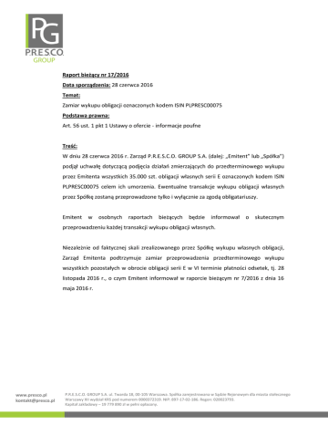 Raport bieżący nr 17/2016 Data sporządzenia: 28 czerwca 2016 Temat: Zamiar wykupu obligacji oznaczonych kodem ISIN PLPRESC00075 Podstawa prawna: Art. 56 ust. 1 pkt 1 Ustawy o ofercie - informacje poufne Treść: W dniu 28 czerwca 2016 r. Zarząd P.R.E.S.C.O. GROUP S.A. (dalej: „Emitent” lub „Spółka”) podjął uchwałę dotyczącą podjęcia działań zmierzających do przedterminowego wykupu przez Emitenta wszystkich 35.000 szt. obligacji własnych serii E oznaczonych kodem ISIN PLPRESC00075 celem ich umorzenia. Ewentualne transakcje wykupu obligacji własnych przez Spółkę zostaną przeprowadzone tylko i wyłącznie za zgodą obligatariuszy. Emitent w osobnych raportach bieżących będzie informował o skutecznym przeprowadzeniu każdej transakcji wykupu obligacji własnych. Niezależnie od faktycznej skali zrealizowanego przez Spółkę wykupu własnych obligacji, Zarząd Emitenta podtrzymuje zamiar przeprowadzenia przedterminowego wykupu wszystkich pozostałych w obrocie obligacji serii E w VI terminie płatności odsetek, tj. 28 listopada 2016 r., o czym Emitent informował w raporcie bieżącym nr 7/2016 z dnia 16 maja 2016 r. www.presco.pl [email protected] P.R.E.S.C.O. GROUP S.A. ul. Twarda 18, 00-105 Warszawa. Spółka zarejestrowana w Sądzie Rejonowym dla miasta stołecznego Warszawy XII wydział KRS pod numerem 0000372319. NIP: 897-17-02-186. Regon: 020023793. Kapitał zakładowy – 19 779 890 zł w pełni opłacony.