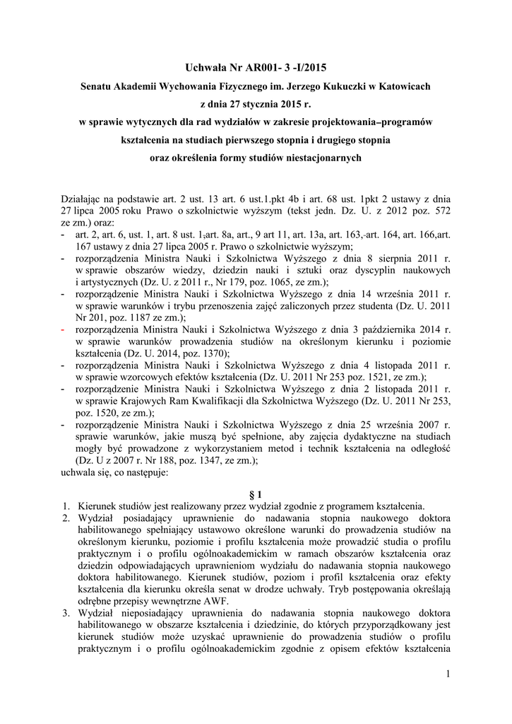 Uchwała Nr AR001- 3 -I/2015 Senatu Akademii Wychowania Fizycznego im. Jerzego Kukuczki w Katowicach z dnia 27 stycznia 2015 r. w sprawie wytycznych dla rad wydziałów w zakresie projektowania programów kształcenia na studiach pierwszego stopnia i drugiego stopnia oraz określenia formy studiów niestacjonarnych Działając na podstawie art. 2 ust. 13 art. 6 ust.1.pkt 4b i art. 68 ust. 1pkt 2 ustawy z dnia 27 lipca 2005 roku Prawo o szkolnictwie wyższym (tekst jedn. Dz. U. z 2012 poz. 572 ze zm.) oraz: - art. 2, art. 6, ust. 1, art. 8 ust. 1,art. 8a, art., 9 art 11, art. 13a, art. 163, art. 164, art. 166,art. 167 ustawy z dnia 27 lipca 2005 r. Prawo o szkolnictwie wyższym; - rozporządzenia Ministra Nauki i Szkolnictwa Wyższego z dnia 8 sierpnia 2011 r. w sprawie obszarów wiedzy, dziedzin nauki i sztuki oraz dyscyplin naukowych i artystycznych (Dz. U. z 2011 r., Nr 179, poz. 1065, ze zm.); - rozporządzenie Ministra Nauki i Szkolnictwa Wyższego z dnia 14 września 2011 r. w sprawie warunków i trybu przenoszenia zajęć zaliczonych przez studenta (Dz. U. 2011 Nr 201, poz. 1187 ze zm.); - rozporządzenia Ministra Nauki i Szkolnictwa Wyższego z dnia 3 października 2014 r. w sprawie warunków prowadzenia studiów na określonym kierunku i poziomie kształcenia (Dz. U. 2014, poz. 1370); - rozporządzenia Ministra Nauki i Szkolnictwa Wyższego z dnia 4 listopada 2011 r. w sprawie wzorcowych efektów kształcenia (Dz. U. 2011 Nr 253 poz. 1521, ze zm.); - rozporządzenie Ministra Nauki i Szkolnictwa Wyższego z dnia 2 listopada 2011 r. w sprawie Krajowych Ram Kwalifikacji dla Szkolnictwa Wyższego (Dz. U. 2011 Nr 253, poz. 1520, ze zm.); - rozporządzenie Ministra Nauki i Szkolnictwa Wyższego z dnia 25 września 2007 r. sprawie warunków, jakie muszą być spełnione, aby zajęcia dydaktyczne na studiach mogły być prowadzone z wykorzystaniem metod i technik kształcenia na odległość (Dz. U z 2007 r. Nr 188, poz. 1347, ze zm.); uchwala się, co następuje: §1 1. Kierunek studiów jest realizowany przez wydział zgodnie z programem kształcenia. 2. Wydział posiadający uprawnienie do nadawania stopnia naukowego doktora habilitowanego spełniający ustawowo określone warunki do prowadzenia studiów na określonym kierunku, poziomie i profilu kształcenia może prowadzić studia o profilu praktycznym i o profilu ogólnoakademickim w ramach obszarów kształcenia oraz dziedzin odpowiadających uprawnieniom wydziału do nadawania stopnia naukowego doktora habilitowanego. Kierunek studiów, poziom i profil kształcenia oraz efekty kształcenia dla kierunku określa senat w drodze uchwały. Tryb postępowania określają odrębne przepisy wewnętrzne AWF. 3. Wydział nieposiadający uprawnienia do nadawania stopnia naukowego doktora habilitowanego w obszarze kształcenia i dziedzinie, do których przyporządkowany jest kierunek studiów może uzyskać uprawnienie do prowadzenia studiów o profilu praktycznym i o profilu ogólnoakademickim zgodnie z opisem efektów kształcenia 1 uchwalonym przez Senat na podstawie decyzji ministra właściwego do spraw szkolnictwa wyższego. Wymagane warunki i tryb postępowania określają odrębne przepisy ustawowe oraz wewnętrzne przepisy AWF. 4. Wydział posiadający uprawnienie do nadawania stopnia naukowego doktora w obszarze kształcenia i dziedzinie, z którą jest związany kierunek studiów spełniający ustawowo określone warunki do prowadzenia studiów na określonym kierunku, poziomie i profilu kształcenia może prowadzić studia o profilu praktycznym i o profilu ogólnoakademickim zgodnie z opisem efektów kształcenia uchwalonych przez senat Uczelni na podstawie decyzji ministra właściwego do spraw szkolnictwa wyższego. 5. Wydział nie posiadający uprawnienia do nadawania stopnia naukowego doktora spełniający ustawowo określone warunki może uzyskać uprawnienie do prowadzenia studiów na określonym kierunku, poziomie i profilu kształcenia zgodnie z opisem efektów kształcenia uchwalonym przez Senat, na podstawie decyzji ministra właściwego do spraw szkolnictwa wyższego 1) studiów o profilu praktycznym na określonym kierunku i poziomie kształcenia, 2) studiów o profilu ogólnoakademickim na określonym kierunku i stopniu kształcenia, jeżeli spełnia wymagania kadrowe, prowadzi badania naukowe w dziedzinie związanej z kierunkiem studiów i uzyskał pozytywną ocenę jakości kształcenia na studiach pierwszego lub drugiego stopnia o profilu praktycznym. Wymagane warunki i tryb postępowania określają odrębne przepisy ustawowe oraz wewnętrzne przepisy AWF. 6. Prowadzenie studiów z wykorzystaniem metod kształcenia na odległość regulują odrębne przepisy. § 2. 1. Program kształcenia jest to dokument obejmujący opis zakładanych efektów kształcenia oraz program studiów stanowiący opis procesu kształcenia prowadzący do osiągnięcia tych efektów dla określonego kierunku studiów, poziomu i profilu kształcenia. 2. W procesie tworzenia programu kształcenia wydział uczelni uwzględnia: 1) zgodność programu kształcenia z misją i strategią AWF Katowice oraz strategią wydziału, 2) wnioski z analizy wyników monitorowania karier zawodowych absolwentów, 3) uwarunkowania oraz potrzeby rynku pracy, 4) wnioski z analizy zgodności efektów kształcenia z potrzebami rynku pracy 5) opinie pracodawców i absolwentów, 6) opinię samorządu studentów, 7) doświadczenia i wzorce międzynarodowe, 8) możliwość zainteresowania kandydatów planowanym kierunkiem studiów, 9) koszty planowanego kierunku studiów i możliwość jego sfinansowania przez uczelnię lub z wykorzystaniem zewnętrznych źródeł jego finansowania, 10) możliwość spełnienia warunków do prowadzenia studiów na określonym kierunku, poziomie i profilu studiów, w tym między innymi wymogów dotyczących: minimum kadrowego i kwalifikacji nauczycieli akademickich prowadzących zajęcia dydaktyczne, sposobu realizacji zajęć dyda