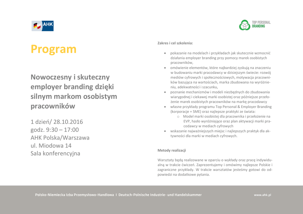 Program Zakres i cel szkolenia: Nowoczesny i skuteczny employer branding dzięki silnym markom osobistym pracowników 1 dzień/ 28.10.2016 godz. 9:30 – 17:00 AHK Polska/Warszawa ul. Miodowa 14 Sala konferencyjna pokazanie na modelach i przykładach jak skutecznie wzmocnić działania employer branding przy pomocy marek osobistych pracowników, omówienie elementów, które najbardziej zyskują na znaczeniu w budowaniu marki pracodawcy w dzisiejszym świecie: rozwój mediów cyfrowych i społecznościowych, motywacja pracowników bazująca na wartościach, marka zbudowana na wyróżnieniu, adekwatności i szacunku, poznanie mechanizmów i modeli niezbędnych do zbudowania wiarygodnej i ciekawej marki osobistej oraz późniejsze przełożenie marek osobistych pracowników na markę pracodawcy własne przykłady programu Top Personal & Employer Branding (korporacje + SME) oraz najlepsze praktyki ze świata: o Model marki osobistej dla pracownika i przełożenie na EVP, hasło wyróżniające oraz plan aktywacji marki pracodawcy w mediach cyfrowych wskazanie najważniejszych miejsc i najlepszych praktyk dla aktywności dla marki w mediach cyfrowych. Metody realizacji Warsztaty będą realizowane w oparciu o wykłady oraz pracę indywidualną w trakcie ćwiczeń. Zaprezentujemy i omówimy najlepsze Polskie i zagraniczne przykłady. W trakcie warsztatów jesteśmy gotowi do odpowiedzi na dodatkowe pytania. Program szkolenia: 1. Jak dzisiaj skutecznie wspierać i rozwijać markę pracodawcy? Marka pracodawcy i marka osobista pracownika – inspirujące, ciekawe i najbardziej efektywne połączenie (win-win). W jaki sposób rozwój mediów cyfrowych i społecznościowych wpływa obecnie na proces rekrutacji i budowanie marki pracodawcy? o Zerowy Moment Prawdy o Portale społecznościowe (LinkedIn, Facebook, Twitter) o Content marketing, wydarzenia, wideo Jak skutecznie rozwijać i motywować pracowników na bazie ich wartości i misji? Budowa i komunikacja marki pracodawcy w oparciu o 3 elementy: wyróżnienie, adekwatność i szacunek Spójna marka pracodawcy, a komunikacja wybranych działów (marketing, sprzedaż, IT, R&D) 2. Model Top Personal & Employer Branding Marka osobista – jak ją zbudować szybko i skutecznie i. Odpowiedź na 3 kluczowe pytania na bazie „Golden Circle” Simon Sinek Dlaczego – misja życiowa Jak – sposób działania / profil osobowości Co – plan aktywacji marki osobistej ii. Najlepsze przykłady na bazie zrealizowanych projektów Marka pracodawcy – jak ją wspierać i rozwijać w oparciu o marki osobiste pracowników i. Hasło przewodnie do komunikacji ii. Wypracowanie EVP iii. Jak marki osobiste wspierają budowanie marki pracodawcy 3. Inspiracja na bazie najlepszych przykładów z Polski i ze świata Projekty z Polski na bazie własnych projektów – czyli co zrobiliśmy, jakie osiągnęliśmy efekty i czego musimy unikać w przyszłości Przykłady z branż B2B i B2C (korporacje i SME) Najlepsze praktyki ze świata (m.in. Unversum i LinkedIn) Prelegenci: Piotr Grządziel / Top Personal Branding Praktyk, trener, przewodnik po marketingu i personal brandingu Sprawiam, że ludzie czują się ważni. Szybko, sprawnie i z wdziękiem buduję inspirujące marki osobiste ludzi, którzy są liderami w swoich branżach. Ponad 13 lat pracy i mnóstwo projektów dla najlepszych marek na świecie dało mi solidną porcję wiedzy i doświadczenia, które teraz przekładam na pracę z wyjątkowymi ludźmi. Służę inspiracją. Piotr Grządziel – najważniejsze fakty: autor metody Top Personal & Employer Branding praca nad markami osobistymi i marketingiem dla czołowych liderów i organizacji w Polsce i za granicą 10 lat doświadczeń na światowym poziomie w działach marketingu i komunikacji projekty dla najbardziej znanych marek na świecie: Coca-Cola, Heineken, Orange, Aviva certyfikowany trener persolog®, Wyjątkowy Nauczyciel, prelegent licznych konferencji w Polsce i za granicą ponad 1’000 godzin szkoleń, treningów i wykładów lider nowych rozwiązań w komunikacji marketingowej http://www.toppersonalbranding.com/o-nas/piotr-grzadziel/ Majka Wieczorek / Top Personal Branding Doświadczenie w kompleksowym zarządzaniu procesem planowania komunikacji marketingowej zdobywałam pracując dla największych polskich marek. Z branżą reklamową związana jestem od niemal 20 lat. Wiele lat na stanowiskach menedżerskich, ostatnio w kadrze zarządzającej domu mediowego Starcom (SMVG). Wieloletnie doświadczenie trenerskie zostało przełożone na przygotowywanie i prowadzenie wielu szkoleń z zakresu planowania mediów i komunikacji marketingowej, dla ponad 40 klientów (działów marketingu, pracowników mediów, urzędników) m.in. Agora, Bahlsen, Black Red White, Bongrain, BZ WBK, Delecta, Enel-Med., Frosta, G&J, Dr Irena Eris, Komfort, Kompania Piwowarska, Kraft Foods, Kruszwica, Makro, Mlekpol, PZU, Real, województwo śląskie, Śnieżka, SOS Wioski Dziecięce, Tetra Pak, Trefl, TUI, TVN, Miasto Szczecin, UPC, Warta, Western Union. http://www.toppersonalbranding.com/o-nas/majka-wieczorek/