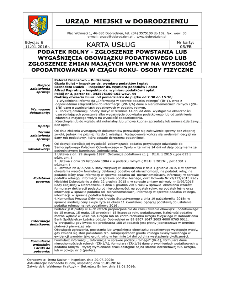 URZĄD MIEJSKI w DOBRODZIENIU Plac Wolności 1, 46-380 Dobrodzień, tel. (34) 3575100 do 102, fax. wew. 30 e-mail: [email protected] , www.dobrodzien.pl Edycja: 6 11.01.2016r. KARTA USŁUG Nr karty: 05/FB PODATEK ROLNY - ZGŁOSZENIE POWSTANIA LUB WYGAŚNIĘCIA OBOWIĄZKU PODATKOWEGO LUB ZGŁOSZENIE ZMIAN MAJĄCYCH WPŁYW NA WYSOKOŚĆ OPODATKOWANIA W CIĄGU ROKU- OSOBY FIZYCZNE Miejsce załatwienia sprawy: Wymagane dokumenty: Opłaty: Termin załatwienia sprawy: Tryb odwoławczy: Podstawa prawna: Informacje dodatkowe: Formularze wniosków i druki do pobrania: Referat Finansowo – Budżetowy Gizela Kulej – inspektor ds. wymiaru podatków i opłat Bernadeta Dudek – inspektor ds. wymiaru podatków i opłat Alfred Paprotny – inspektor ds. wymiaru podatków i opłat Pokój nr 3, parter tel. 343575100-102 wew. 44 Godziny otwarcia biura: od poniedziałku do piątku od 7.30 do 15.30; 1.Wypełniona informacja ,,Informacja w sprawie podatku rolnego” (IR-1), wraz z odpowiednimi załącznikami do informacji: (ZR-1/A) dane o nieruchomościach rolnych i (ZR1/B) dane o zwolnieniach podatkowych w podatku rolnym. 2. Korektę deklaracji należy złożyć w terminie 14 dni od dnia wystąpienia okoliczności uzasadniających powstanie albo wygaśnięcie obowiązku podatkowego lub od zaistnienia zdarzenia mającego wpływ na wysokość opodatkowania. Kserokopia lub do wglądu akt notarialny lub umowa kupna- sprzedaży lub umowa dzierżawy. Bez opłat. Od dnia złożenia wymaganych dokumentów przewiduje się załatwienie sprawy bez zbędnej zwłoki, jednak nie później niż do 1 miesiąca. Postępowanie kończy się wydaniem decyzji na dany rok podatkowy, która zostaje doręczona podatnikowi. Od decyzji określającej wysokość zobowiązania podatku przysługuje odwołanie do Samorządowego Kolegium Odwoławczego w Opolu w terminie 14 dni od daty otrzymania za pośrednictwem Burmistrza Dobrodzienia. 1.Ustawa z dn. 29 sierpnia 1997r. Ordynacja podatkowa (t. j.: Dz.U. z 2015 r.,poz.613 z późn. zm. ) 2. Ustawa z dnia 15 listopada 1984 r. o podatku rolnym ( Dz.U. z 2013r. , poz.1381 z późn.zm.) 3. Uchwała Nr X/99/2015 Rady Miejskiej w Dobrodzieniu z dnia 1 grudnia 2015 r. w sprawie określenia wzorów formularzy deklaracji podatku od nieruchomości, na podatek rolny, na podatek leśny oraz informacji w sprawie podatku od nieruchomościach, informacji w sprawie podatku rolnego, informacji w sprawie podatku leśnego, oraz Uchwała Nr XI/113/2015 Rady Miejskiej Dobrodzieniu z dnia 22 grudnia 2015 r. w sprawie zmiany uchwały nr X/99/2015 Rady Miejskiej w Dobrodzieniu z dnia 1 grudnia 2015 roku w sprawie określenia wzorów formularzy deklaracji podatku od nieruchomości, na podatek rolny, na podatek leśny oraz informacji w sprawie podatku od nieruchomościach, informacji w sprawie podatku rolnego, informacji w sprawie podatku leśnego. 4.Komunikat Prezesa Głównego Urzędu Statystycznego z dnia 19 października 2015r. w sprawie średniej ceny skupu żyta za okres 11 kwartałów, będącej podstawą do ustalenia podatku rolnego na rok podatkowy 2016 . Podatek jest płatny w 4–ch ratach proporcjonalnie do czasu trwania obowiązku podatkowego: do 15 marca, 15 maja, 15 wrześnie i 15 listopada roku podatkowego. Należność podatku można wpłacić w kasie tut. Urzędu lub na konto rachunku Urzędu Miejskiego w Dobrodzieniu Bank Spółdzielczy Leśnica oddział Dobrodzień nr 89 8907 1047 2005 4000 0765 0011. W przypadku gdy kwota nie przekracza 100 zł podatek jest płatny jednorazowo w terminie płatności pierwszej raty. Obowiązek zgłoszenia, powstania lub wygaśnięcia obowiązku podatkowego występuje wtedy, gdy zmienił się stan posiadania tzn. zakup/sprzedaż gruntu rolnego sklasyfikowanego w ewidencji gruntów jako grunt rolny w terminie 14 dni od dnia wystąpienia okoliczności. Formularz informacji ,,Informacja w sprawie podatku rolnego” (IR-1), formularz dane nieruchomościach rolnych (ZR-1/A), formularz (ZR-1/B) dane o zwolnieniach podatkowych w podatku rolnym - wyżej wymienione druki dostępne są na stronie internetowej tut. Urzędu, lub w pokoju nr 3 (parter). Opracowała: Irena Kaziur – inspektor, dnia 20.07.2005r. Aktualizacja: Bernadeta Dudek, inspektor, dnia 11.01.2016r. Zatwierdził: Waldemar Krafczyk - Sekretarz Gminy, dnia 11.01.2016r.