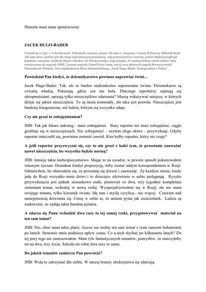 Historia musi mnie sponiewierać JACEK HUGO-BADER Urodził się w 1957 r. w Sochaczewie. Podróżnik, reporter, pisarz. Od 1990 r. związany z Gazetą Wyborczą. Miłośnik Rosji. Jak sam mówi, podróż jest dla niego największą przyjemnością. Azję przemierzył na rowerze, jezioro Bajkał przepłynął kajakiem, samotnie, łazikiem dotarł z Moskwy do Władywostoku. Jego książka „W rajskiej dolinie wśród zielska“ była nominowana do nagrody NIKE. Laureat nagrody Grand Press (1999, 2003) oraz głównych nagród Stowarzyszenia Dziennikarzy Polskich. Jest współautorem filmu dokumentalnego „Jacek Hugo-Bader. Korespondent z Polszy”. Powiedział Pan kiedyś, że dziennikarstwo powinno naprawiać świat... Jacek Hugo-Bader: Tak, ale to bardzo niekonkretne naprawianie świata. Dziennikarze są czwartą władzą. Pokazują, gdzie coś nie hula. Dlaczego reporterzy zajmują się okropnościami, opisują tylko nieszczęśliwe zdarzenia? Muszą wskazywać miejsca, w których dzieje się jakieś nieszczęście. To są może komunały, ale taka jest prawda. Nieszczęście jest bardziej fotogeniczne, niż ludzie, którym się wszystko udaje. Czy nie grozi to zobojętnieniem? JHB: Tak jak lekarz onkolog - musi zobojętnieć. Stary reporter też musi zobojętnieć, ciągle grzebiąc się w nieszczęściach. Nie zobojętnieć – użyłem złego słowa – przywyknąć. Gdyby reporter znieczulił się, powinien zmienić zawód. Kim byłby reporter, który nie czuje? A jeśli reporter przyzwyczai się, czy to nie grozi z kolei tym, że przestanie zauważać nawet nieszczęścia, bo wszystko będzie normą? JHB: Istnieje takie niebezpieczeństwo. Mając to na uwadze, w pewien sposób pokierowałem własnym życiem. Dostałem kiedyś propozycję, żeby zostać stałym korespondentem w Rosji. Odmówiłem, bo obawiałem się, że przestanę się dziwić i zauważać. Za każdym razem, kiedy jadę do Rosji wszystko mnie dziwi i to dziecięce zdziwienie w sobie pielęgnuję. Ryzyko przywyknięcia jest jednak stosunkowo małe, ponieważ co dwa, trzy tygodnie kompletnie zmieniam temat, wchodzę w nową rzekę. Wyspecjalizowałem się w Rosji, ale nie mam swojego tematu, tylko kierunek świata. Idę tam i myślę cyrylicą - nic więcej. Czuwam nad umiejętnością dziwienia się. Cenię w sobie to, że umiem pytać jak sześciolatek. Ludzie są zaskoczeni, że zadaję takie banalne pytania. A zdarza się Panu wchodzić dwa razy to tej samej rzeki, przygotowywać materiał na ten sam temat? JHB: Nie, choć mam takie plany. Jszcze raz zrobię ten sam temat z tymi samymi bohaterami po latach. Strasznie mnie podnieca upływ czasu. Co u nich słychać po kilkunastu latach? Do tej pory tego nie zastosowałem. Mam tyle fantastycznych tematów, pomysłów, że starczyłoby mi na dwa, trzy życia. Szkoda mi robić dwa razy to samo. Do jakich tematów zamierza Pan powrócić? JHB: Wolę to zatrzymać dla siebie. W naszej branży złodziejstwa się zdarzają. Rozmyśla Pan o swoich bohaterach? JHB: To jest pytanie, na które nie lubię odpowiadać. Niestety jest tak, że reporter wykorzystuje i porzuca bohatera, jak podstarzałą narzeczoną, z którą na wszelki wypadek się nie ożenił, a teraz nie jest już potrzebna. Mnie nawet mózg się do tego przystosował, wypracował sobie niewiarygodny talent deletowania z pamięci tych ludzi, z którymi pracowałem. Klikam „delete” i znikają. A ponieważ mój mózg nie jest tak świetnie zaprogramowany, popełnia pomyłki. Miesza życie prywatne ze służbowym. Bywa, że wyrzuca z pamięci prywatne znajomości. Spotykam czasami kogoś i nie mam pojęcia czy go znam z powodów służbowych czy prywatnych. Jakich historii nie zapomni Pan do końca życia? JHB: Jest parę takich historii. Pani Wioli, matki Szymona do końca życia nie zapomnę. Pisałem o niej, kiedy pracowałem nad tekstem o ludziach, którzy ponieśli w życiu gigantyczną stratę. Pani Wiola straciła syna w lawinie pod Rysami. Jej opowieść będzie siedziała we mnie zawsze. Podobnie rozwaliła mnie pani Teresa Majchrzak, opisałem ją w tekście „Madonny polskie“, matka Piotra, chłopca, którego ZOMO zabiło w Poznaniu na ulicy. Opowiedziała mi tę historię…, jak przychodzi do szpitala, gdzie umiera jej syn… poryczałem się kiedy mi to opowiadała, poryczałem się kiedy odsłuchiwałem kasetę i kiedy o tym pisałem. W życiu nie słyszałem tak dynamicznej opowieści. Moje relacje z bohaterem są intensywne, ale krótkotrwałe. Historia musi mnie sponiewieraća bohater złapać za gardło, wsadzić mi rękę do środka, do bebechów, mocno ścisnąć i jeszcze zatargać. Łaknę jak kania dżdżu takich historii. Jak otwiera pan swoich bohaterów, jak do nich dociera? Powiedział Pan, że kontakt jest intensywny i krótkotrwały, a przecież ludzie nie są z natury otwarci. JHB: Bóg mnie obdarzył umiejętnością słuchania i rozmawiania z ludźmi. Otwieram ich, tak, ale sam też się otwieram. Odkręcam się jak słoik. Jak ktoś specjalnie nie chce się otworzyć, to arivederci Roma, nie musze z tym bohaterem pracować. Oczywiście, mam bohaterkę, nad którą pracuję latami, żeby zechciała się otworzyć, żeby ze mną usiadła i pogadała. Mam parę takich bohaterek i paru takich bohaterów. Coś musi się stać u nich, żeby powiedzieli tak. Co jakiś czas dzwonię i mówię „no i co pani Jolanto, może już czas?” Chcę zrobić z nią normalny wywiad. Odmówiła mi, ale nie definitywnie, powiedziała, że to nie jest pora, więc będę spokojnie czekał. Zawsze, kiedy wymyślę temat, zakładam teczkę. Podpisuję ją i co jakiś czas ona pęcznieje. Myślę nad tym, czuwam, pamiętam o tym bohaterze. Jeden umarł, a nie skonsumowałem tematu. Nie mogę sobie tego darować. Cierpliwość jest Pańską mocną stroną. JHB: Nie. Nic nie mogę zrobić, jak człowiek mi odmawia. Stosunek z bohaterami jest intensywny. Wygląda na to, że jesteśmy o ciut-ciut o