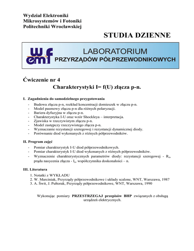 Wydział Elektroniki Mikrosystemów i Fotoniki Politechniki Wrocławskiej STUDIA DZIENNE LABORATORIUM PRZYRZĄDÓW PÓŁPRZEWODNIKOWYCH Ćwiczenie nr 4 Charakterystyki I= f(U) złącza p-n. I. Zagadnienia do samodzielnego przygotowania - Budowa złącza p-n, rozkład koncentracji domieszek w złączu p-n. Model pasmowy złącza p-n dla różnych polaryzacji. Bariera dyfuzyjna w złączu p-n. Charakterystyka I-U oraz wzór Shockleya – interpretacja. Zjawiska w rzeczywistym złączu p-n. Model zastępczy rzeczywistego złącza p-n. Wyznaczanie rezystancji szeregowej i rezystancji dynamicznej diody. Porównanie diod wykonanych z różnych półprzewodników. II. Program zajęć - Pomiar charakterystyk I-U diod półprzewodnikowych. Pomiar charakterystyk I-U diod wykonanych z różnych półprzewodników. Wyznaczenie charakterystycznych parametrów diody: rezystancji szeregowej - Rs, prądu nasycenia złącza - Is, współczynnika doskonałości – n. III. Literatura 1. Notatki z WYKŁADU 2. W. Marciniak, Przyrządy półprzewodnikowe i układy scalone, WNT, Warszawa, 1987 3. A. Świt, J. Pułtorak, Przyrządy półprzewodnikowe, WNT, Warszawa, 1990 Wykonując pomiary PRZESTRZEGAJ przepisów BHP związanych z obsługą urządzeń elektrycznych. 1 1.1 Wiadomości wstępne Charakterystyka prądowo-napięciowa złącza p-n Typowe charakterystyki przedstawiono na Rys.1 i 2. prądowo-napięciowe Rys. 1. Charakterystyka I-U diody przy polaryzacji przewodzenia i zaporowej diod półprzewodnikowych Rys. 2. Charakterystyki I-U diody germanowej i krzemowej przy polaryzacji przewodzenia W ćwiczeniu zajmiemy się dokładniejszą analizą ich przebiegu oraz pomiarami wybranych parametrów diod. Natężenie prądu płynącego przez idealne złącze p-n w funkcji napięcia polaryzacji złącza definiuje wzór Shockleya, opisujący dyfuzyjny mechanizm przepływu nośników prądu: qU I I S exp 1 kT I I S exp czyli Dn n p D p p n gdzie: I S qS L L n p qU IS kT – stała, tzw. prąd nasycenia złącza (1) (2) U – napięcie polaryzacji złącza, kT/q=26mV (w 300K) – potencjał termiczny Dp, Dn – stałe dyfuzji dziur i elektronów, Ln, Lp – drogi dyfuzji elektronów i dziur, np, pn – koncentracje nośników mniejszościowych, S – powierzchnia przekroju złącza k = 8,62·10-5 eV/K – stała Boltzmanna, T – temperatura [K], q=1,6·10-19C – ładunek elementarny W przypadku rzeczywistych złącz p-n (w diodach i tranzystorach) wartość przepływającego prądu zależy dodatkowo od: ◦ rezystancji szeregowej - Rs ◦ zjawisk rekombinacyjno-generacyjnych w obszarze złącza ◦ zjawisk powierzchniowych Przy polaryzacji złącza rzeczywistego w kierunku przewodzenia oprócz prądu dyfuzyjnego należy uwzględnić prąd rekombinacji (związany z rekombinacją nośników prądu w obszarze ładunku przestrzennego) oraz – szczególnie przy dużych wartościach prądu – spadek napięcia, na rezystancji półprzewodnika poza obszarem ładunku przestrzennego i na innych elementach konstrukcyjnych diody (kontakt metal-półprzewodnik, doprowadzenia). Prąd rekombinacji Irek zależy od koncentracji centrów rekombinacji w obszarze ładunku przestrzennego i może być przedstawiony w postaci: qU I rek I exp 1 2kT gdzie I jest analogicznym czynnikiem jak IS w zależności (1). 2 (3) Prąd ten dodaje się do prądu dyfuzyjnego złącza p-n (ze wzoru Shockley’a). Wypadkowy prąd złącza w kierunku przewodzenia IF („F” – ang. „forward”) daje się przedstawić za pomocą wzoru: qU qU I F I I rek I S exp 1 I exp 1 kT 2kT (4) Wzór ten jest podstawą modelu dwu-diodowego złącza p-n, w którym złącze to modelowane jest przez dwie diody połączone równolegle, opisane charakterystykami I = f(U) odpowiednio do składników równania (4). Po przekształceniu równania (4), prąd IF można obliczyć ze wzoru przybliżonego: qU qU I F IS exp 1 (5) i upraszczając dalej dla U>100mV: I F IS exp nkT nkT (6) Prąd I S jest stałą określającą „zastępczy prąd nasycenia”, a wartość współczynnika doskonałości złącza n zależy od udziału składowej dyfuzyjnej i rekombinacyjnej w prądzie IF płynącym przez złącze. Teoretycznie n powinno się zawierać między 1 (tylko prąd dyfuzji) i 2 (tylko prąd rekombinacji). Współczynnik n tylko w nieznaczny sposób zmienia przebieg charakterystyki I-U. Analiza efektu rezystancji szeregowej w diodzie rzeczywistej: Aby uwzględnić spadek napięcia na elementach diody poza obszarem ładunku przestrzennego zwykle wprowadza się pojęcie rezystancji szeregowej. Wiąże się to z założeniem, że ten spadek napięcia (IFRS) jest proporcjonalny do prądu płynącego przez złącze. Tak więc najprostszy model diody słuszny dla prądu stałego w kierunku przewodzenia wygląda jak na Rys.3. U-IFRS IF RS IF + RS D U Rys. 3. Model diody spolaryzowanej w kierunku przewodzenia Dioda idealna D ma charakterystykę opisaną wzorem 5 lub 6, w którym zamiast napięcia U należy podstawić wartość (U-IFRS). Tak więc, wypadkowa charakterystyka diody rzeczywistej może być opisana wzorem: qU I F RS I F I S exp 1 nkT (7) lub upraszczając dla większych wartości napięć polaryzacji, U>100mV: qU I F RS I F I S exp nkT (8) Jeśli charakterystykę (8) narysować w układzie współrzędnych, gdzie oś prądu (IF) ma skalę logarytmiczną, a oś napięcia (U) jest liniowa (układ współrzędnych log-lin), otrzymamy wykres I = f(U), jak na rysunku 4. Skala log, a nie ln, jest wygodniejsza, ponieważ oś rzędnych można wyskalować w wartościach I zmieniających się o dekadę. 3 Charakterystyka diody rzeczywistej, uwzględniająca prąd dyfuzji i rekombinacji jest w tym układzie współrzędnych linią prostą, co wynika z charakteru równania (6). Odstępstwo charakterystyki od liniowości świadczy o istnieniu rezystancji szeregowej RS,. Przecięcie liniowej części charakterystyki z osią prądową (dla U=0) pozwala wyznaczyć wartość I S . I 10-