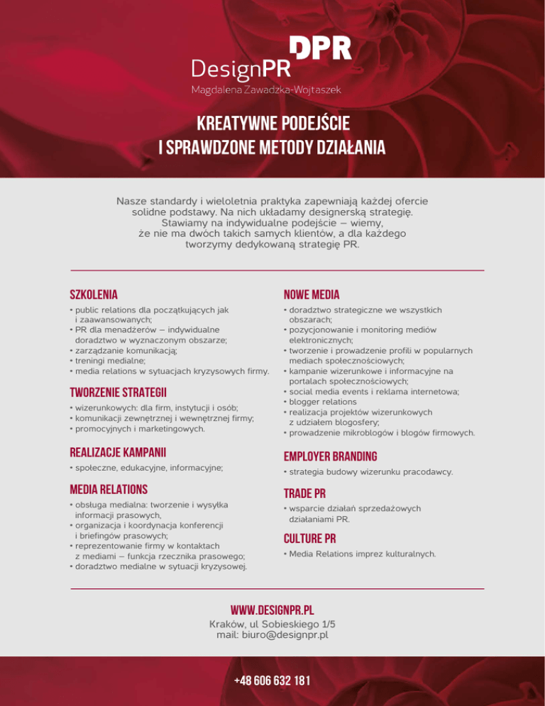 KREATYWNE PODEJŚCIE I SPRAWDZONE METODY DZIAŁANIA Nasze standardy i wieloletnia praktyka zapewniają każdej ofercie solidne podstawy. Na nich układamy designerską strategię. Stawiamy na indywidualne podejście – wiemy, że nie ma dwóch takich samych klientów, a dla każdego tworzymy dedykowaną strategię PR. Szkolenia NOWE MEDIA • public relations dla początkujących jak i zaawansowanych; • PR dla menadżerów – indywidualne doradztwo w wyznaczonym obszarze; • zarządzanie komunikacją; • treningi medialne; • media relations w sytuacjach kryzysowych firmy. • wizerunkowych: dla firm, instytucji i osób; • komunikacji zewnętrznej i wewnętrznej firmy; • promocyjnych i marketingowych. • doradztwo strategiczne we wszystkich obszarach; • pozycjonowanie i monitoring mediów elektronicznych; • tworzenie i prowadzenie profili w popularnych mediach społecznościowych; • kampanie wizerunkowe i informacyjne na portalach społecznościowych; • social media events i reklama internetowa; • blogger relations • realizacja projektów wizerunkowych z udziałem blogosfery; • prowadzenie mikroblogów i blogów firmowych. REALIZACJE KAMPANII Employer Branding tworzenie strategii • społeczne, edukacyjne, informacyjne; • strategia budowy wizerunku pracodawcy. MEDIA RELATIONS • obsługa medialna: tworzenie i wysyłka informacji prasowych, • organizacja i koordynacja konferencji i briefingów prasowych; • reprezentowanie firmy w kontaktach z mediami – funkcja rzecznika prasowego; • doradztwo medialne w sytuacji kryzysowej. Trade PR • wsparcie działań sprzedażowych działaniami PR. Culture PR • Media Relations imprez kulturalnych. WWW.DESIGNpR.pl Kraków, ul Sobieskiego 1/5 mail: [email protected] +48 606 632 181
