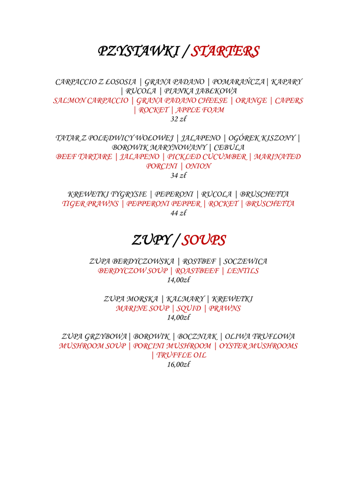 PZYSTAWKI / STARTERS CARPACCIO Z ŁOSOSIA | GRANA PADANO | POMARAŃCZA| KAPARY | RUCOLA | PIANKA JABŁKOWA SALMON CARPACCIO | GRANA PADANO CHEESE | ORANGE | CAPERS | ROCKET | APPLE FOAM 32 zł TATAR Z POLĘDWICY WOŁOWEJ | JALAPENO | OGÓREK KISZONY | BOROWIK MARYNOWANY | CEBULA BEEF TARTARE | JALAPENO | PICKLED CUCUMBER | MARINATED PORCINI | ONION 34 zł KREWETKI TYGRYSIE | PEPERONI | RUCOLA | BRUSCHETTA TIGER PRAWNS | PEPPERONI PEPPER | ROCKET | BRUSCHETTA 44 zł ZUPY / SOUPS ZUPA BERDYCZOWSKA | ROSTBEF | SOCZEWICA BERDYCZOW SOUP | ROASTBEEF | LENTILS 14,00zł ZUPA MORSKA | KALMARY | KREWETKI MARINE SOUP | SQUID | PRAWNS 14,00zł ZUPA GRZYBOWA| BOROWIK | BOCZNIAK | OLIWA TRUFLOWA MUSHROOM SOUP | PORCINI MUSHROOM | OYSTER MUSHROOMS | TRUFFLE OIL 16,00zł SAŁATKI / SALADS SER ŚLUBOWSKI | SAŁATA | GRUSZKA KOMPRESOWANA | POMIDOR | SOS ŻURAWINOWY ŚLUBOWSKI CHEESE | LETTUCE | COMPRESSED PEAR | TOMATO | CRANBERRY SAUCE 34 zł SZYNKA PROSCIUTTO CRUDO | RUCOLA| SUSZONE POMIDORY | GRANNA PADANO | OLIWKI| PIANKA BAZYLIOWA PROSCIUTTO CRUDO | ROCKET | SUN-DRIED TOMATOES | GRANA PADANO | OLIVES | BASIL FOAM 36 zł KURCZAK SOUS-VIDE| SAŁATA LODOWA| BEKON | PIECZARKA BRUNATNA | POMIDOR | OGÓREK | SALSA VERDE SOUS - VIDE CHICKEN | ICEBERG LETTUCE | BACON | BROWN MUSHROOMS | TOMATO | COCUMBER |SALSA VERDE 34 zł RĘCZNIE ROBIONE MAKARONY / HOMEMADE PASTA CZARNE SPAGHETTI | KURCZAK | POMIDOR SUSZONY BLACK SPAGHETTI | CHICKEN | SUN-DRIED TOMATO 34 zł REGINETTE | BOROWIK| PODGRZYBEK | PIECZARKA | TRUFLE REGINETTE | PORCINI | BOLETES | CHAMPIGNON | TRUFFLE 36 zł TAGLIATELLE | POLĘDWICZKA WIEPRZOWA | KASZTANY | PIECZARKA BRUNATNA | JARMUŻ | PIEPRZ ZIELONY TAGLIATELLE | PORK LOIN | CHESTNUT | BROWN CHAMPIGNON | CURLY KALE | GREEN PEPPER 36 zł DANIA GŁÓWNE / MAIN COURSES STEK Z POLĘDWICY WOŁOWEJ SOUS - VIDE| ZIEMNIAK | SZPINAK | SOS DO WYBORU – Z ZIELONEGO PIEPRZU, BBQ, SEROWY SOUS - VIDE BEEF SIRLOIN | POTATO | SPINACH | SAUCE OF YOUR CHOICE: GREEN PEPPER, BBQ, CHEESE 77 zł PIEROGI | ZBÓJNICKIE | KURCZAK Z CURRY | FASOLA ZE ŚLIWKĄ STUFFED DUMPLINGS| POTATO AND BACON | CHICKEN CURRY FLAVOUR | WHITE BEAN AND PLUM 32 zł KACZKA SOUS - VIDE | KASZA GRYCZANA | PUREE Z DYNI | GRUSZKA KOMPRESOWANE | PUDER BOROWIKOWY DUCK SOUS-VIDE | BUCKWHEAT | PUMPKIN PUREE | COMPRESSED PEAR | PORCINI MUSHROOMS POWDER 49 zł PIERŚ Z KURCZAKA ZAGRODOWEGO SOUS - VIDE | ZIEMNIAK TRUFLOWY| RATATOUILLE Z CHILI BACKYARD CHICKEN BREAST SOUS - VIDE| PURPLE POTATO | CHILI RATATOUILLE 46 zł TUŃCZYK | PASTERNAK | MARCHEW | CYTRUSOWY KAWIOR TUNA | PARSNIP | CARROT | CITRUS CAVIAR 72 zł POLĘDWICZKA WIEPRZOWA SOUS - VIDE| PUREE Z PASTERNAKA |KALAFIOR TRIO-FIOLETOWY -ROMANESCO-BIAŁY | PUDER ORZECHOWY PORK LOIN SOUS - VIDE | PARSNIP PUREE | TRIO CAULIFLOWER PURPLE-ROMANESCO-WHITE | HAZELNUT POWDER 46 zł ŻEBERKA | ZIEMNIAK | KAPUSTA ZASMAŻANA | BOROWIK PORK RIBS | POTATO| FRIED CABBAGE | PORCINI MUSHROOMS 48 zł STEK TOMAHAWK SOUS - VIDE | FRYTKI STEKOWE | GRILLOWANE WARZYWA | TYMIANEK CYTRYNOWY | SOS MIODOWO - MUSZTARDOWY TOMAHAWK STEAK SOUS - VIDE | CHIPS | GRILLED VEGETABLES |LEMON THYME | HONEY - MUSTARD SAUCE 119 zł DESERY / DESSERTS NALEŚNIK CZEKOLADOWY | BANAN | AJERKONIAK | PUDER Z BIAŁEJ CZEKOLADY CHOCOLATE CREPES | BANANA | ADVOCAAT | WHITE CHOCOLATE POWDER 14,00zł SUFLET CYTRYNOWY | LODY BAZYLIOWE | PUDER CZEKOLADOWY LEMON SOUFFLE | BASIL ICE CREAM | CHOCOLATE POWDER 15,00zł SERNIK BRULEE | SER ŚLUBOWSKI| KAWIOR MALINOWY CREME BRULEE CHEESECAKE | ŚLUBOWSKI COTTAGE CHEESE | RASPBERRY CAVIAR 14,00zł