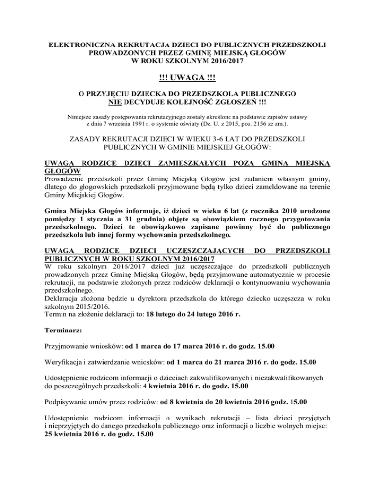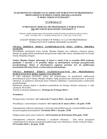 ELEKTRONICZNA REKRUTACJA DZIECI DO PUBLICZNYCH PRZEDSZKOLI PROWADZONYCH PRZEZ GMINĘ MIEJSKĄ GŁOGÓW W ROKU SZKOLNYM 2016/2017 !!! UWAGA !!! O PRZYJĘCIU DZIECKA DO PRZEDSZKOLA PUBLICZNEGO NIE DECYDUJE KOLEJNOŚĆ ZGŁOSZEŃ !!! Niniejsze zasady postępowania rekrutacyjnego zostały określone na podstawie zapisów ustawy z dnia 7 września 1991 r. o systemie oświaty (Dz. U. z 2015, poz. 2156 ze zm.). ZASADY REKRUTACJI DZIECI W WIEKU 3-6 LAT DO PRZEDSZKOLI PUBLICZNYCH W GMINIE MIEJSKIEJ GŁOGÓW: UWAGA RODZICE DZIECI ZAMIESZKAŁYCH POZA GMINĄ MIEJSKĄ GŁOGÓW Prowadzenie przedszkoli przez Gminę Miejską Głogów jest zadaniem własnym gminy, dlatego do głogowskich przedszkoli przyjmowane będą tylko dzieci zameldowane na terenie Gminy Miejskiej Głogów. Gmina Miejska Głogów informuje, iż dzieci w wieku 6 lat (z rocznika 2010 urodzone pomiędzy 1 stycznia a 31 grudnia) objęte są obowiązkiem rocznego przygotowania przedszkolnego. Dzieci te obowiązkowo zapisane powinny być do publicznego przedszkola lub innej formy wychowania przedszkolnego. UWAGA RODZICE DZIECI UCZĘSZCZAJĄCYCH DO PRZEDSZKOLI PUBLICZNYCH W ROKU SZKOLNYM 2016/2017 W roku szkolnym 2016/2017 dzieci już uczęszczające do przedszkoli publicznych prowadzonych przez Gminę Miejską Głogów, będą przyjmowane automatycznie w procesie rekrutacji, na podstawie złożonych przez rodziców deklaracji o kontynuowaniu wychowania przedszkolnego. Deklaracja złożona będzie u dyrektora przedszkola do którego dziecko uczęszcza w roku szkolnym 2015/2016. Termin na złożenie deklaracji to: 18 lutego do 24 lutego 2016 r. Terminarz: Przyjmowanie wniosków: od 1 marca do 17 marca 2016 r. do godz. 15.00 Weryfikacja i zatwierdzanie wniosków: od 1 marca do 21 marca 2016 r. do godz. 15.00 Udostępnienie rodzicom informacji o dzieciach zakwalifikowanych i niezakwalifikowanych do poszczególnych przedszkoli: 4 kwietnia 2016 r. do godz. 15.00 Podpisywanie umów przez rodziców: od 8 kwietnia do 20 kwietnia 2016 godz. 15.00 Udostępnienie rodzicom informacji o wynikach rekrutacji – lista dzieci przyjętych i nieprzyjętych do danego przedszkola publicznego oraz informacji o liczbie wolnych miejsc: 25 kwietnia 2016 r. do godz. 15.00 Rekrutacja uzupełniająca: od 3 czerwca 2016 r. do wyczerpania wolnych miejsc Informacja o wszystkich publicznych przedszkolach znajduje się w Informatorze. Ważne pojęcia: „Przedszkole pierwszego wyboru” – tak określamy przedszkole, do którego chcecie Państwo zapisać dziecko w pierwszej kolejności „Wniosek rekrutacyjny” – to karta zapisu do wypełnienia przez rodziców/opiekunów prawnych przy zapisywaniu dziecka do przedszkola. Etap wstępny – informator Od dnia 1 marca 2016 r. na stronie internetowej dla rodziców dostępny jest informator zawierający ofertę przedszkoli, znajdujących się na terenie Gminy Miejskiej Głogów. Rodzice mają możliwość przeglądania ofert przedszkoli, w których znajdują się takie informacje jak: dane teleadresowe przedszkola, liczba miejsc w przedszkolu, oferta edukacyjna przedszkola, opis przedszkola oraz jego historia. 1. Wypełnienie Wniosku rekrutacyjnego dziecka do placówki - Elektroniczna rekrutacja do przedszkoli trwa od dnia 1 do 17 marca 2016 r. do godz. 15.00, obejmuje wprowadzanie danych dzieci do systemu i złożenie Wniosku Rekrutacyjnego dziecka do przedszkola. - Aby dziecko wzięło udział w rekrutacji, rodzic jest zobowiązany do wypełnienia Wniosku Rekrutacyjnego dziecka do placówki. We Wniosku Rekrutacyjnym rodzic deklaruje wybór maksymalnie 3 placówek, do których stara się o przyjęcie dziecka. 2. Dwa sposoby składania podań przez rodziców: 1) Rodzic może wypełnić Wniosek Rekrutacyjny elektronicznie poprzez stronę internetową, a następnie wydrukować wypełniony Wniosek. Wypełnione podanie należy podpisać, a następnie udać się do przedszkola pierwszego wyboru w celu złożenia Wniosku. Wniosek Rekrutacyjny rodzic składa tylko w placówce pierwszego wyboru, bez konieczności potwierdzania Wniosku w pozostałych placówkach. 2) Jeżeli rodzic nie ma możliwości skorzystania z komputera z dostępem do Internetu, wypełnia ręcznie papierowy Wniosek Rekrutacyjny (można go otrzymać w każdym przedszkolu) i udaje się jedynie do placówki pierwszego wyboru (czyli przedszkola znajdującego się na pierwszym miejscu na liście przedszkoli, do którego stara się o przyjęcie dziecka) w celu złożenia Wniosku. Wypełniając „Wniosek Rekrutacyjny” należy wskazać placówkę, do którego chcecie Państwo zapisać dziecko jako „przedszkole pierwszego wyboru”. Można dodatkowo wpisać dwie inne placówki, które będą brane pod uwagę w przypadku, gdyby Państwa dziecko nie zostało przyjęte do „przedszkola pierwszego wyboru”. Dyrektor „przedszkola pierwszego wyboru” lub osoba przez Niego upoważniona, przed zatwierdzeniem Państwa podania, poprosi o przedstawienie dokumentów w celu weryfikacji danych zapisanych we „Wniosku Rekrutacyjnym”. 3. Potwierdzanie wniosku przez rodzica w przedszkolu pierwszego wyboru: Jeśli rodzic wypełni wniosek za pośrednictwem strony internetowej, to jego wniosek zostanie zapisany automatycznie w systemie. Rodzic z wersją papierową wniosku musi koniecznie udać się osobiście do przedszkola pierwszego wyboru i potwierdzić Wniosek Rekrutacyjny najpóźniej do dnia 21 marca 2016r. do godz. 15.00. Po zatwierdzeniu wniosku przez właściwe przedszkole, rodzic ma możliwość przeglądania wniosku przez Internet, jednakże bez możliwości jego edycji. W przypadku gdy rodzic wypełnia wniosek w formie papierowej, wniosek do systemu wprowadza przedszkole pierwszego wyboru. Rodzic otrzymuje hasło dostępu do systemu i w każdej chwili może sprawdzić poprawność danych w systemie oraz w późniejszym etapie (wynik rekrutacji). 4. Rekrutacja automatyczna: Kolejnym etapem jest automatyczna rekrutacja dzieci do przedszkoli. Oznacza to, iż system p