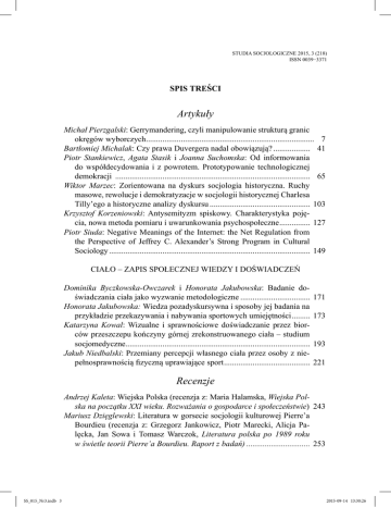 STUDIA SOCJOLOGICZNE 2015, 3 (218) ISSN 0039−3371 SPIS TREŚCI Artykuły Michał Pierzgalski: Gerrymandering, czyli manipulowanie strukturą granic okręgów wyborczych.................................................................................. 7 Bartłomiej Michalak: Czy prawa Duvergera nadal obowiązują? .................. 41 Piotr Stankiewicz, Agata Stasik i Joanna Suchomska: Od informowania do współdecydowania i z powrotem. Prototypowanie technologicznej demokracji ............................................................................................... 65 Wiktor Marzec: Zorientowana na dyskurs socjologia historyczna. Ruchy masowe, rewolucje i demokratyzacje w socjologii historycznej Charlesa Tilly’ego a historyczne analizy dyskursu ................................................. 103 Krzysztof Korzeniowski: Antysemityzm spiskowy. Charakterystyka pojęcia, nowa metoda pomiaru i uwarunkowania psychospołeczne ............... 127 Piotr Siuda: Negative Meanings of the Internet: the Net Regulation from the Perspective of Jeffrey C. Alexander’s Strong Program in Cultural Sociology .................................................................................................. 149 CIAŁO – ZAPIS SPOŁECZNEJ WIEDZY I DOŚWIADCZEŃ Dominika Byczkowska-Owczarek i Honorata Jakubowska: Badanie doświadczania ciała jako wyzwanie metodologiczne .................................. Honorata Jakubowska: Wiedza pozadyskursywna i sposoby jej badania na przykładzie przekazywania i nabywania sportowych umiejętności ......... Katarzyna Kowal: Wizualne i sprawnościowe doświadczanie przez biorców przeszczepu kończyny górnej zrekonstruowanego ciała – studium socjomedyczne.......................................................................................... Jakub Niedbalski: Przemiany percepcji własnego ciała przez osoby z niepełnosprawnością fizyczną uprawiające sport .......................................... 171 173 193 221 Recenzje Andrzej Kaleta: Wiejska Polska (recenzja z: Maria Halamska, Wiejska Polska na początku XXI wieku. Rozważania o gospodarce i społeczeństwie) 243 Mariusz Dzięglewski: Literatura w gorsecie socjologii kulturowej Pierre’a Bourdieu (recenzja z: Grzegorz Jankowicz, Piotr Marecki, Alicja Palęcka, Jan Sowa i Tomasz Warczok, Literatura polska po 1989 roku w świetle teorii Pierre’a Bourdieu. Raport z badań) ............................... 253 SS_015_Nr3.indb 3 2015-09-14 13:30:26 STUDIA SOCJOLOGICZNE 2015, 3 (218) ISSN 0039−3371 Marta Bucholc: Format naszych czasów. O książce Mirosławy Marody Jednostka po nowoczesności (recenzja z: Mirosława Marody, Jednostka po nowoczesności) ................................................................................... 265 Marta Bucholc: Przyczynek do socjologii aktualności (recenzja z: Ossowski z perspektywy półwiecza, red. Antoniego Sułka) ................................ 277 MŁODA SOCJOLOGIA (www.studiasocjologiczne.pl) Magdalena Słupińska: Ekonomia dzielenia się? Między racjonalnym wyborem a towarzyskością. Próby socjologicznych interpretacji zjawiska „wspólnych przejazdów (carpooling)” SS_015_Nr3.indb 4 2015-09-14 13:30:26