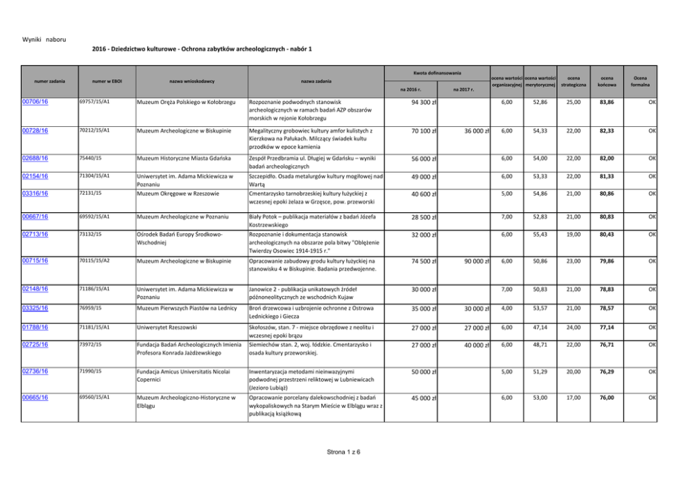 Wyniki naboru 2016 - Dziedzictwo kulturowe - Ochrona zabytków archeologicznych - nabór 1 Kwota dofinansowania numer zadania numer w EBOI nazwa wnioskodawcy nazwa zadania na 2016 r. 00706/16 69757/15/A1 Muzeum Oręża Polskiego w Kołobrzegu Rozpoznanie podwodnych stanowisk archeologicznych w ramach badań AZP obszarów morskich w rejonie Kołobrzegu 94 300 zł 00728/16 70212/15/A1 Muzeum Archeologiczne w Biskupinie Megalityczny grobowiec kultury amfor kulistych z Kierzkowa na Pałukach. Milczący świadek kultu przodków w epoce kamienia 70 100 zł 02688/16 75440/15 Muzeum Historyczne Miasta Gdańska Zespół Przedbramia ul. Długiej w Gdańsku – wyniki badań archeologicznych 02154/16 71304/15/A1 03316/16 72131/15 Uniwersytet im. Adama Mickiewicza w Poznaniu Muzeum Okręgowe w Rzeszowie 00667/16 69592/15/A1 02713/16 na 2017 r. ocena wartości ocena wartości organizacyjnej merytorycznej ocena strategiczna ocena końcowa Ocena formalna 6,00 52,86 25,00 83,86 OK 6,00 54,33 22,00 82,33 OK 56 000 zł 6,00 54,00 22,00 82,00 OK Szczepidło. Osada metalurgów kultury mogiłowej nad Wartą Cmentarzysko tarnobrzeskiej kultury łużyckiej z wczesnej epoki żelaza w Grzęsce, pow. przeworski 49 000 zł 6,00 53,33 22,00 81,33 OK 40 600 zł 5,00 54,86 21,00 80,86 OK Muzeum Archeologiczne w Poznaniu Biały Potok – publikacja materiałów z badań Józefa Kostrzewskiego 28 500 zł 7,00 52,83 21,00 80,83 OK 73132/15 Ośrodek Badań Europy ŚrodkowoWschodniej Rozpoznanie i dokumentacja stanowisk archeologicznych na obszarze pola bitwy "Oblężenie Twierdzy Osowiec 1914-1915 r." 32 000 zł 6,00 55,43 19,00 80,43 OK 00715/16 70115/15/A2 Muzeum Archeologiczne w Biskupinie Opracowanie zabudowy grodu kultury łużyckiej na stanowisku 4 w Biskupinie. Badania przedwojenne. 74 500 zł 6,00 50,86 23,00 79,86 OK 02148/16 71186/15/A1 Uniwersytet im. Adama Mickiewicza w Poznaniu Janowice 2 - publikacja unikatowych źródeł późnoneolitycznych ze wschodnich Kujaw 30 000 zł 7,00 50,83 21,00 78,83 OK 03325/16 76959/15 Muzeum Pierwszych Piastów na Lednicy Broń drzewcowa i uzbrojenie ochronne z Ostrowa Lednickiego i Giecza 35 000 zł 30 000 zł 4,00 53,57 21,00 78,57 OK 01788/16 71181/15/A1 Uniwersytet Rzeszowski 27 000 zł 27 000 zł 6,00 47,14 24,00 77,14 OK 02725/16 73972/15 Fundacja Badań Archeologicznych Imienia Profesora Konrada Jażdżewskiego Skołoszów, stan. 7 - miejsce obrzędowe z neolitu i wczesnej epoki brązu Siemiechów stan. 2, woj. łódzkie. Cmentarzysko i osada kultury przeworskiej. 27 000 zł 40 000 zł 6,00 48,71 22,00 76,71 OK 02736/16 71990/15 Fundacja Amicus Universitatis Nicolai Copernici Inwentaryzacja metodami nieinwazyjnymi podwodnej przestrzeni reliktowej w Lubniewicach (Jezioro Lubiąż) 50 000 zł 5,00 51,29 20,00 76,29 OK 00665/16 69560/15/A1 Muzeum Archeologiczno-Historyczne w Elblągu Opracowanie porcelany dalekowschodniej z badań wykopaliskowych na Starym Mieście w Elblągu wraz z publikacją książkową 45 000 zł 6,00 53,00 17,00 76,00 OK Strona 1 z 6 36 000 zł 90 000 zł 00701/16 69590/15/A1 Muzeum Archeologiczne w Poznaniu Osadnictwo wielokulturowe w Napachaniu, gm. Rokietnica, stan. 59. Wyniki badań archeologicznych 34 000 zł 03222/16 75875/15 Muzeum Podlaskie w Białymstoku Pomiędzy Wschodem a Zachodem. Osadnictwo z epoki kamienia i prologu epoki brązu w GrądachWoniecko, woj. podlaskie. 41 000 zł 02132/16 71802/15/A2 Uniwersytet Marii Curie-Skłodowskiej w Lublinie 03210/16 74047/15 02716/16 37 000 zł 6,00 50,67 19,00 75,67 OK 6,00 50,50 19,00 75,50 OK 6,00 52,33 17,00 75,33 OK Robert Liebig archeolog amator z Wielkopolski nowe "stare" źródła do pradziejów Wielkopolski i Ziemi Lubuskiej Muzeum im. ks. St. Staszica w Hrubieszowie Wielokulturowe cmentarzysko w Czerniczynie nieznane źródło wiedzy o epoce brązu i wczesnym średniowieczu. 33 000 zł 28 000 zł 27 000 zł 6,00 49,83 19,00 74,83 OK 72779/15 Muzeum Archeologiczne i Etnograficzne w Łodzi Opracowanie cmentarzysk łużyckich pół popielnicowych z Polski Środkowej z epoki brązu (Lutomiersk-Wrząca 1, Mastki 2) 73 000 zł 30 000 zł 6,00 48,43 20,00 74,43 OK 04699/16 77426/15 Stowarzyszenie Naukowe Archeologów Polskich Oddział w Łodzi Uzupełnienie i publikacja nieinwazyjnych badań grodzisk Polski Centralnej 65 000 zł 36 000 zł 6,00 46,43 22,00 74,43 OK 03897/16 71110/15 Muzeum Narodowe w Poznaniu Krajobraz archeologiczny wokół zamku w Gołuchowie - nieinwazyjne badania i stworzenie bazy danych GIS 36 000 zł 6,00 48,33 20,00 74,33 OK 04695/16 76414/15 Muzeum Archeologiczne w Gdańsku Opracowanie archeologiczne i antropologiczne wyników badań nowożytnych ossuariów w Gdańsku, wraz z wydaniem publikacji. 42 000 zł 52 000 zł 6,00 48,00 20,00 74,00 OK 00723/16 70489/15/A1 Muzeum Warszawy Między miastem a dworem. Badania archeologiczne placu Zamkowego w Warszawie w latach 1977-1983. 30 000 zł 85 000 zł 7,00 51,86 15,00 73,86 OK 02701/16 74103/15 Fundacja Rzeszowskiego Ośrodka Archeologicznego Publikacja pt. „Stanowiska 24, 25 i 27 w Mirocinie. Część I. Osadnictwo późnopolgarskie i kultury pucharów lejkowatych" 30 000 zł 6,00 46,57 21,00 73,57 OK 03882/16 76544/15 Fundacja Archeologiczna Kompleksowe, nieinwazyjne rozpoznanie wczesnośredniowiecznego kompleksu osadniczego w Klenicy woj. lubuskie 38 000 zł 7,00 41,17 25,00 73,17 OK 02743/16 75719/15 Stowarzyszenie Naukowe Archeologów Polskich Oddział w Warszawie Niedestruktywne rozpoznanie i dokumentacja dziedzictwa archeologicznego Kotliny Chodelskiej 110 000 zł 5,00 47,00 21,00 73,00 OK 02727/16 74520/15 Fundacja Badań Archeologicznych Imienia Profesora Konrada Jażdżewskiego Publikacja: Ratownicze badania archeologiczne na stanowisko 10 w Kruszynie, pow. Włocławek, woj. kujawsko-pomorskie. 40 000 zł 7,00 41,86 24,00 72,86 OK 02663/16 76967/15 Stowarzyszenie "Nasz Zamek" Zamek w Sochaczewie. Dzieje - archeologia architektura. 28 000 zł 4,00 38,29 30,00 72,29 OK 02726/16 74494/15 Fundacja Badań Archeologiczn