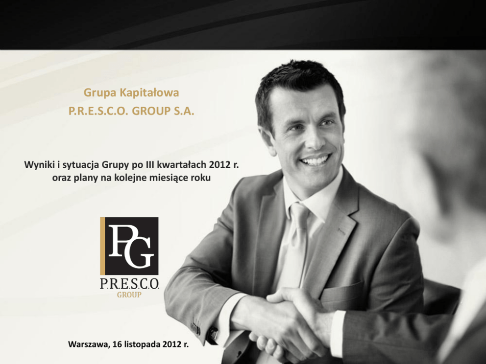 Grupa Kapitałowa P.R.E.S.C.O. GROUP S.A. Wyniki i sytuacja Grupy po III kwartałach 2012 r. oraz plany na kolejne miesiące roku Warszawa, 16 listopada 2012 r. AGENDA Sytuacja na rynku obrotu wierzytelnościami w Polsce Istotne założenia u podstaw działalności Grupy Kapitałowej P.R.E.S.C.O. GROUP S.A. Najważniejsze dokonania GK P.R.E.S.C.O. GROUP S.A. w trzech kwartałach 2012 roku Wyniki i wskaźniki finansowe po trzech kwartałach 2012 r. Komentarz do prognoz finansowych Perspektywy i plany na kolejne miesiące roku 2 KOLEJNY KWARTAŁ REKORDOWYCH WYNIKÓW GK P.R.E.S.C.O. Rekordowe nakłady na inwestycje: 61,2 mln PLN Dostęp do finansowania (PEON) efektywny i bezpieczny poziom zadłużenia Przychody na poziomie 72% prognozy: 64,7 mln PLN Niższa dynamika nakładów na windykację egzekucyjną: 23,4 mln PLN Rekordowa liczba (1,02 mln) i wartość (1,3 mld PLN) prowadzonych spraw 31,4 mln PLN zysku brutto na sprzedaży (370% wzrostu) 13,7 mln PLN zysku netto (49,4% wzrostu) Umocnienie się na rynku wierzytelności bankowych: 4,5% udziału w rynku Wzrost udziału w rynku z 1,42% do 6,91% yoy 3 Sytuacja na rynku obrotu wierzytelnościami w Polsce w okresie od stycznia do września 2012 4 SYTUACJA FINANSOWA POLAKÓW SPRZYJA ROZWOJOWI BRANŻY Z ostatniego raportu InfoDług przygotowanego przez Biuro Informacji Gospodarczej wynika, że między czerwcem, a wrześniem 2012 roku saldo zadłużenia Polaków wzrosło o 950 mln zł i wyniosło 37,03 mld zł. Porównując z analogicznym okresem 2011 roku zwiększyło się o 4,52 mld zł. Wartość zadłużenia przypadająca na jednego Polaka (w tys. zł) 160 % 13,86 14,7 15,63 16,48 16,56 16,48 16,71 25,06 12,62 10,47 V 2010 21,97 11,4 VIII 2010 XI II 2011 V 2011 VIII 2010 2011 Łączna wartość zadłużenia Polaków (w mld zł.) 37,03 35,75 36,08 34,35 168 % 30,89 32,51 28,21 XI 2011 III 2012 VI 2012 IX 2012 VIII 2010 XI 2010 II 2011 V 2011 VIII 2011 XI 2011 III 2012 VI 2012 IX 2012 Źródło: InfoDług 09.2012 Z danych InfoMonitora wynika, że aż 2,215 mln Polaków ma problem z regulowaniem swoich zobowiązań. W porównaniu z czerwcem 2012 r. odsetek ten wzrósł o 9 proc.. Oznacza to, że na każde 1000 osób mieszkających na terenie naszego kraju 58 nie reguluje swoich zobowiązań terminowo 5 PERSPEKYTYWY ROZWOJU BRANŻY OBROTU WIERZYELNOŚCIAMI Prognozy Instytutu Badań nad Gospodarką Rynkową wskazują, że w 2012 roku rynek obrotu wierzytelnościami osiągnie wartość 22,8 mld zł. W dynamicznym tempie ma się również rozwijać rynek mediów elektronicznych, a jego wycena w 2012 roku ma sięgnąć 48,9 mld zł. Prognoza wzrostu rynku mediów elektronicznych (telefonia stacjonarna i komórkowa, CATV, Internet) (w mld zł) Prognoza wzrostu rynku mediów elektronicznych (telefonia stacjonarna i komórkowa, CATV, Internet) (w mld zł) 248 % 11,6 11,8 11,2 12,2 42 42 2008 2009 43 46,6 48,9 51 52 11,4 5,2 8,9 3,5 7,5 5,4 2007 2008 Źródło: Audytel 5,4 6,6 2009 2010 zakup 10 11 10,2 9,9 2011 2012 2013 2014 inkaso Źródło: Audytel 2010 2011 2012P 2013P 2014P Prognoza wzrostu rynku mediów elektronicznych (telefonia stacjonarna i komórkowa, CATV, Internet) Prognozy wzrostu wartości rynku mediów elektronicznych z 43 do 52 mld PLN w 2014 r. (CAGR 2010-2015 3,4%); determinanty wzrostu rynku to m.in.: wzrost penetracji usług GSM i dostępu do Internetu, nowe technologie – LTE, coraz większy udział CATV w rynku wierzytelności. Wysoki udział rynkowy P.R.E.S.C.O. w rynku wierzytelności z sektora mediów elektronicznych w IH 2012 r. – ponad 21 proc. 6 OCENA SYTUACJI NA RYNKU PORTFELI WYSTAWIONYCH NA SPRZEDAŻ W TRZECH KWARTAŁACH 2012 r. W pierwszych 9 miesiącach 2012 r. na rynek trafiły portfele o łącznej wartości 5,17 mld zł (wobec 4,22 mld zł rok wcześniej) Oferowane portfele to wierzytelności powstałe głównie w okresu spowolnienia gospodarczego 2008 - 2010 Rosnący udział wierzytelności oferowanych przez instytucje finansowe (banki, ubezpieczyciele) Nieznaczny spadek wartości i liczby portfeli oferowanych przez firmy z sektora pozafinansowego (wobec III kw. 2011) Duże zapotrzebowanie na kapitał wśród spółek z branży obrotu wierzytelnościami Niższa jakość oferowanych portfeli (po lub w trakcie bezskutecznej windykacji) Wyższe ceny za portfele (zmiany w kierunku rynku sprzedającego) – nieznaczna stabilizacja cen w ostatnich tygodniach Struktura i wartość rynku zakupu wierzytelności po III kw. 2012 r. Struktura i wartość rynku zakupu wierzytelności po III kw. 2011 r. 654 688 tys. PLN (12,7%) 717 183 tys. PLN (17%) 3 502 986 tys. PLN (83,%) 4 517 454 tys. PLN (87,3%) instytucje finansowe Źródło: Spółka instytucje pozafinansowe instytucje finansowe instytucje pozafinansowe Źródło: Spółka 7 Istotne założenia u podstaw działalności Grupy Kapitałowej P.R.E.S.C.O. GROUP S.A. 8 ŹRÓDŁA PRZEWAGI KONKURENCYJNEJ GK P.R.E.S.C.O. GROUP Autorski system zarządzania procesem inwestycji i windykacji Selektywny dobór portfeli – dążenie do maksymalizacji zwrotu z inwestycji Bezpieczny poziom zadłużenia Wypracowany na podstawie 14 lat doświadczeń w obrocie wierzytelnościami i dostosowany do specyfiki działania firmy Wąski segment specjalizacji Celowa rezygnacja z windykacji na zlecenie Inwestowanie wyłącznie w wierzytelności detaliczne o relatywnie niskiej wartości jednostkowej nabywane od firm i instytucji W pierwszych 9 miesiącach 2012 138 tys. PLN zysku netto z każdego zainwestowanego miliona PLN (ROE 13,8%) Wskaźnik zadłużenia kapitałów własnych na poziomie 0,81 Optymalizacja rozwiązań podatkowych dzięki strukturze Grupy Kapitałowej Model wyceny księgowej portfela wierzytelności Efektywna stopa podatku dochodowego ok. 0% Transparentność przyjętej metodologii 9 Najważniejsze dokonania Grupy Kapitałowej P.R.E.S.C.O. GROUP S.A. w ciągu 9 miesięcy 2012 r. 10 ROZWÓJ ZGODNY Z ZAŁOŻENIAMI STRATEGICZNYMI – INWESTYCJE 305023,0 303183,0 Wartość nominalna