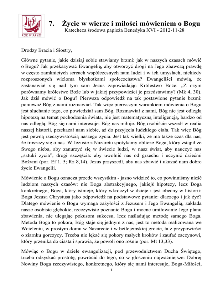 7. Życie w wierze i miłości mówieniem o Bogu Katecheza środowa papieża Benedyka XVI - 2012-11-28 Drodzy Bracia i Siostry, Główne pytanie, jakie dzisiaj sobie stawiamy brzmi: jak w naszych czasach mówić o Bogu? Jak przekazywać Ewangelię, aby otworzyć drogi na Jego zbawczą prawdę w często zamkniętych sercach współczesnych nam ludzi i w ich umysłach, niekiedy rozproszonych wieloma błyskotkami społeczeństwa? Ewangeliści mówią, że zastanawiał się nad tym sam Jezus zapowiadając Królestwo Boże: „Z czym porównamy królestwo Boże lub w jakiej przypowieści je przedstawimy? (Mk 4, 30). Jak dziś mówić o Bogu? Pierwsza odpowiedź na tak postawione pytanie brzmi: ponieważ Bóg z nami rozmawiał. Tak więc pierwszym warunkiem mówienia o Bogu jest słuchanie tego, co powiedział sam Bóg. Rozmawiał z nami, Bóg nie jest odległą hipotezą na temat pochodzenia świata, nie jest matematyczną inteligencją, bardzo od nas odległą. Bóg się nami interesuje. Bóg nas miłuje. Bóg osobiście wszedł w realia naszej historii, przekazał nam siebie, aż do przyjęcia ludzkiego ciała. Tak więc Bóg jest pewną rzeczywistością naszego życia. Jest tak wielki, że ma także czas dla nas, że troszczy się o nas. W Jezusie z Nazaretu spotykamy oblicze Boga, który zstąpił ze Swego nieba, aby zanurzyć się w świecie ludzi, w nasz świat, aby nauczyć nas „sztuki życia”, drogi szczęścia: aby uwolnić nas od grzechu i uczynić dziećmi Bożymi (por. Ef 1, 5; Rz 8,14). Jezus przyszedł, aby nas zbawić i ukazać nam dobre życie Ewangelii. Mówienie o Bogu oznacza przede wszystkim - jasno widzieć to, co powinniśmy nieść ludziom naszych czasów: nie Boga abstrakcyjnego, jakiejś hipotezy, lecz Boga konkretnego, Boga, który istnieje, który wkroczył w dzieje i jest obecny w historii: Boga Jezusa Chrystusa jako odpowiedź na podstawowe pytanie: dlaczego i jak żyć? Dlatego mówienie o Bogu wymaga zażyłości z Jezusem i Jego Ewangelią, zakłada nasze osobiste głębokie, rzeczywiste poznanie Boga i mocne umiłowanie Jego planu zbawienia, nie ulegając pokusom sukcesu, lecz naśladując metodę samego Boga. Metoda Boga to pokora, Bóg staje się jednym z nas, jest to metoda realizowana we Wcieleniu, w prostym domu w Nazarecie i w betlejemskiej grocie, ta z przypowieści o ziarnku gorczycy. Trzeba nie lękać się pokory małych kroków i zaufać zaczynowi, który przenika do ciasta i sprawia, że powoli ono rośnie (por. Mt 13,33). Mówiąc o Bogu w dziele ewangelizacji, pod przewodnictwem Ducha Świętego, trzeba odzyskać prostotę, powrócić do tego, co w głoszeniu najważniejsze: Dobrej Nowiny Boga rzeczywistego, konkretnego, który się nami interesuje, Boga-Miłości, 1 który zbliża się do nas w Jezusie Chrystusie aż po Krzyż, i Który w Zmartwychwstaniu daje nam nadzieję i otwiera nas na życie, które nie ma końca, na życie wieczne, życie prawdziwe. Niezwykły głosiciel, jakim był św. Paweł Apostoł daje nam lekcję, która zmierza wprost do centrum wiary, problemu jak mówić o Bogu z wielką prostotą. Przed chwilą usłyszeliśmy następujące słowa z pierwszego Listu do Koryntian: „Przyszedłszy do was, bracia, nie przybyłem, aby błyszcząc słowem i mądrością głosić wam świadectwo Boże. Postanowiłem bowiem, będąc wśród was, nie znać niczego więcej, jak tylko Jezusa Chrystusa, i to ukrzyżowanego” (2, 1-2). Tak więc po pierwsze św. Paweł nie mówi o jakieś filozofii, którą wypracował, nie mówi o ideach znalezionych gdzie indziej, czy wymyślonych przez siebie. Mówi o realiach swojego życia, o Bogu, który wkroczył w jego życie, mówi o Bogu realnym, żyjącym, z którym rozmawiał, o Chrystusie ukrzyżowanym i zmartwychwstałym. Ponadto nie szuka samego siebie, nie chce utworzyć zespołu ludzi, którzy będą go podziwiali, nie chce przejść do historii jako zwierzchnik jakieś szkoły wielkiej wiedzy. Paweł głosi Chrystusa, pragnie pozyskać ludzi dla Boga prawdziwego i rzeczywistego. Mówi pragnąc głosić jedynie Tego, który wkroczył w jego życie, i Który jest prawdziwym życiem, Który go zdobył na drodze do Damaszku. Tak więc mówienie o Bogu oznacza danie miejsca Temu, który pozwala siebie poznać, Który objawia swoje oblicze miłości: oznacza porzucenie własnego ja, aby je oddać Chrystusowi, będąc świadomymi, że to nie my możemy pozyskać innych dla Boga, lecz powinniśmy ich oczekiwać od samego Boga, modlić się o nich u Niego. Mówienie o Bogu rodzi się więc zawsze ze słuchania Go, z naszego poznania Boga, które dokonuje się w naszej zażyłości z Bogiem w życiu modlitwy i zgodnie z przykazaniami. Dla św. Pawła przekazywanie wiary nie oznacza więc niesienia samego siebie, lecz mówienie otwarcie i publicznie tego, co widział i słyszał w spotkaniu z Chrystusem, tego czego doświadczył w swoim życiu przemienionym już tym spotkaniem: to niesienie tego Jezusa, którego odczuwa jako obecnego w sobie, i który stał się prawdziwym ukierunkowaniem jego życia, aby wszystkim uzmysłowić, że jest On niezbędny dla świata i ma decydujące znaczenie dla wolności każdego człowieka. Apostoł nie zadowala się głoszeniem słów, lecz angażuje całe swe istnienie w wielkie dzieło wiary. Aby mówić o Bogu, trzeba Jemu uczynić miejsce, ufając, że to On działa w naszej słabości: uczynić miejsce bez lęku, z prostotą i radością, będąc głęboko przekonanymi, że im bardziej Jego, a nie nas samych stawiamy w centrum, tym bardziej nasze przekazywanie będzie owocne. 2 Dotyczy to także wspólnot chrześcijańskich: są one powołane do ukazywania przemieniającego działania Bożej łaski, przezwyciężając indywidualizm, zamknięcie, egoizm, obojętność i żyjąc w codziennych relacjach miłością Boga. Musimy się zapytać, czy nasze wspólnoty są takimi naprawdę? Musimy starać się, by być takimi naprawdę – głosicielami Jezusa Ch