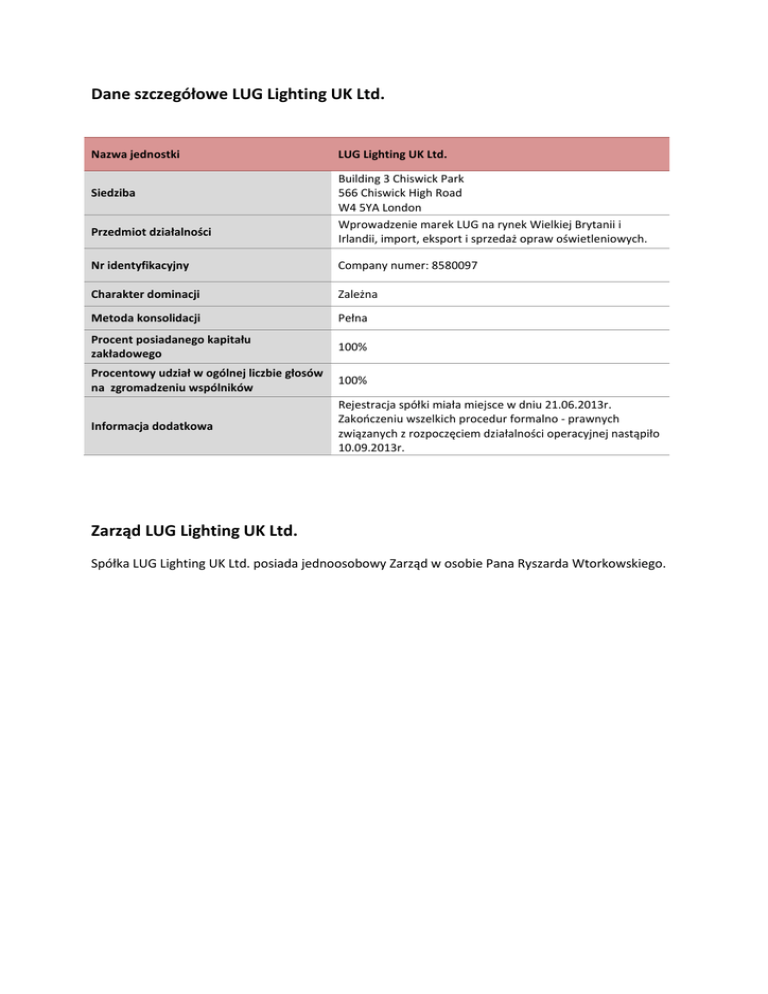 Dane szczegółowe LUG Lighting UK Ltd. Nazwa jednostki Siedziba Przedmiot działalności LUG Lighting UK Ltd. Building 3 Chiswick Park 566 Chiswick High Road W4 5YA London Wprowadzenie marek LUG na rynek Wielkiej Brytanii i Irlandii, import, eksport i sprzedaż opraw oświetleniowych. Nr identyfikacyjny Company numer: 8580097 Charakter dominacji Zależna Metoda konsolidacji Pełna Procent posiadanego kapitału zakładowego 100% Procentowy udział w ogólnej liczbie głosów na zgromadzeniu wspólników 100% Informacja dodatkowa Rejestracja spółki miała miejsce w dniu 21.06.2013r. Zakończeniu wszelkich procedur formalno - prawnych związanych z rozpoczęciem działalności operacyjnej nastąpiło 10.09.2013r. Zarząd LUG Lighting UK Ltd. Spółka LUG Lighting UK Ltd. posiada jednoosobowy Zarząd w osobie Pana Ryszarda Wtorkowskiego.