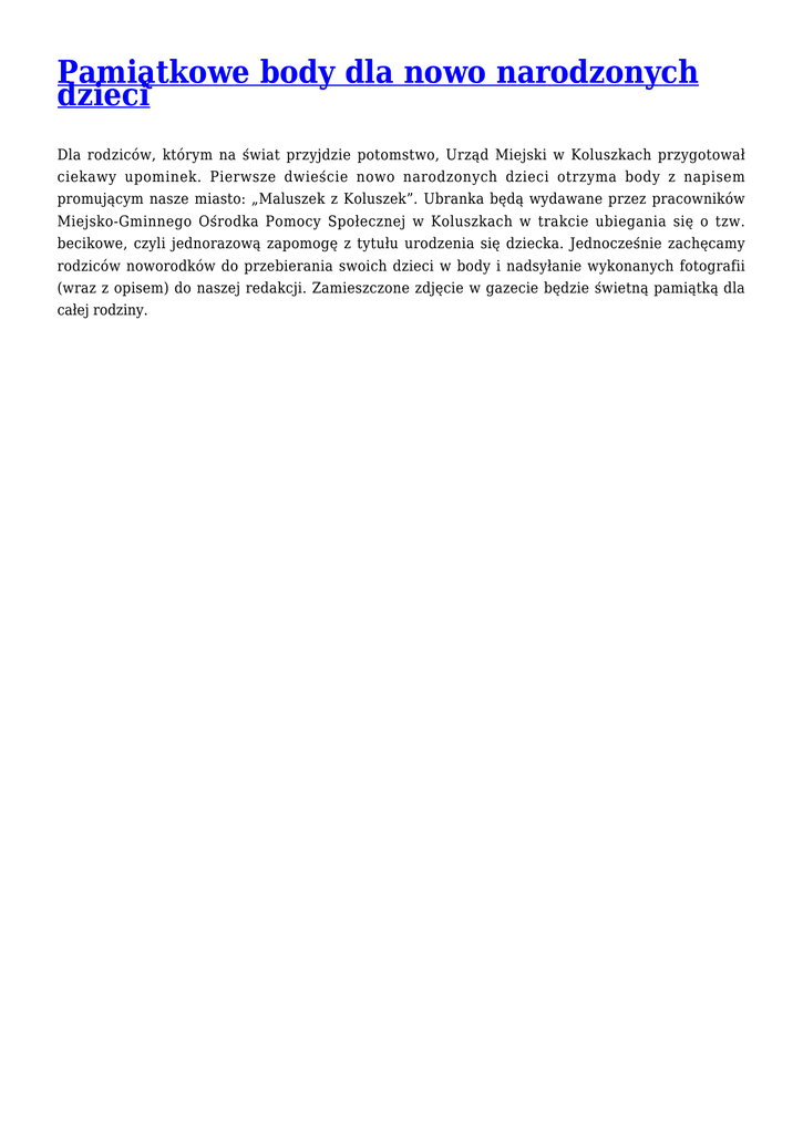 Pamiątkowe body dla nowo narodzonych dzieci Dla rodziców, którym na świat przyjdzie potomstwo, Urząd Miejski w Koluszkach przygotował ciekawy upominek. Pierwsze dwieście nowo narodzonych dzieci otrzyma body z napisem promującym nasze miasto: „Maluszek z Koluszek”. Ubranka będą wydawane przez pracowników Miejsko-Gminnego Ośrodka Pomocy Społecznej w Koluszkach w trakcie ubiegania się o tzw. becikowe, czyli jednorazową zapomogę z tytułu urodzenia się dziecka. Jednocześnie zachęcamy rodziców noworodków do przebierania swoich dzieci w body i nadsyłanie wykonanych fotografii (wraz z opisem) do naszej redakcji. Zamieszczone zdjęcie w gazecie będzie świetną pamiątką dla całej rodziny.