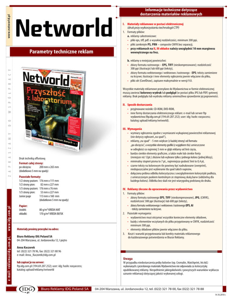 www.networld.pl Informacje techniczne dotyczące dostarczenia materiałów reklamowych Parametry techniczne reklam I.Materiały reklamowe w postaci elektronicznej (druk przy wykorzystaniu technologii CTP) 1. Formaty plików: a .reklamy całostronicowe: • pliki eps, tiff, pdf. o wysokiej rozdzielczości, minimum 300 ppi, • pliki zamknięte PS, PRN – composite CMYK bez separacji, • przy reklamach na II, III okładce należy uwzględnić 10 mm marginesu wewnętrznego na frez. W S P Ó Ł P R A C Y Wszystkie materiały reklamowe przesyłane do Wydawnictwa w formie elektronicznej muszą zawierać kolorowy wydruk lub podgląd (w postaci pliku JPG lub PDF) gotowej reklamy. Brak podglądu lub wydruku reklamy uniemożliwa sprawdzenie jej poprawności. II. Sposób dostarczania • przyjmowane nośniki: CD-ROM, DVD-ROM, • inne formy dostarczania elektronicznego reklam: e-mail lub serwer ftp wydawnictwa (ftp.idg.com.pl (194.69.207.252); user: idg; hasło: easyaccess; katalog: upload/reklamy/networld). D O Z A P R A S Z A M Y w w w.idg.com.pl e -mail: [email protected], b.reklamy o mniejszej powierzchni: • zbiory formatu rastrowego – EPS, TIFF (nieskompresowane); rozdzielczość 300 ppi (ilustracje) lub 600 ppi (teksty), • zbiory formatu wektorowego i wektorowo /rastrowego - EPS; teksty zamienione na krzywe; ilustracje i inne elementy ogłoszenia jawnie włączone do pliku, • pliki cdr (CorelDraw), zapisane maksymalnie w wersji 9.0. Druk techniką offsetową Format całej strony: po obcięciu: 200 mm x 265 mm (dodatkowo 5 mm na spady) Pozostałe formaty: 1/2 strony poziom: 176 mm x 111 mm 1/2 strony pion: 82 mm x 227 mm 1/3 strony poziom: 176 mm x 76 mm 1/3 strony pion: 53 mm x 227 mm Junior page 113 mm x 160 mm (dodatkowo 5 mm na spady) Papier: środek: okładki: 80 g/m2 KREDA MAT 170 g/m2 KREDA BŁYSK Materiały prosimy przesyłać na adres: Biuro Reklamy IDG Poland SA 04-204 Warszawa, ul. Jordanowska 12, I piętro Anna Kaczorek tel: (022) 321 78 96, fax: (022) 321 80 96 e-mail: [email protected] lub zapisać je na serwer: ftp.idg.com.pl (194.69.207.252); user: idg; hasło: easyaccess; katalog: upload/reklamy/networld Biuro Reklamy IDG Poland SA III. Wymagania • wymiary ogłoszenia zgodne z wymiarami wykupionej powierzchni reklamowej (nie dotyczy ogłoszeń „na spad“), • reklamy „na spad“ - 5 mm większe (z każdej strony) od formatu „po obcięciu”, a wszystkie elementy grafiki (z wyjątkiem tła) umieszczone w odległości co najmniej 5 mm w głąb reklamy od linii cięcia, • bardzo cienkie elementy graficzne, a także małe lub cienkie fonty (mniejsze niż 12pt.) złożone lub wybrane tylko z jednego koloru (jednej kliszy), • minimalny stopień pisma to 7 pt., najmniejsza grubość linii to 0,4 pt, • czarne teksty na kolorowym tle powinny być nadrukowane (overprint), niedopuszczalne jest wybieranie tła spod takich napisów, • dołączona próbna odbitka kolorystyczna z uwzględnieniem kolorystyki podłoża, z umieszczonym paskiem kontrolnym ze stopniową skalą barw (oddzielną dla każdego koloru). Odbitka bez skali nie jest wiarygodną podstawą do druku. IV. Reklamy zlecane do opracowania przez wydawnictwo 1. Formaty plików: • zbiory formatu rastrowego EPS, TIFF (nieskompresowane), JPG, (CMYK), rozdzielczość 300 ppi (ilustracje) lub 600 ppi (teksty), • zbiory formatu wektorowego i wektorowo /rastrowego EPS, AI - teksty zamienione na krzywe. 2. Pozostałe wymagania: • wydawnictwo musi otrzymać wszystkie konieczne elementy składowe, • każdy z elementów wczytanych do pliku przygotowany w CMYK, rozdzielczość minimum 300 ppi, • elementy składowe plików jawnie włączone do pliku. 3. Koszt i warunki przygotowania lub korekty materiału reklamowego do każdorazowego potwierdzenia w Biurze Reklamy. Uwaga W przypadku niedostarczenia próby kolorów (np. Cromalin, Matchprint, Iris itd.) wykonanych z przesłanego materiału Wydawnictwo nie odpowiada za kolorystykę opublikowanej reklamy. Niespełnienie jakiegokolwiek z powyższych warunków wyklucza uznanie reklamacji dotyczącej jakości wykonanej usługi. 04-204 Warszawa, ul. Jordanowska 12, tel. (022) 321 78 00, fax (022) 321 78 88 14.10.2010 r.