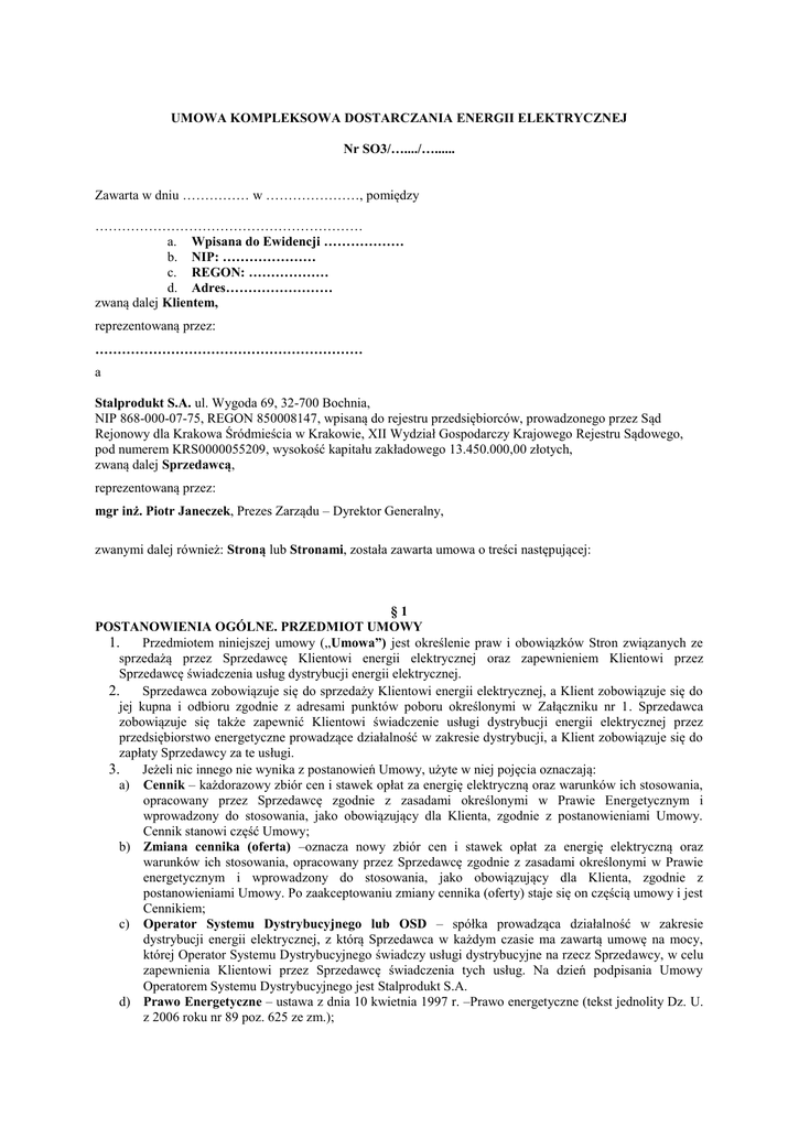 UMOWA KOMPLEKSOWA DOSTARCZANIA ENERGII ELEKTRYCZNEJ Nr SO3/…..../…...... Zawarta w dniu …………… w …………………, pomiędzy …………………………………………………… a. Wpisana do Ewidencji ……………… b. NIP: ………………… c. REGON: ……………… d. Adres…………………… zwaną dalej Klientem, reprezentowaną przez: …………………………………………………… a Stalprodukt S.A. ul. Wygoda 69, 32-700 Bochnia, NIP 868-000-07-75, REGON 850008147, wpisaną do rejestru przedsiębiorców, prowadzonego przez Sąd Rejonowy dla Krakowa Śródmieścia w Krakowie, XII Wydział Gospodarczy Krajowego Rejestru Sądowego, pod numerem KRS0000055209, wysokość kapitału zakładowego 13.450.000,00 złotych, zwaną dalej Sprzedawcą, reprezentowaną przez: mgr inż. Piotr Janeczek, Prezes Zarządu – Dyrektor Generalny, zwanymi dalej również: Stroną lub Stronami, została zawarta umowa o treści następującej: §1 POSTANOWIENIA OGÓLNE. PRZEDMIOT UMOWY 1. Przedmiotem niniejszej umowy („Umowa”) jest określenie praw i obowiązków Stron związanych ze sprzedażą przez Sprzedawcę Klientowi energii elektrycznej oraz zapewnieniem Klientowi przez Sprzedawcę świadczenia usług dystrybucji energii elektrycznej. 2. Sprzedawca zobowiązuje się do sprzedaży Klientowi energii elektrycznej, a Klient zobowiązuje się do jej kupna i odbioru zgodnie z adresami punktów poboru określonymi w Załączniku nr 1. Sprzedawca zobowiązuje się także zapewnić Klientowi świadczenie usługi dystrybucji energii elektrycznej przez przedsiębiorstwo energetyczne prowadzące działalność w zakresie dystrybucji, a Klient zobowiązuje się do zapłaty Sprzedawcy za te usługi. 3. Jeżeli nic innego nie wynika z postanowień Umowy, użyte w niej pojęcia oznaczają: a) Cennik – każdorazowy zbiór cen i stawek opłat za energię elektryczną oraz warunków ich stosowania, opracowany przez Sprzedawcę zgodnie z zasadami określonymi w Prawie Energetycznym i wprowadzony do stosowania, jako obowiązujący dla Klienta, zgodnie z postanowieniami Umowy. Cennik stanowi część Umowy; b) Zmiana cennika (oferta) –oznacza nowy zbiór cen i stawek opłat za energię elektryczną oraz warunków ich stosowania, opracowany przez Sprzedawcę zgodnie z zasadami określonymi w Prawie energetycznym i wprowadzony do stosowania, jako obowiązujący dla Klienta, zgodnie z postanowieniami Umowy. Po zaakceptowaniu zmiany cennika (oferty) staje się on częścią umowy i jest Cennikiem; c) Operator Systemu Dystrybucyjnego lub OSD – spółka prowadząca działalność w zakresie dystrybucji energii elektrycznej, z którą Sprzedawca w każdym czasie ma zawartą umowę na mocy, której Operator Systemu Dystrybucyjnego świadczy usługi dystrybucyjne na rzecz Sprzedawcy, w celu zapewnienia Klientowi przez Sprzedawcę świadczenia tych usług. Na dzień podpisania Umowy Operatorem Systemu Dystrybucyjnego jest Stalprodukt S.A. d) Prawo Energetyczne – ustawa z dnia 10 kwietnia 1997 r. –Prawo energetyczne (tekst jednolity Dz. U. z 2006 roku nr 89 poz. 625 ze zm.); Produkt – energia elektryczna, którą Sprzedawca dostarcza Klientowi na zasadach określonych w Cenniku; f) Rozporządzenie – Rozporządzenie Ministra Gospodarki z dnia 04 maja 2007 roku w sprawie szczegółowych warunków funkcjonowania systemu elektroenergetycznego (Dz. U. nr 93 poz. 623) bądź inny akt prawny wydany w jego zastępstwie; g) Taryfa Sprzedawcy-każdorazowy zbiór cen i stawek opłat oraz warunków ich stosowania opracowany przez Sprzedawcę i zatwierdzony decyzją Prezesa Zarządu Sprzedawcy oraz wprowadzony do stosowania zgodnie z postanowieniami Prawa energetycznego. Taryfa stanowi część Umowy; h) Taryfa OSD – zbiór cen i stawek opłat oraz warunków ich stosowania opracowany przez Operatora Systemu Dystrybucyjnego i wprowadzony do stosowania, jako obowiązujący dla określonych w nim odbiorców, po zatwierdzeniu go decyzją Prezesa Urzędu Regulacji Energetyki. i) Rozliczenie prognozowane – wielkość zużycia oszacowana przez Sprzedawcę na podstawie średniodobowej ilości energii elektrycznej zmierzonej przez układ pomiarowy w poprzednim okresie rozliczeniowym pomnożona przez liczbę dni okresu, którego dotyczy rozliczenie (uwzględniająca sezonowość poboru energii elektrycznej). Jeżeli nie można ustalić średniodobowego zużycia energii, ilość ta jest wyliczania w oparciu o maksymalną moc przyłączeniową układu pomiaroworozliczeniowego, dla którego następuje rozliczenie ryczałtowe. j) Prezes URE – Prezes Urzędu Regulacji Energetyki; 4. Umowa została zawarta na podstawie Prawa energetycznego oraz aktów wykonawczych do tej ustawy. 5. W przypadku, gdy Sprzedawca będzie zobowiązany do dokonywania rozliczeń z Klientem na podstawie Taryfy, odniesienia w Umowie do Cennika będą uważane za odniesienia do Taryfy. 6. W związku z tym, że usługi w zakresie dystrybucji energii elektrycznej, do których zapewnienia Sprzedawca jest zobowiązany na mocy Umowy, świadczone będą przez OSD, do wykonywania czynności związanych z dystrybucją i dostarczaniem energii elektrycznej do Klienta, utrzymywaniem sieci i instalacji w należytym stanie (w zakresie, w jakim obciąża to Sprzedawcę lub OSD) lub z kontrolą wykonywania Umowy, uprawniony jest również OSD lub jego upoważnieni przedstawiciele, bez konieczności uzyskiwania odrębnego upoważnienia Sprzedawcy lub zgody Klienta. Powyższe upoważnienie dotyczy w szczególności: a) instalacji lub wybudowy układu pomiarowo-rozliczeniowego; b) kontroli układu pomiarowo-rozliczeniowego, jego stanu technicznego i prawidłowości działania; c) kontroli danych przyjętych do rozliczeń z Klientem za dostarczaną energię elektryczną i świadczone usługi dystrybucyjne; d) kontroli dotrzymywania warunków Umowy; e) wykonywania czynności umożliwiających Klientowi bezpieczne wykonanie prze