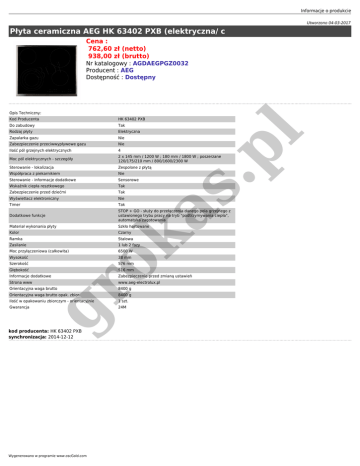 Informacje o produkcie Utworzono 04-03-2017 Płyta ceramiczna AEG HK 63402 PXB (elektryczna/ c Cena : 762,60 zł (netto) 938,00 zł (brutto) Nr katalogowy : AGDAEGPGZ0032 Producent : AEG Dostępność : Dostępny Opis Techniczny: HK 63402 PXB Do zabudowy Tak Rodzaj płyty Elektryczna Zapalarka gazu Nie Zabezpieczenie przeciwwypływowe gazu Nie Ilość pól grzejnych elektrycznych 4 Moc pól elektrycznych - szczegóły 2 x 145 mm / 1200 W ; 180 mm / 1800 W ; poszerzane 120/175/210 mm / 800/1600/2300 W Sterowanie - lokalizacja Zespolone z płytą Współpraca z piekarnikiem Nie Sterowanie - informacje dodatkowe Sensorowe Wskaźnik ciepła resztkowego Tak Zabezpieczenie przed dziećmi Tak Wyświetlacz elektroniczny Nie Timer Tak Dodatkowe funkcje STOP + GO - służy do przełączenia danego pola grzejnego z ustawionego trybu pracy na tryb "podtrzymywania ciepła", automatyka zagotowania Materiał wykonania płyty Szkło hartowane Kolor Czarny as ok Ramka .p l Kod Producenta Stalowa Zasilanie Moc przyłączeniowa (całkowita) Wysokość Szerokość Głębokość Informacje dodatkowe Strona www 6500 W 38 mm 576 mm 516 mm Zabezpieczenie przed zmianą ustawień www.aeg-electrolux.pl 8400 g gr Orientacyjna waga brutto 1 lub 2 fazy Orientacyjna waga brutto opak. zbior. 8400 g Ilość w opakowaniu zbiorczym - orientacyjnie 1 szt. Gwarancja 24M kod producenta: HK 63402 PXB synchronizacja: 2014-12-12 Wygenerowano w programie www.oscGold.com