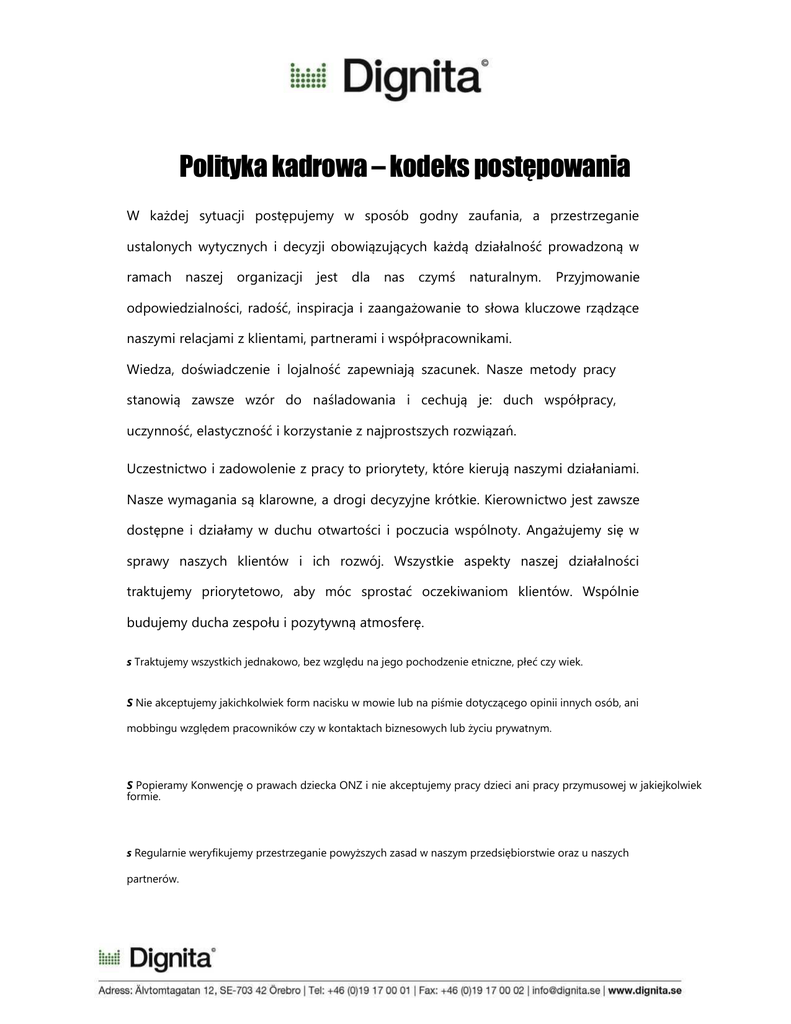 Polityka kadrowa – kodeks postępowania W każdej sytuacji postępujemy w sposób godny zaufania, a przestrzeganie ustalonych wytycznych i decyzji obowiązujących każdą działalność prowadzoną w ramach naszej organizacji jest dla nas czymś naturalnym. Przyjmowanie odpowiedzialności, radość, inspiracja i zaangażowanie to słowa kluczowe rządzące naszymi relacjami z klientami, partnerami i współpracownikami. Wiedza, doświadczenie i lojalność zapewniają szacunek. Nasze metody pracy stanowią zawsze wzór do naśladowania i cechują je: duch współpracy, uczynność, elastyczność i korzystanie z najprostszych rozwiązań. Uczestnictwo i zadowolenie z pracy to priorytety, które kierują naszymi działaniami. Nasze wymagania są klarowne, a drogi decyzyjne krótkie. Kierownictwo jest zawsze dostępne i działamy w duchu otwartości i poczucia wspólnoty. Angażujemy się w sprawy naszych klientów i ich rozwój. Wszystkie aspekty naszej działalności traktujemy priorytetowo, aby móc sprostać oczekiwaniom klientów. Wspólnie budujemy ducha zespołu i pozytywną atmosferę. s Traktujemy wszystkich jednakowo, bez względu na jego pochodzenie etniczne, płeć czy wiek. S Nie akceptujemy jakichkolwiek form nacisku w mowie lub na piśmie dotyczącego opinii innych osób, ani mobbingu względem pracowników czy w kontaktach biznesowych lub życiu prywatnym. S Popieramy Konwencję o prawach dziecka ONZ i nie akceptujemy pracy dzieci ani pracy przymusowej w jakiejkolwiek formie. s Regularnie weryfikujemy przestrzeganie powyższych zasad w naszym przedsiębiorstwie oraz u naszych partnerów.