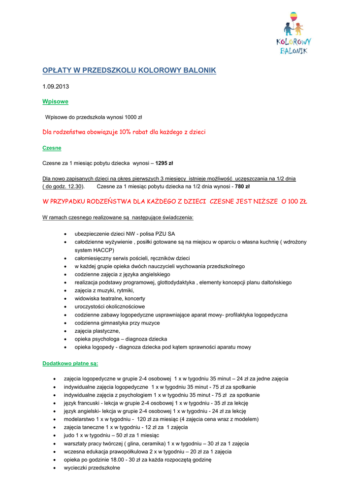 OPŁATY W PRZEDSZKOLU KOLOROWY BALONIK 1.09.2013 Wpisowe Wpisowe do przedszkola wynosi 1000 zł Dla rodzeństwa obowiązuje 10% rabat dla każdego z dzieci Czesne Czesne za 1 miesiąc pobytu dziecka wynosi – 1295 zł Dla nowo zapisanych dzieci na okres pierwszych 3 miesięcy istnieje możliwość uczęszczania na 1/2 dnia ( do godz. 12.30). Czesne za 1 miesiąc pobytu dziecka na 1/2 dnia wynosi - 780 zł W PRZYPADKU RODZEŃSTWA DLA KAŻDEGO Z DZIECI CZESNE JEST NIŻSZE O 100 ZŁ W ramach czesnego realizowane są następujące świadczenia: ubezpieczenie dzieci NW - polisa PZU SA całodzienne wyżywienie , posiłki gotowane są na miejscu w oparciu o własna kuchnię ( wdrożony system HACCP) całomiesięczny serwis pościeli, ręczników dzieci w każdej grupie opieka dwóch nauczycieli wychowania przedszkolnego codzienne zajęcia z języka angielskiego realizacja podstawy programowej, glottodydaktyka , elementy koncepcji planu daltońskiego zajęcia z muzyki, rytmiki, widowiska teatralne, koncerty uroczystości okolicznościowe codzienne zabawy logopedyczne usprawniające aparat mowy- profilaktyka logopedyczna codzienna gimnastyka przy muzyce zajęcia plastyczne, opieka psychologa – diagnoza dziecka opieka logopedy - diagnoza dziecka pod kątem sprawności aparatu mowy Dodatkowo płatne są: zajęcia logopedyczne w grupie 2-4 osobowej 1 x w tygodniu 35 minut – 24 zł za jedne zajęcia indywidualne zajęcia logopedyczne 1 x w tygodniu 35 minut - 75 zł za spotkanie indywidualne zajęcia z psychologiem 1 x w tygodniu 35 minut - 75 zł za spotkanie język francuski - lekcja w grupie 2-4 osobowej 1 x w tygodniu - 35 zł za lekcję język angielski- lekcja w grupie 2-4 osobowej 1 x w tygodniu - 24 zł za lekcję modelarstwo 1 x w tygodniu - 120 zł za miesiąc (4 zajęcia cena wraz z modelem) zajęcia taneczne 1 x w tygodniu - 12 zł za 1 zajęcia judo 1 x w tygodniu – 50 zł za 1 miesiąc warsztaty pracy twórczej ( glina, ceramika) 1 x w tygodniu – 30 zł za 1 zajęcia wczesna edukacja prawopółkulowa 2 x w tygodniu – 20 zł za 1 zajęcia opieka po godzinie 18.00 - 30 zł za każda rozpoczętą godzinę wycieczki przedszkolne