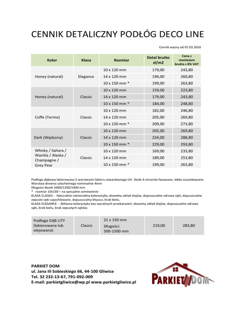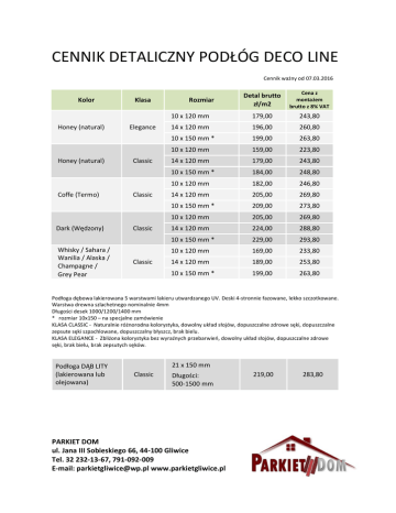 CENNIK DETALICZNY PODŁÓG DECO LINE Cennik ważny od 07.03.2016 Kolor Honey (natural) Honey (natural) Coffe (Termo) Dark (Wędzony) Whisky / Sahara / Wanilia / Alaska / Champagne / Grey Pear Klasa Elegance Classic Classic Classic Classic Detal brutto zł/m2 Cena z montażem brutto z 8% VAT 10 x 120 mm 179,00 243,80 14 x 120 mm 196,00 260,80 10 x 150 mm * 199,00 263,80 10 x 120 mm 159,00 223,80 14 x 120 mm 179,00 243,80 10 x 150 mm * 184,00 248,80 10 x 120 mm 182,00 246,80 14 x 120 mm 205,00 269,80 10 x 150 mm * 209,00 273,80 10 x 120 mm 205,00 269,80 14 x 120 mm 224,00 288,80 10 x 150 mm * 229,00 293,80 10 x 120 mm 169,00 233,80 14 x 120 mm 189,00 253,80 10 x 150 mm * 199,00 263,80 Rozmiar Podłoga dębowa lakierowana 5 warstwami lakieru utwardzanego UV. Deski 4-stronnie fazowane, lekko szczotkowane. Warstwa drewna szlachetnego nominalnie 4mm Długości desek 1000/1200/1400 mm * rozmiar 10x150 – na specjalne zamówienie KLASA CLASSIC - Naturalnie różnorodna kolorystyka, dowolny układ słojów, dopuszczalne zdrowe sęki, dopuszczalne zepsute sęki szpachlowane, dopuszczalny błyszcz, brak bielu. KLASA ELEGANCE - Zbliżona kolorystyka bez wyraźnych przebarwień, dowolny układ słojów, dopuszczalne zdrowe sęki, brak bielu, brak zepsutych sęków. Podłoga DĄB LITY (lakierowana lub olejowana) 21 x 150 mm Classic Długości: 500-1500 mm PARKIET DOM ul. Jana III Sobieskiego 66, 44-100 Gliwice Tel. 32 232-13-67, 791-092-009 E-mail: [email protected] www.parkietgliwice.pl 219,00 283,80