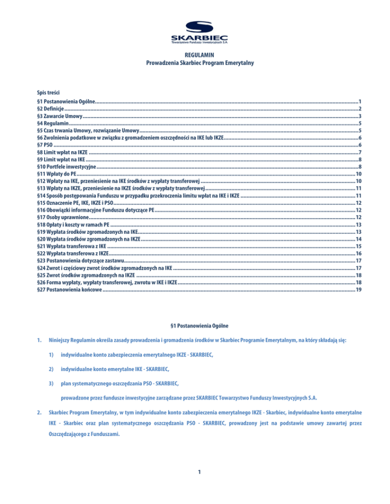 REGULAMIN Prowadzenia Skarbiec Program Emerytalny Spis treści §1 Postanowienia Ogólne............................................................................................................................................................................ 1 §2 Definicje ................................................................................................................................................................................................ 2 §3 Zawarcie Umowy .................................................................................................................................................................................... 3 §4 Regulamin ............................................................................................................................................................................................. 5 §5 Czas trwania Umowy, rozwiązanie Umowy ............................................................................................................................................... 5 §6 Zwolnienia podatkowe w związku z gromadzeniem oszczędności na IKE lub IKZE........................................................................................ 6 §7 PSO ....................................................................................................................................................................................................... 6 §8 Limit wpłat na IKZE ................................................................................................................................................................................ 7 §9 Limit wpłat na IKE .................................................................................................................................................................................. 8 §10 Portfele inwestycyjne ........................................................................................................................................................................... 8 §11 Wpłaty do PE ...................................................................................................................................................................................... 10 §12 Wpłaty na IKE, przeniesienie na IKE środków z wypłaty transferowej ..................................................................................................... 10 §13 Wpłaty na IKZE, przeniesienie na IKZE środków z wypłaty transferowej .................................................................................................. 11 §14 Sposób postępowania Funduszu w przypadku przekroczenia limitu wpłat na IKE i IKZE ........................................................................... 11 §15 Oznaczenie PE, IKE, IKZE i PSO .............................................................................................................................................................. 12 §16 Obowiązki informacyjne Funduszu dotyczące PE ................................................................................................................................... 12 §17 Osoby uprawnione.............................................................................................................................................................................. 12 §18 Opłaty i koszty w ramach PE ................................................................................................................................................................ 13 §19 Wypłata środków zgromadzonych na IKE.............................................................................................................................................. 13 §20 Wypłata środków zgromadzonych na IKZE ............................................................................................................................................ 14 §21 Wypłata transferowa z IKE .................................................................................................................................................................. 15 §22 Wypłata transferowa z IKZE................................................................................................................................................................. 16 §23 Postanowienia dotyczące zastawu....................................................................................................................................................... 17 §24 Zwrot i częściowy zwrot środków zgromadzonych na IKE ....................................................................................................................... 17 §25 Zwrot środków zgromadzonych na IKZE ............................................................................................................................................... 18 §26 Forma wypłaty, wypłaty transferowej, zwrotu w IKE i IKZE .................................................................................................................... 18 §27 Postanowienia końcowe ..................................................................................................................................................................... 19 §1 Postanowienia Ogólne 1. Niniejszy Regulamin określa zasady prowadzenia i gromadzenia środków w Skarbiec Programie Emerytalnym, na który składają się: 1) indywidualne konto zabezpieczenia emerytalnego IKZE - SKARBIEC, 2) indywidualne konto emerytalne IKE - SKARBIEC, 3) plan systematycznego oszczędzania PSO - SKARBIEC, prowadzone przez fundusze inwestycyjne zarządzane przez SKARBIEC Towarzystwo Funduszy Inwestycyjnych S.A. 2. Skarbiec Program Emerytalny, w tym indywidualne konto zabezpieczenia emerytalnego IKZE - Skarbiec, indywidualne konto emerytalne IKE - Skarbiec oraz plan systematycznego oszczędzania PSO - SKARBIEC, prowadzony jest na podstawie umowy zawartej przez Oszczę