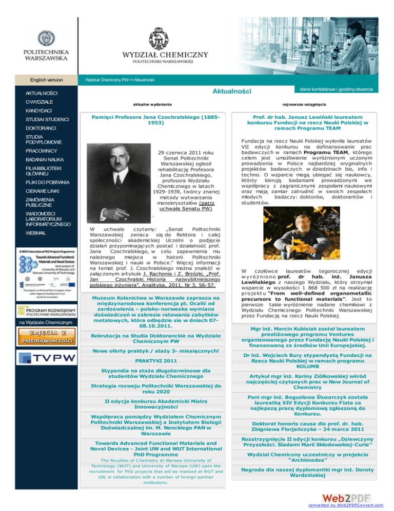 English version Wydział Chemiczny PW >> Aktualności Aktualności AKTUALNOŚCI O WYDZIALE aktualne wydarzenia dane kontaktowe i godziny otwarcia najnowsze osiągnięcia KANDYDACI STUDIAI STUDENCI Pamięci Profesora Jana Czochralskiego (18851953) DOKTORANCI STUDIA PODYPLOMOWE PRACOWNICY BADANIAI NAUKA FILIABIBLIOTEKI GŁÓWNEJ PLIKI DO POBRANIA CIEKAWE LINKI ZAMÓWIENIA PUBLICZNE WIADOMOŚCI LABORATORIUM INFORMATYCZNEGO WEBMAIL na Wydziale Chemicznym 29 czerwca 2011 roku Senat Politechniki Warszawskiej ogłosił rehabilitację Profesora Jana Czochralskiego, profesora Wydziału Chemicznego w latach 1929-1939, twórcy znanej metody wytwarzania monokryształów (patrz uchwała Senatu PW) . W uchwale czytamy: „Senat Politechniki Warszawskiej zwraca się do Rektora i całej społeczności akademickiej Uczelni o podjęcie działań przypominających postać i działalność prof. Jana Czochralskiego, w celu zapewnienia mu należnego miejsca w historii Politechniki Warszawskiej i nauki w Polsce.” Więcej informacji na temat prof. J. Czochralskiego można znaleźć w załączonym artykule J. Rachonia i Z. Brzózki, „Prof. Jan Czochralski. Historia najwybitniejszego polskiego inżyniera”, Analityka, 2011, Nr 3, 56-57. Muzeum Kolenictwa w Warszawie zaprasza na międzynarodowa konferencja pt. Ocalić od zardzewienia – polsko-norweska wymiana doświadczeń w zakresie ratowania zabytków metalowych, która odbędzie sie w dniach 0708.10.2011. Rekrutacja na Studia Doktoranckie na Wydziale Chemicznym PW Nowe oferty praktyk / staży 3- miesięcznych! PRAKTYKI 2011 Stypendia na staże długoterminowe dla studentów Wydziału Chemicznego Strategia rozwoju Politechniki Warszawskiej do roku 2020 II edycja konkursu Akademicki Mistrz Innowacyjności Współpraca pomiędzy Wydziałem Chemicznym Politechniki Warszawskiej a Instytutem Biologii Doświadczalnej im. M. Nenckiego PAN w Warszawie Towards Advanced Functional Materials and Novel Devices - Joint UW and WUT International PhD Programme The Faculties of C hemistry at Warsaw University of Technology (WUT) and University of Warsaw (UW) open the recruitment for PhD projects that will be realized at WUT and UW, in collaboration with a number of foreign partner institutions. Prof. dr hab. Janusz Lewiński laureatem konkursu Fundacji na rzecz Nauki Polskiej w ramach Programu TEAM Fundacja na rzecz Nauki Polskiej wyłoniła laureatów VII edycji konkursu na dofinansowanie prac badawczych w ramach Programu TEAM, którego celem jest umożliwienie wyróżnionym uczonym prowadzenia w Polsce najbardziej oryginalnych projektów badawczych w dziedzinach bio, info i techno. O wsparcie mogą ubiegać się naukowcy, którzy kierują badaniami prowadzonymi we współpracy z zagranicznymi zespołami naukowymi oraz mają zamiar zatrudnić w swoich zespołach młodych badaczy: doktorów, doktorantów i studentów. W czołówce laureatów tegorocznej edycji w y ró ż nio no prof. dr hab. inż. Janusza Lewińskiego z naszego Wydziału, który otrzymał wsparcie w wysokości 1 868 500 zł na realizację proje kt u "From well-defined organometallic precursors to functional materials". Jest to pierwsze takie wyróżnienie nadane chemikowi z Wydziału Chemicznego Politechniki Warszawskiej przez Fundację na rzecz Nauki Polskiej. Mgr inż. Marcin Kubisiak został laureatem prestiżowego programu Ventures organizowanego przez Fundację Nauki Polskiej i finansowaną ze środków Unii Europejskiej. Dr inż. Wojciech Bury stypendystą Fundacji na Rzecz Nauki Polskiej w ramach programu KOLUMB Artykuł mgr inż. Kariny Ziółkowskiej wśród najczęściej czytanych prac w New Journal of Chemistry Pani mgr inż. Bogusława Ślusarczyk została laureatką XIV Edycji Konkursu Fiata za najlepszą pracę dyplomową zgłoszoną do Konkursu. Doktorat honoris causa dla prof. dr. hab. Zbigniewa Florjańczyka – 24 marca 2011 Rozstrzygnięcie II edycji konkursu „Dziewczyny Przyszłości. Śladami Marii Skłodowskiej-Curie” Wydział Chemiczny uczestniczy w projekcie “Archimedes” Nagroda dla naszej dyplomantki mgr inż. Doroty Wardzińskiej converted by Web2PDFConvert.com Informacja o zakończeniu inwestycji Termomodernizacja Gmachu Technologii Chemicznej Harmonogram zajęć na rok 2010/2011 Księgarnie Akademickie zapraszają ej Dyplomantka naszego wydziału mgr inż. Dorota Wardzińska otrzymała I nagrodę za pracę magisterską „Wpływ azotanu(III) wapnia na korozję stali w roztworach symulujących środowisko korozyjne betonu skarbonatyzowanego” w konkursie Polskiego Stowarzyszenia Korozyjnego na najlepsza pracę dyplomową w dziedzinie ochrony przed korozją w roku 2010. Praca została wykonana pod kierunkiem dr inż. Andrzeja Królikowskiego. Wręczenie nagrody nastąpiło podczas Dorocznej Konferencji Polskiego Stowarzyszenia Korozyjnego „Współczesne Technologie Przeciwkorozyjne” w Smardzewicach k. Tomaszowa w dniach 11-13 kwietnia 2011 r., gdzie laureatka (na zdjęciu w środku) przedstawiła referat. Pani Dorocie Wardzińskiej gratulujemy nagrody i życzymy sukcesów w pracy zawodowej. ej Dyplomantka naszego wydziału mgr inż. Dorota Wardzińska otrzymała I nagrodę za pracę magisterską „Wpływ azotanu(III) wapnia na korozję stali w roztworach symulujących środowisko korozyjne betonu skarbonatyzowanego” w konkursie Polskiego Stowarzyszenia Korozyjnego na najlepsza pracę dyplomową w dziedzinie ochrony przed korozją w roku 2010. Praca została wykonana pod kierunkiem dr inż. Andrzeja Królikowskiego. Wręczenie nagrody nastąpiło podczas Dorocznej Konferencji Polskiego Stowarzyszenia Korozyjnego „Współczesne Technologie Przeciwkorozyjne” w Smardzewicach k. Tomaszowa w dniach 11-13 kwietnia 2011 r., gdzie laureatka (na zdjęciu w środku) przedstawiła referat. Pani Dorocie Wardzińskiej gratulujemy nagrody i życzymy sukcesów w pracy zawodowej. ej Dyplomantka naszego wydziału mgr inż. Dorota Wardzińska otrzymała I nagrodę za pracę mag
